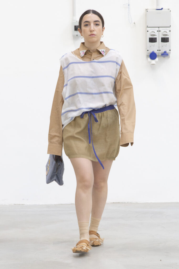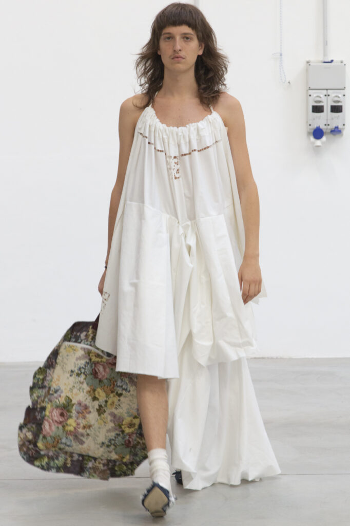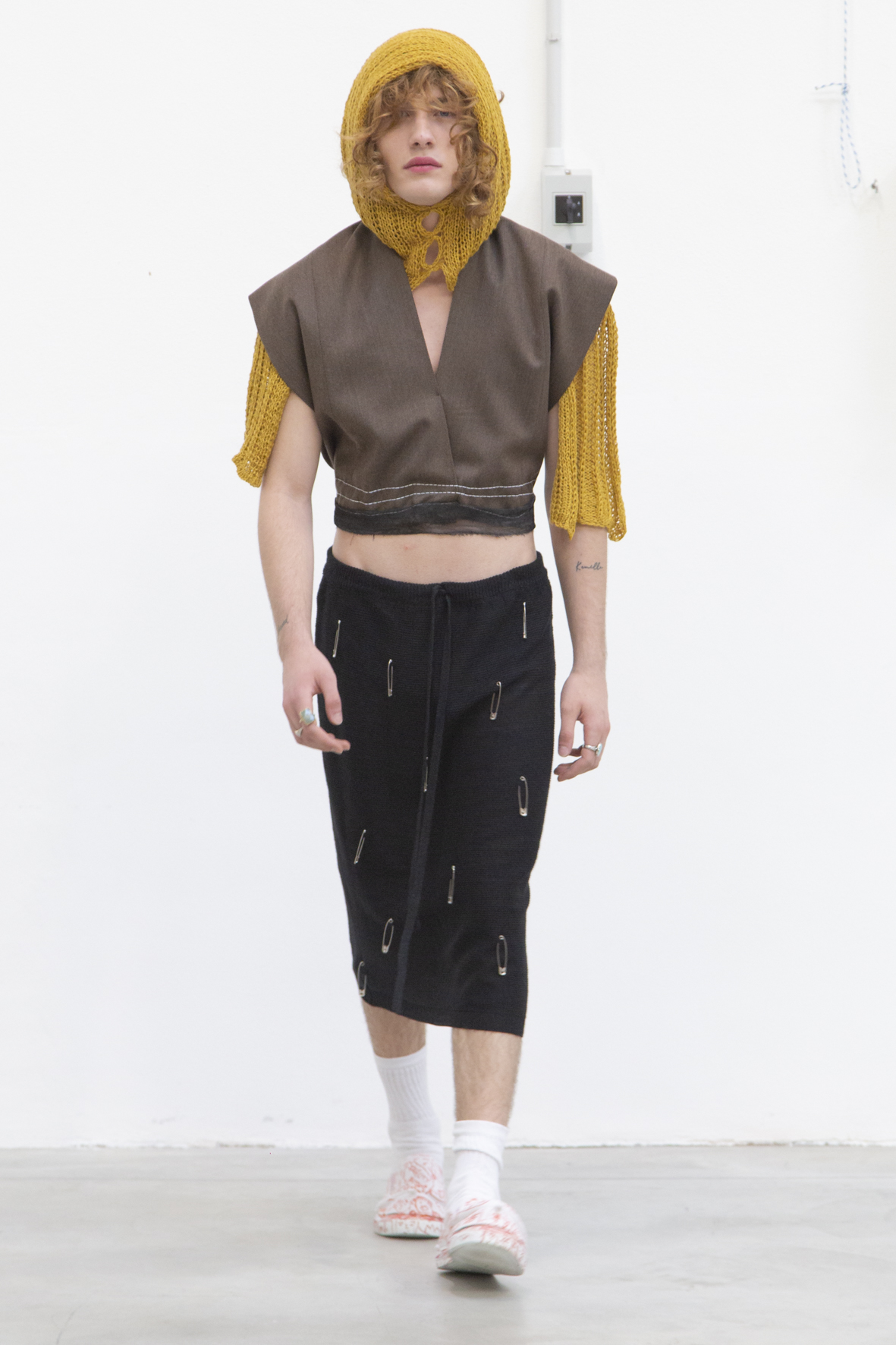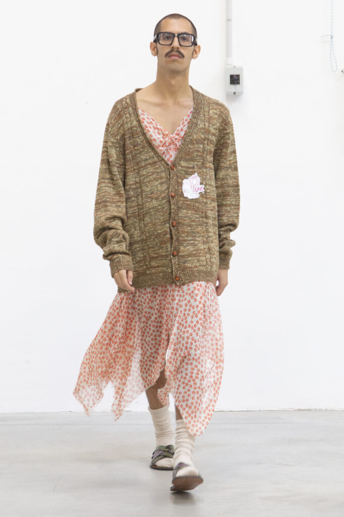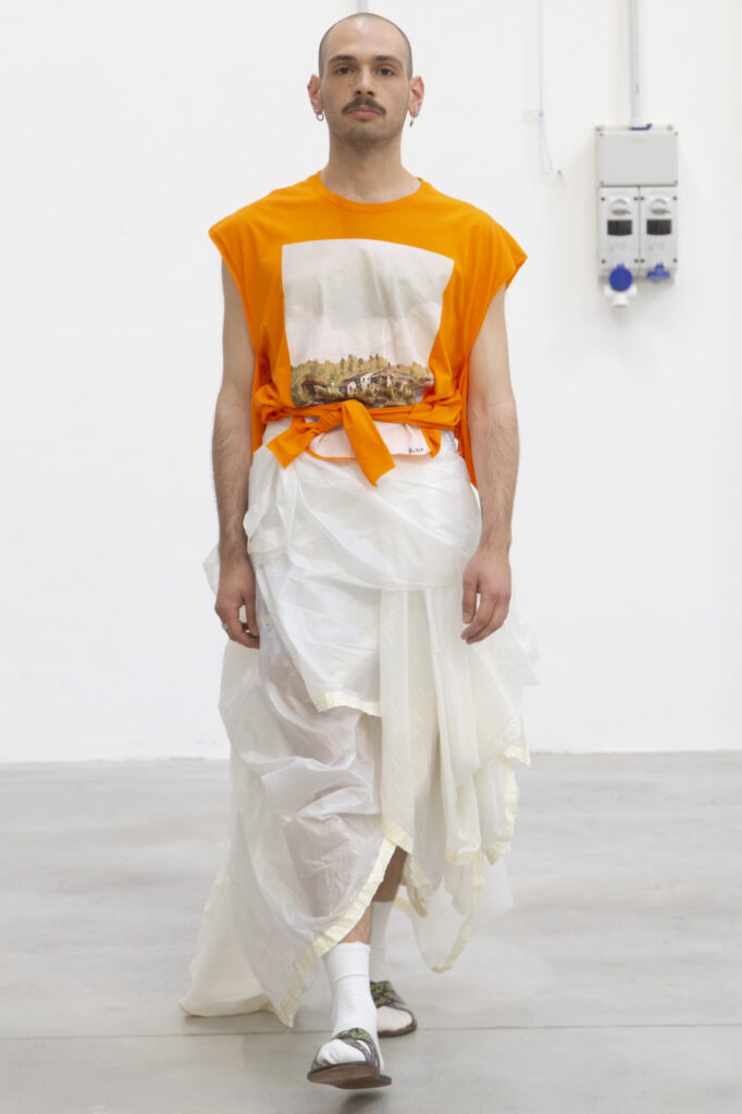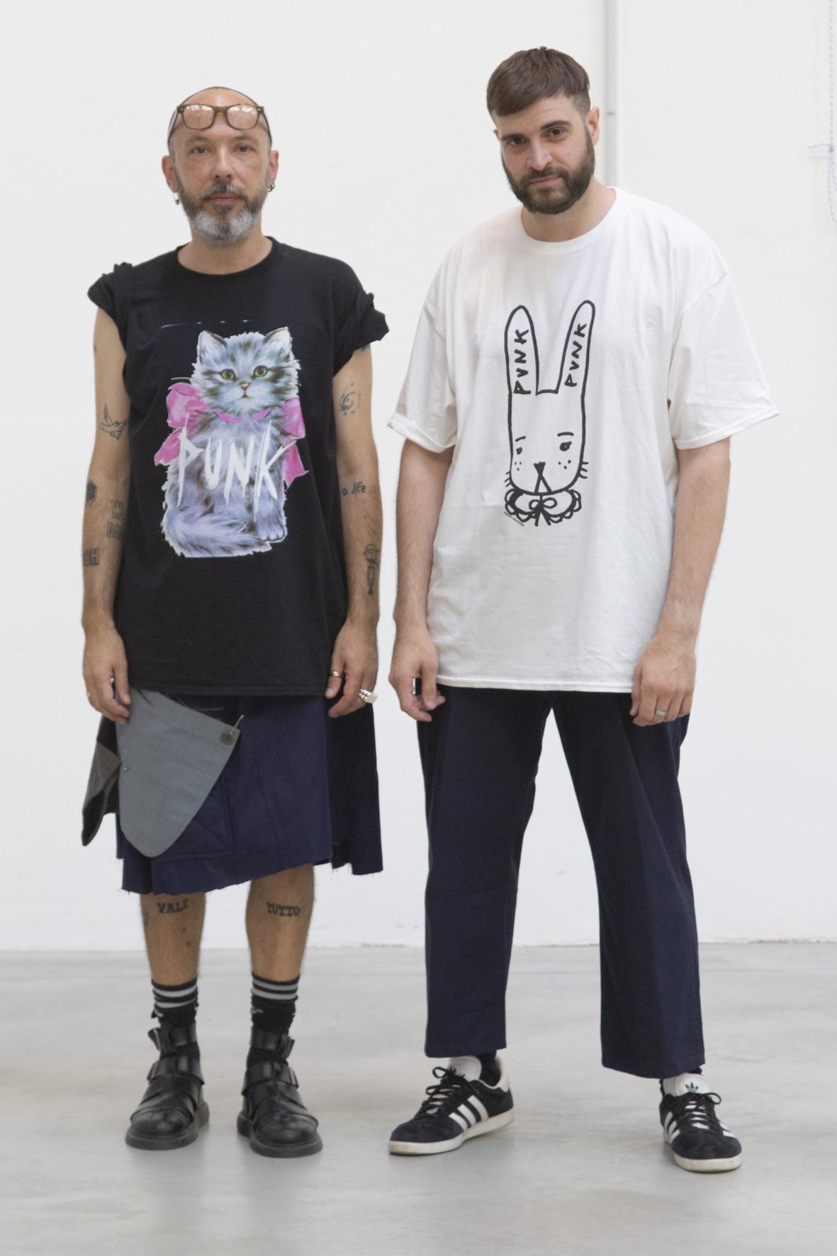 Reality bites is a movie from the 90’s. We live in an age where the bites of reality afflict the entire planet and we decided to talk about it in our own way. The collection does not really have much to do with the movie, aside a couple of 90’s inspired looks, but it reflects our path and experiences in creating this collection: the difficulties of being an ‘independent ’brand in today’s fashion world, dominated by cynicism and marketing strategies, so far away from what happens in the streets. We deepened our “punkindness” concept (kind punk which is more effective than violent punk) by mixing a raw aesthetic made of industrial sewings, safety pins, unfinished hems and graffiti with a more gentle and naive one made by embroidery, ruffles, hand written fabrics that look like children notebooks, hand printed apples made with a real apple and a color that smells like the fruit itself. The final result is what’s between the Sex Pistols and Holly Hobbies. Aside from the ‘bites’, realness is the other key word. Everything in the collection is ‘real’, starting from the deadstock upcyled garments and leftover fabrics to the choice of the models, all friends and fans of the brand that complete the styling with the accessories that they use every day to define their true identity. Our story talks about difficulties and enthusiasm: a challenge to do the best with what we have. It’s when you have scarce means that creativity gains a main role. MATERIALS Old cotton and linen bedsheets Upcycled classical men’s shirts turned into notebooks garments Old parachutes Knitwear made with discarded wool, cotton and silk yarns Recycled jersey garments decorated with an industrial sewing machine Wrong embroideries with the collection messages Broken and rebuilt up cycled tailoring