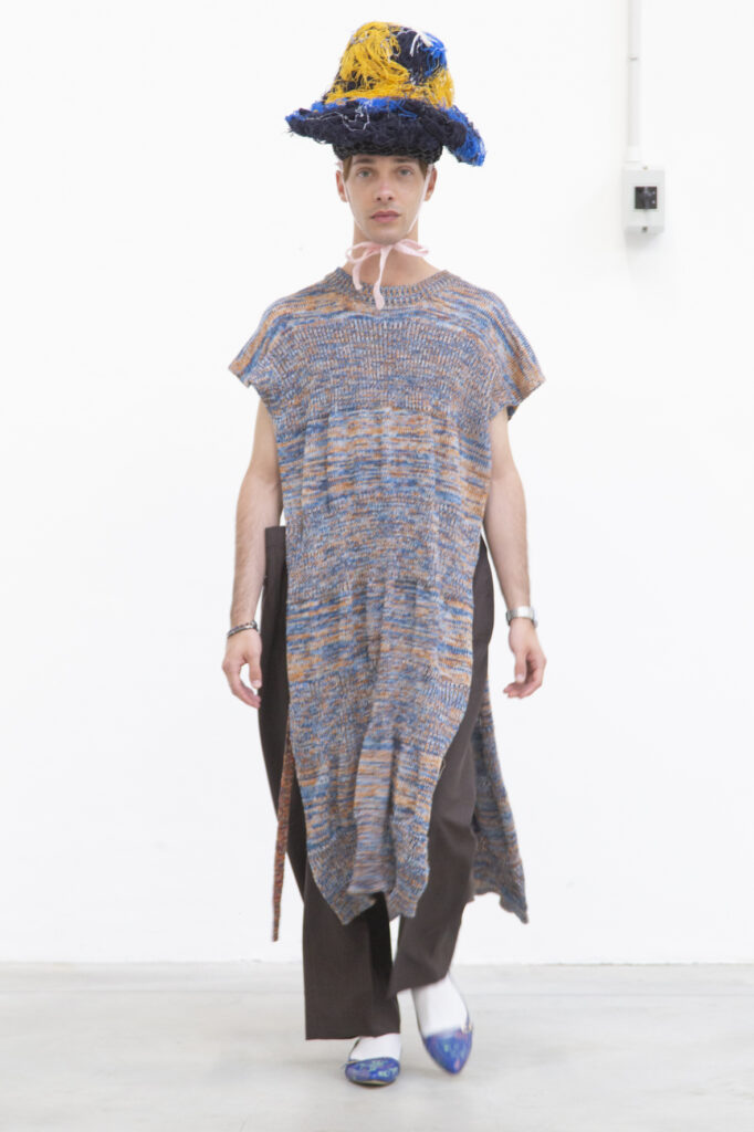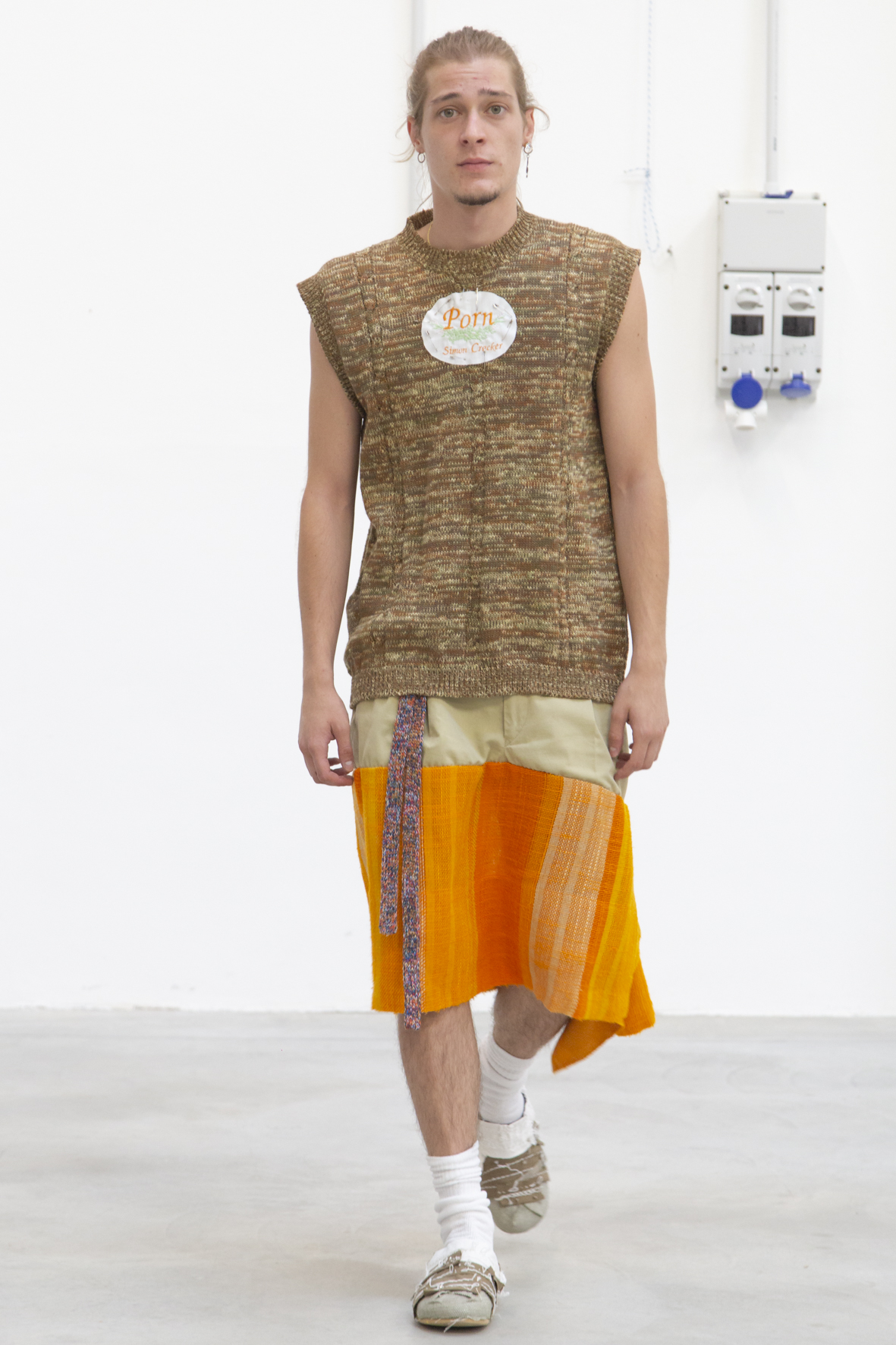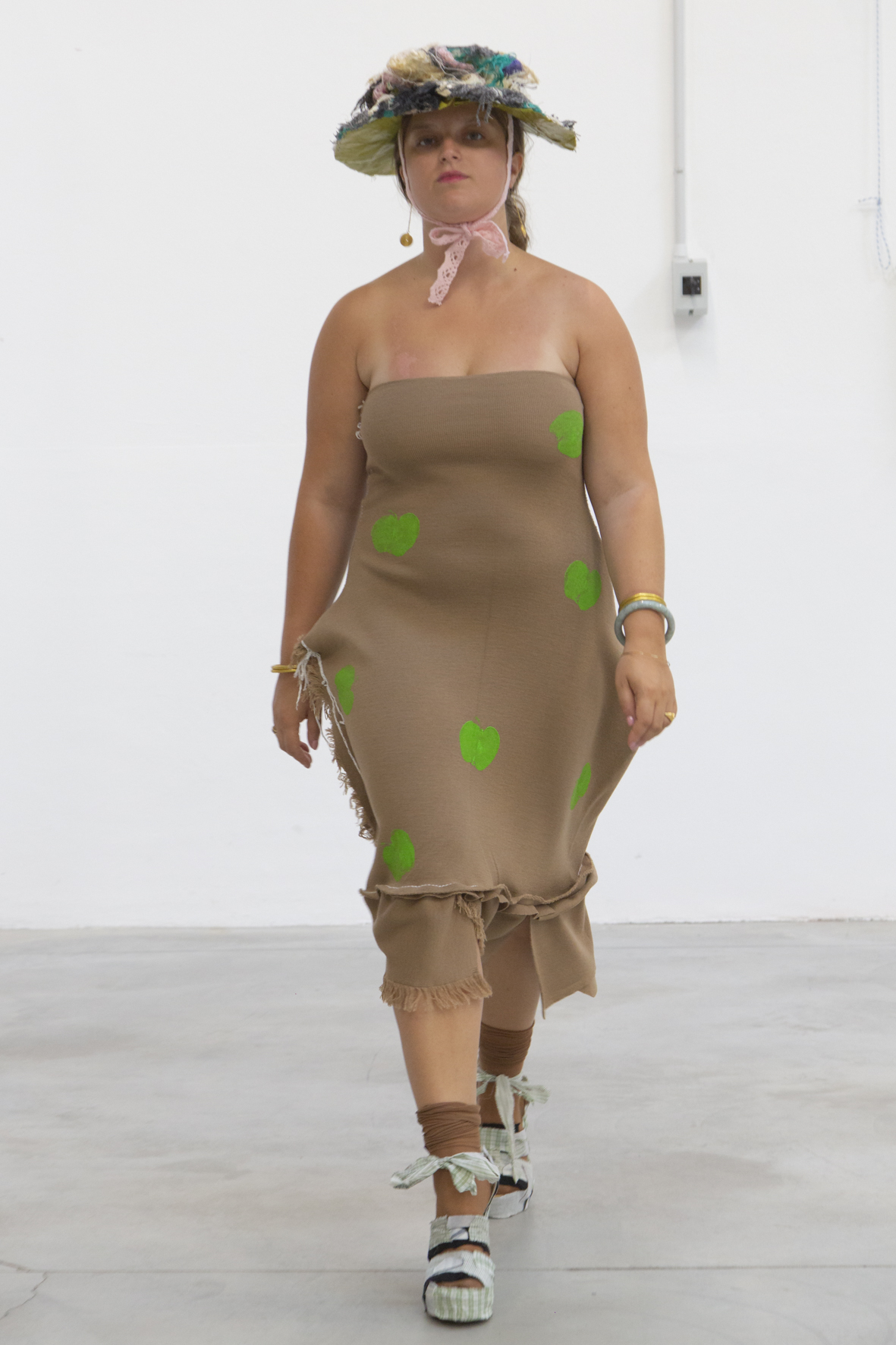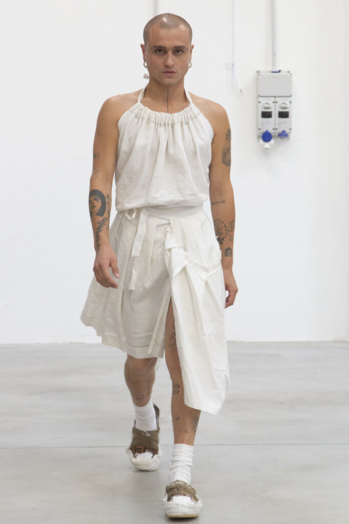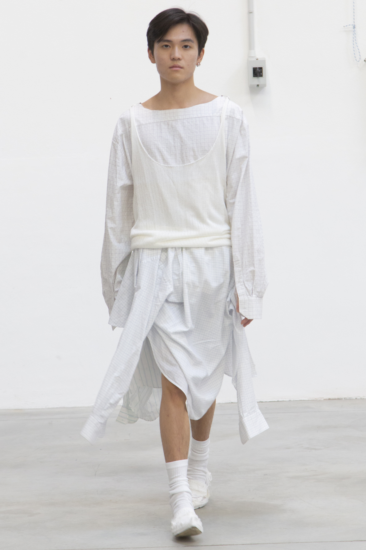 Reality bites is a movie from the 90’s. We live in an age where the bites of reality afflict the entire planet and we decided to talk about it in our own way. The collection does not really have much to do with the movie, aside a couple of 90’s inspired looks, but it reflects our path and experiences in creating this collection: the difficulties of being an ‘independent ’brand in today’s fashion world, dominated by cynicism and marketing strategies, so far away from what happens in the streets. We deepened our “punkindness” concept (kind punk which is more effective than violent punk) by mixing a raw aesthetic made of industrial sewings, safety pins, unfinished hems and graffiti with a more gentle and naive one made by embroidery, ruffles, hand written fabrics that look like children notebooks, hand printed apples made with a real apple and a color that smells like the fruit itself. The final result is what’s between the Sex Pistols and Holly Hobbies. Aside from the ‘bites’, realness is the other key word. Everything in the collection is ‘real’, starting from the deadstock upcyled garments and leftover fabrics to the choice of the models, all friends and fans of the brand that complete the styling with the accessories that they use every day to define their true identity. Our story talks about difficulties and enthusiasm: a challenge to do the best with what we have. It’s when you have scarce means that creativity gains a main role. MATERIALS Old cotton and linen bedsheets Upcycled classical men’s shirts turned into notebooks garments Old parachutes Knitwear made with discarded wool, cotton and silk yarns Recycled jersey garments decorated with an industrial sewing machine Wrong embroideries with the collection messages Broken and rebuilt up cycled tailoring