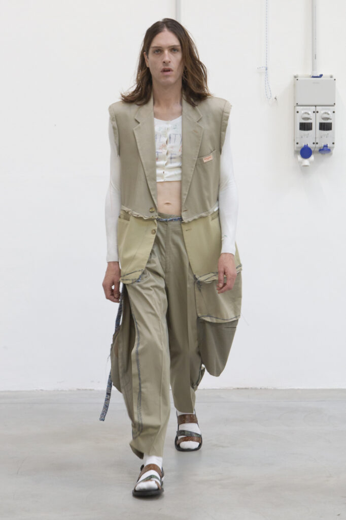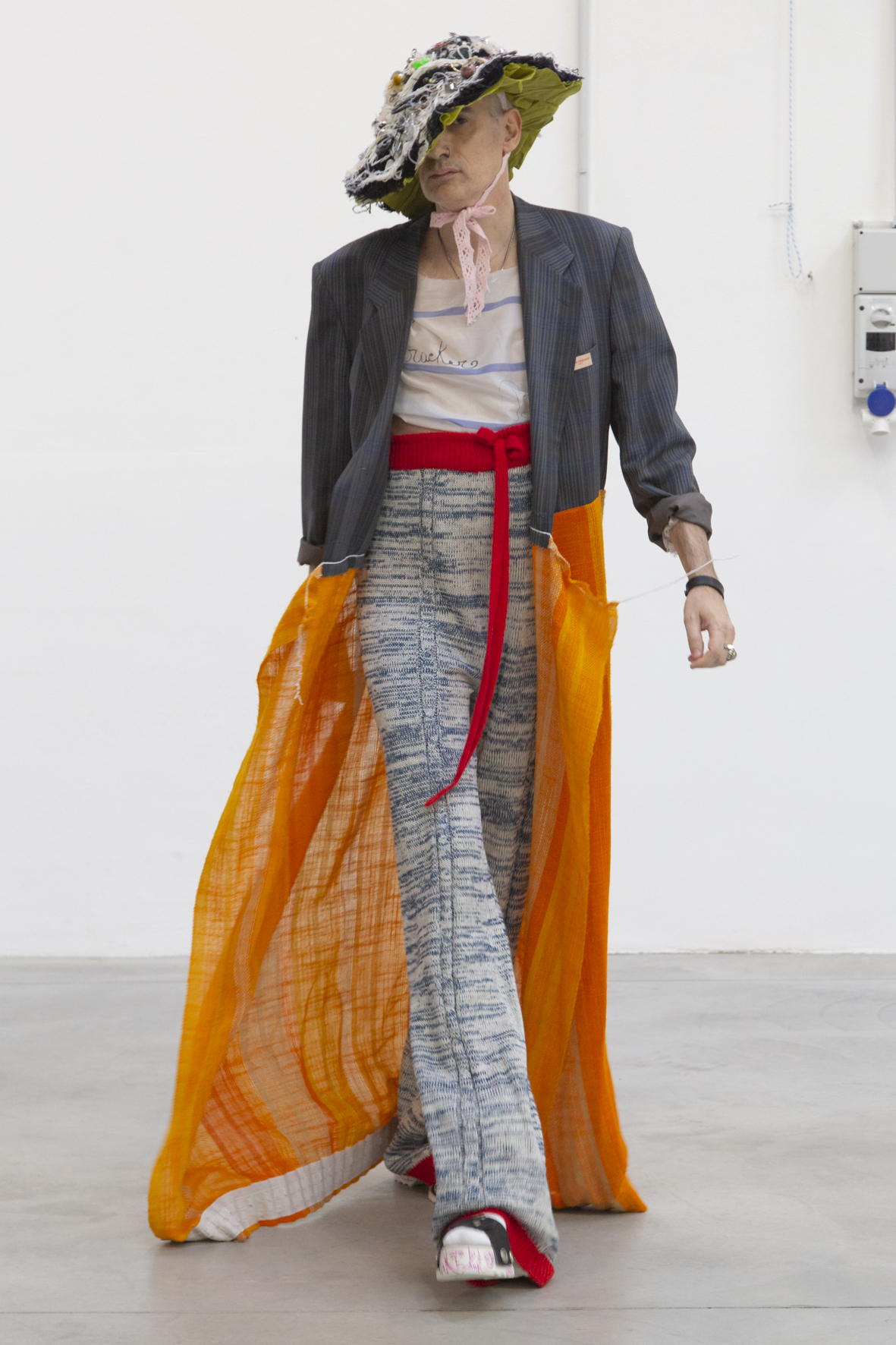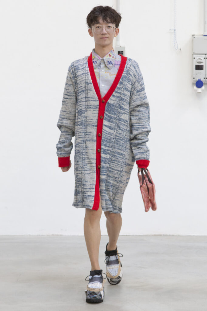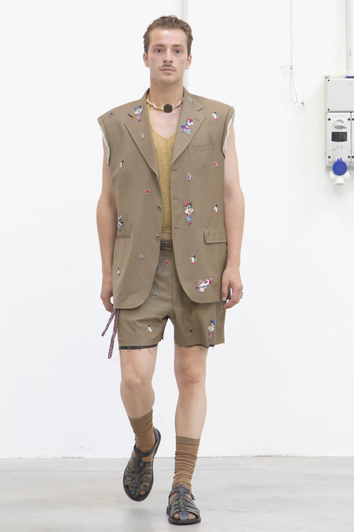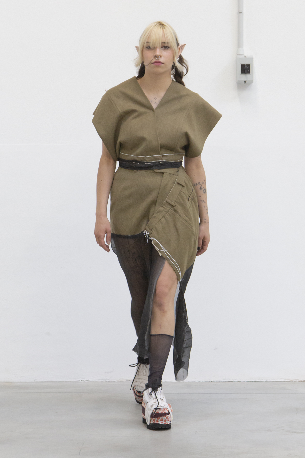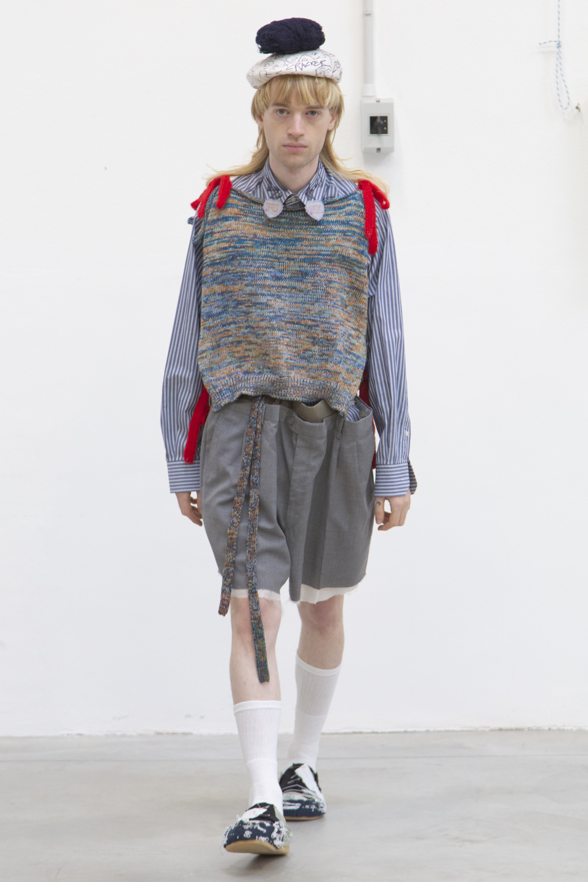 Reality bites is a movie from the 90’s. We live in an age where the bites of reality afflict the entire planet and we decided to talk about it in our own way. The collection does not really have much to do with the movie, aside a couple of 90’s inspired looks, but it reflects our path and experiences in creating this collection: the difficulties of being an ‘independent ’brand in today’s fashion world, dominated by cynicism and marketing strategies, so far away from what happens in the streets. We deepened our “punkindness” concept (kind punk which is more effective than violent punk) by mixing a raw aesthetic made of industrial sewings, safety pins, unfinished hems and graffiti with a more gentle and naive one made by embroidery, ruffles, hand written fabrics that look like children notebooks, hand printed apples made with a real apple and a color that smells like the fruit itself. The final result is what’s between the Sex Pistols and Holly Hobbies. Aside from the ‘bites’, realness is the other key word. Everything in the collection is ‘real’, starting from the deadstock upcyled garments and leftover fabrics to the choice of the models, all friends and fans of the brand that complete the styling with the accessories that they use every day to define their true identity. Our story talks about difficulties and enthusiasm: a challenge to do the best with what we have. It’s when you have scarce means that creativity gains a main role. MATERIALS Old cotton and linen bedsheets Upcycled classical men’s shirts turned into notebooks garments Old parachutes Knitwear made with discarded wool, cotton and silk yarns Recycled jersey garments decorated with an industrial sewing machine Wrong embroideries with the collection messages Broken and rebuilt up cycled tailoring