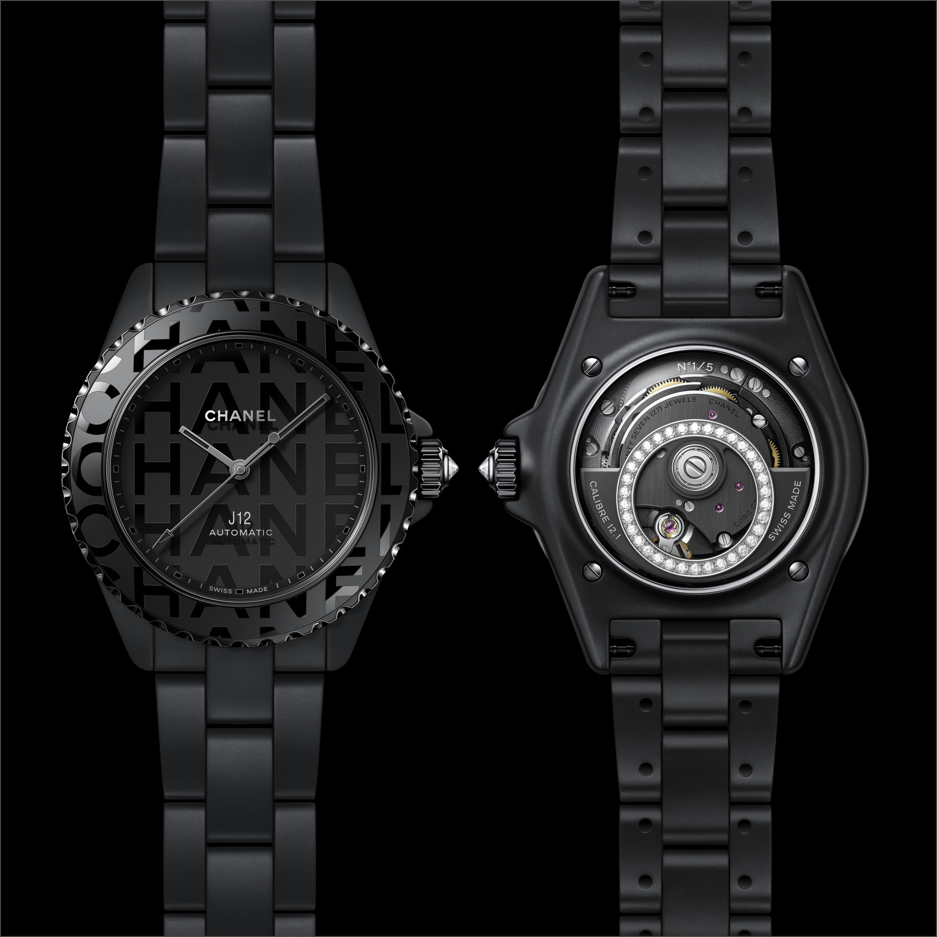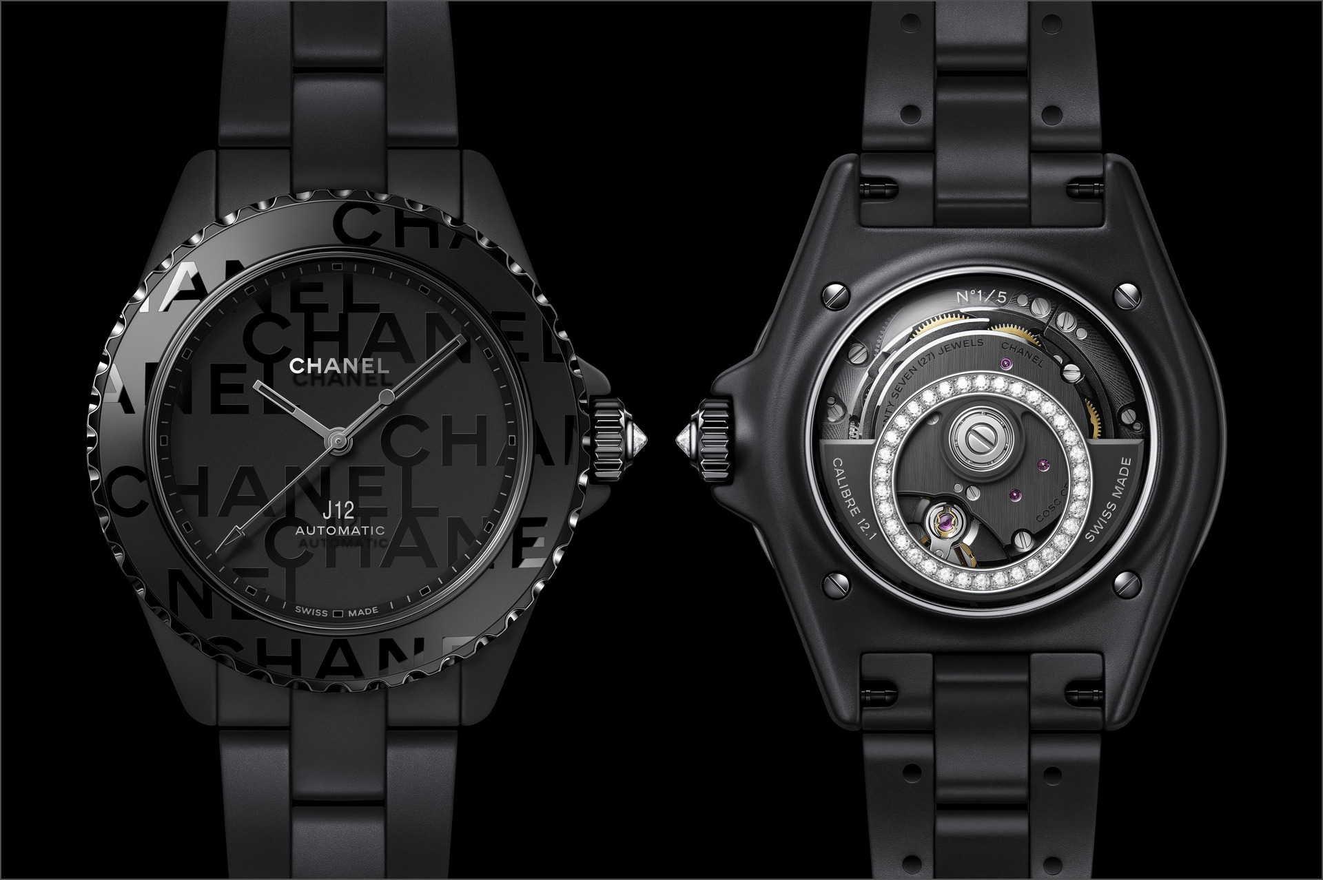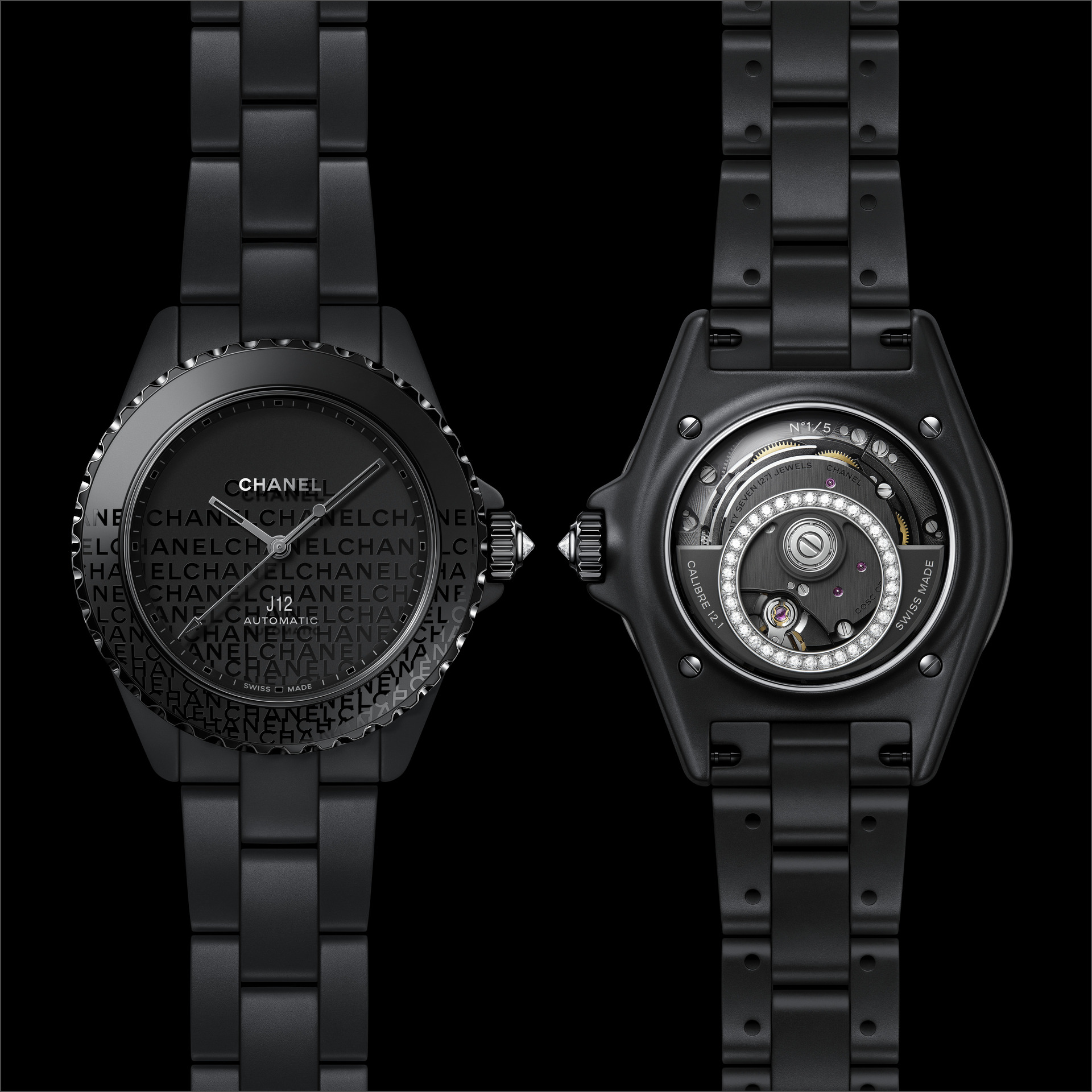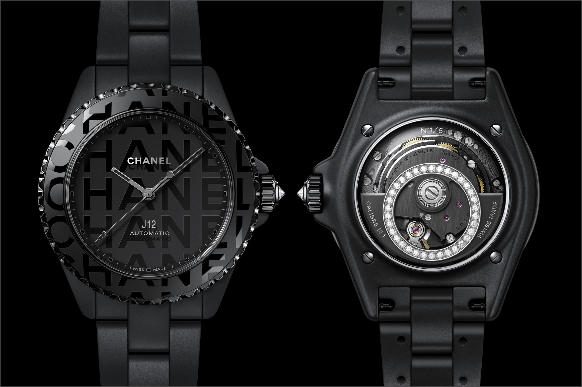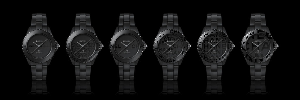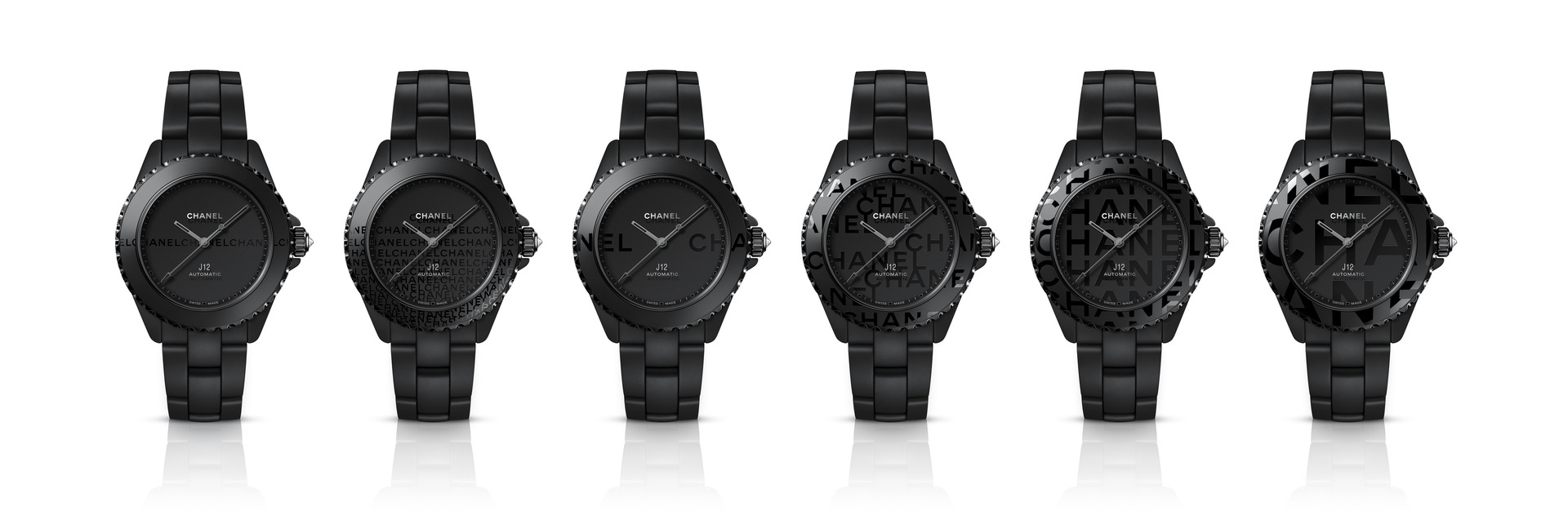 Les six J12 38 mm en céramique noire ton sur ton sont équipées du Calibre 12.1, serti de 34 diamants taille brillant. Un diamant ponctue la couronne de chaque montre.