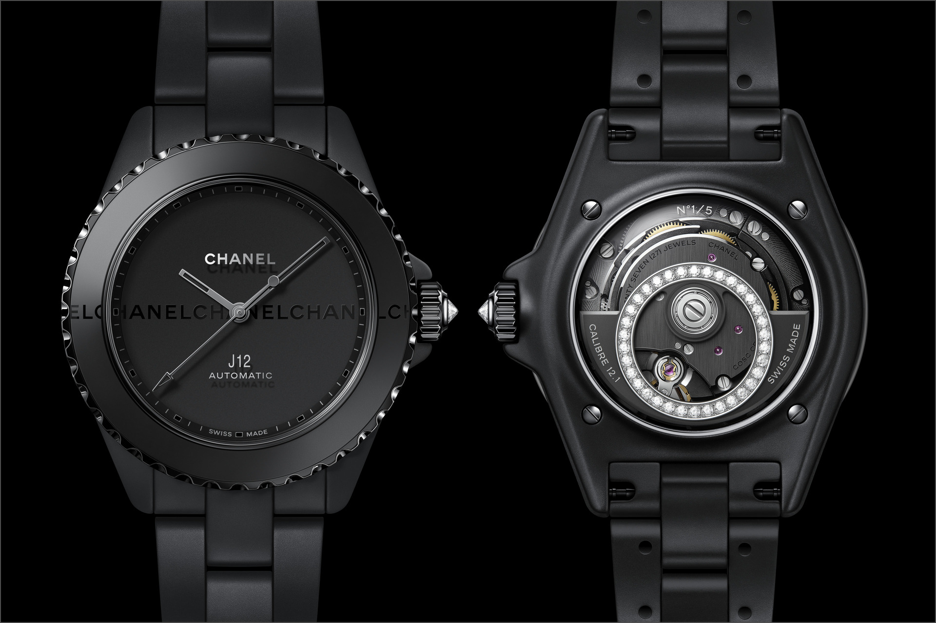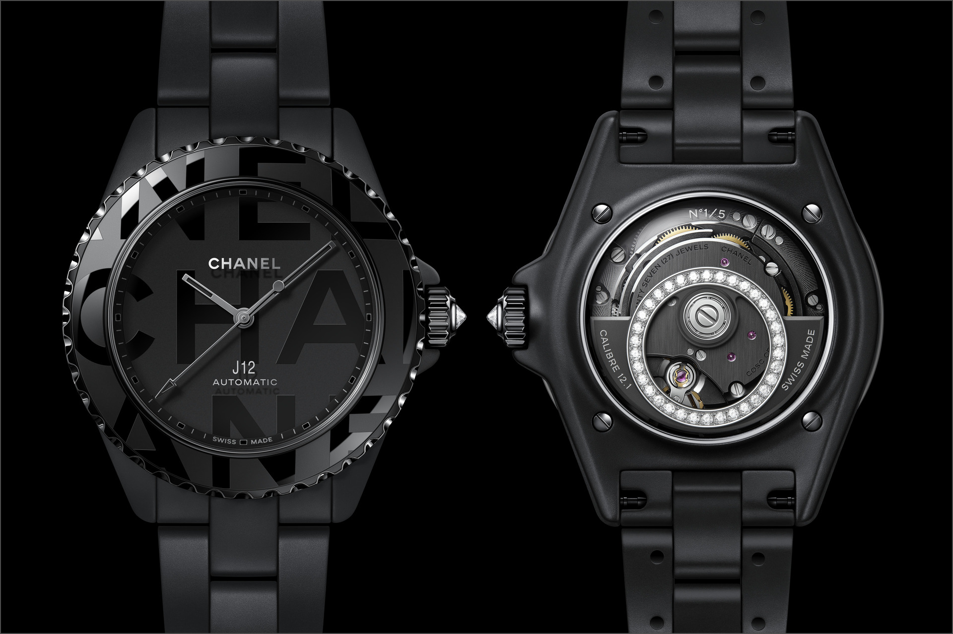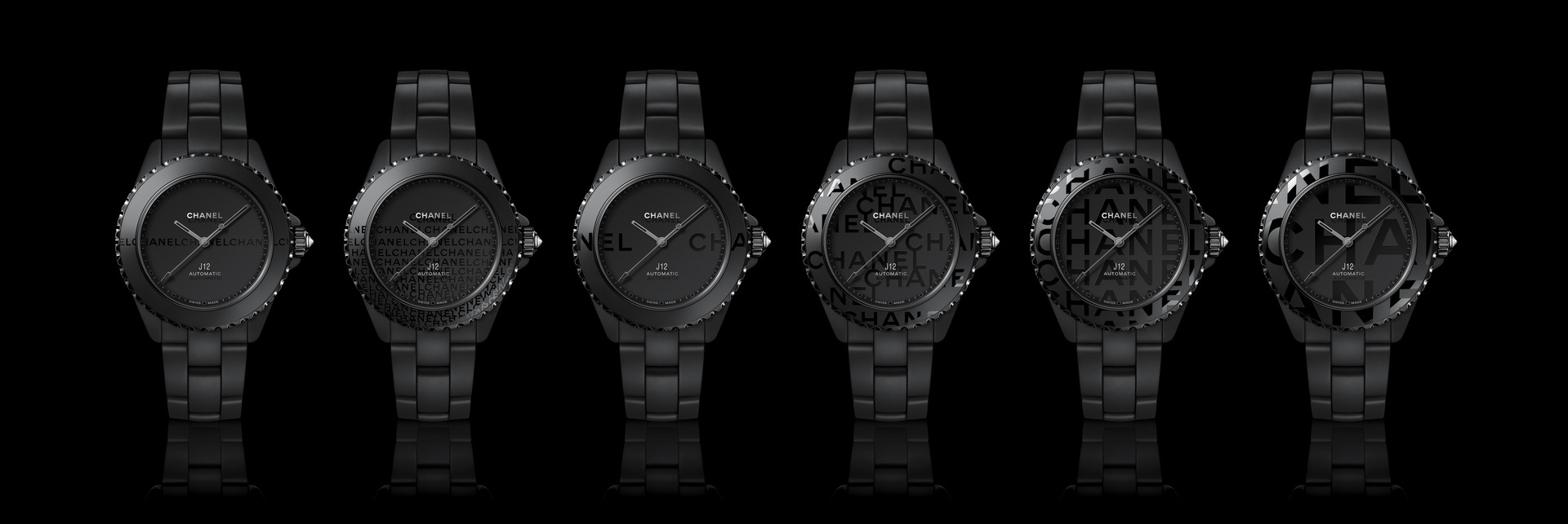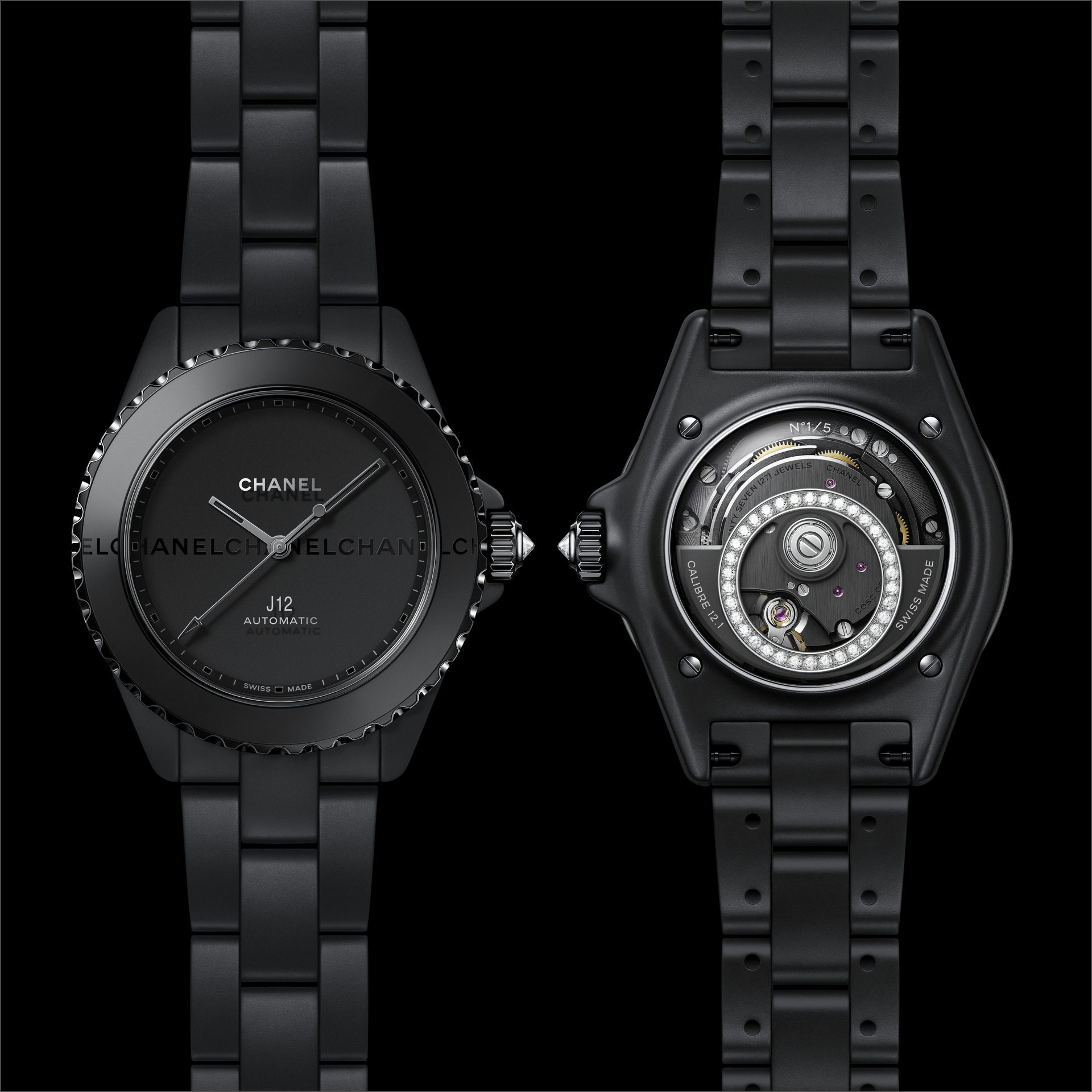 Les six J12 38 mm en céramique noire ton sur ton sont équipées du Calibre 12.1, serti de 34 diamants taille brillant. Un diamant ponctue la couronne de chaque montre.
