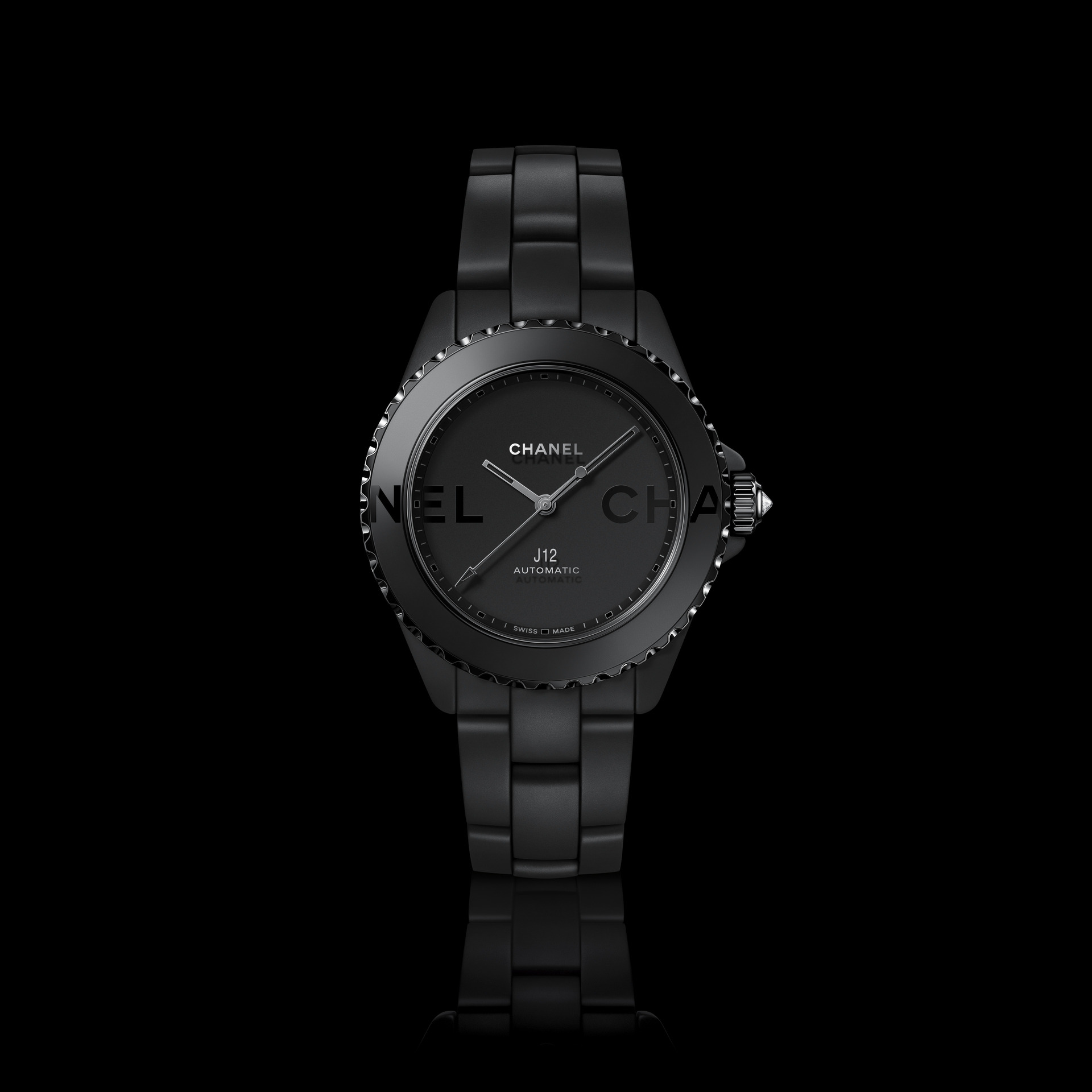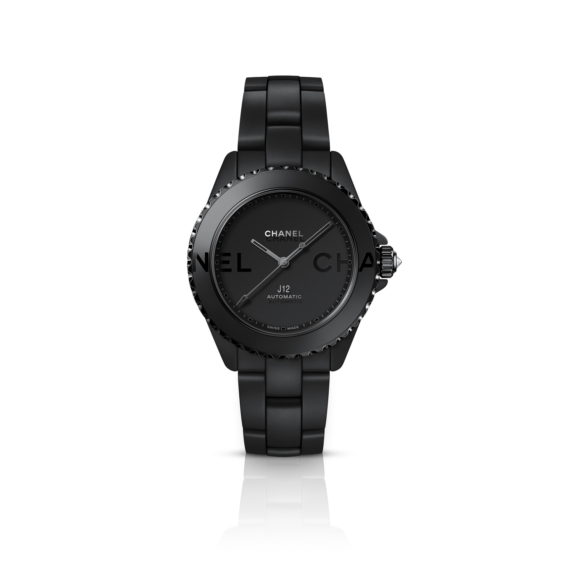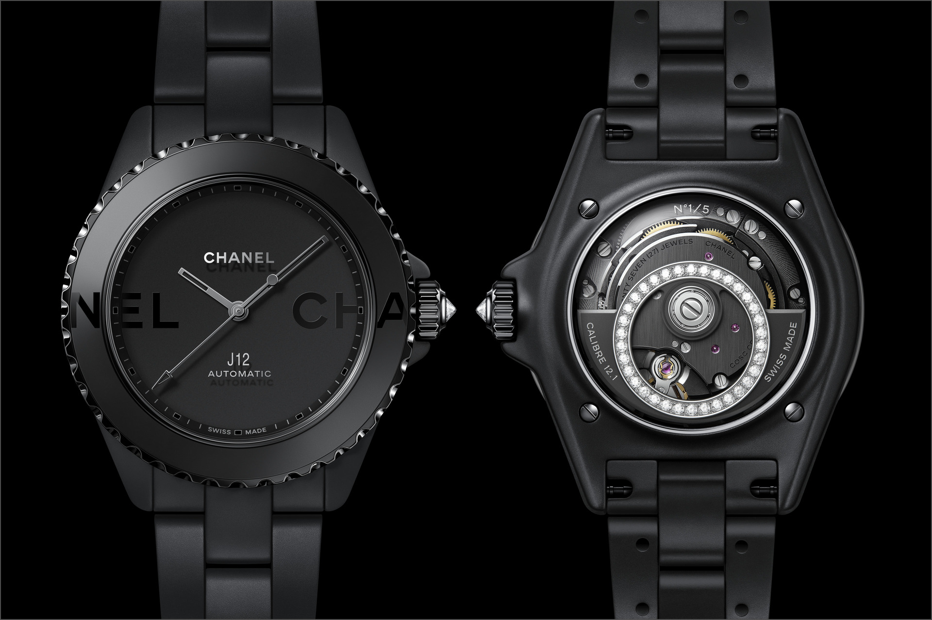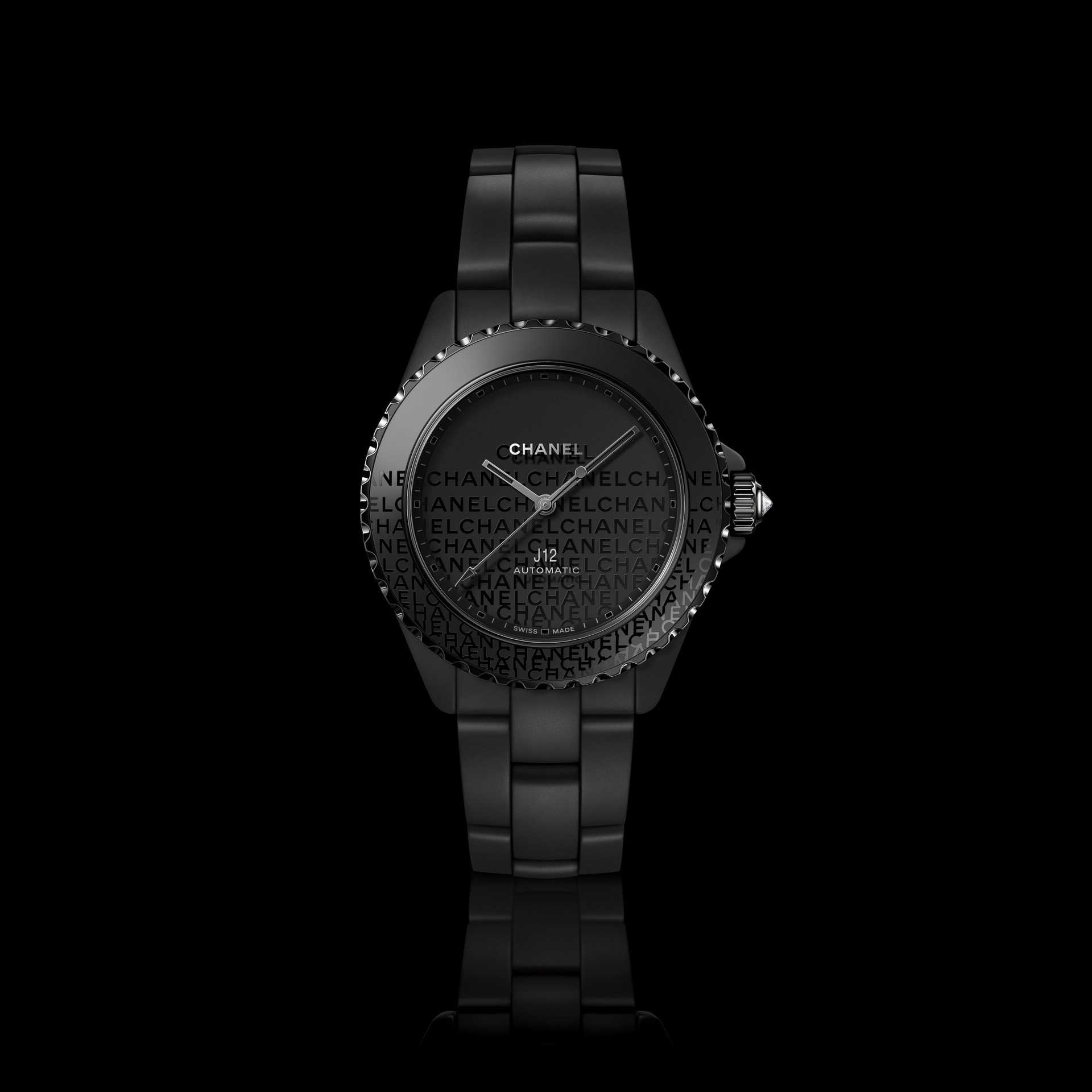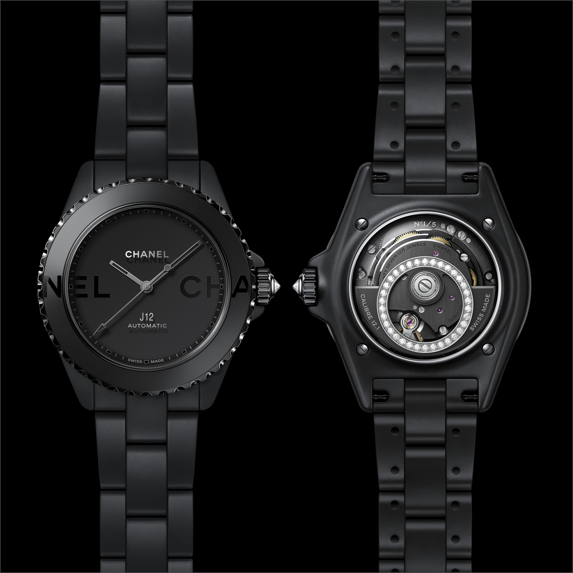 Les six J12 38 mm en céramique noire ton sur ton sont équipées du Calibre 12.1, serti de 34 diamants taille brillant. Un diamant ponctue la couronne de chaque montre.