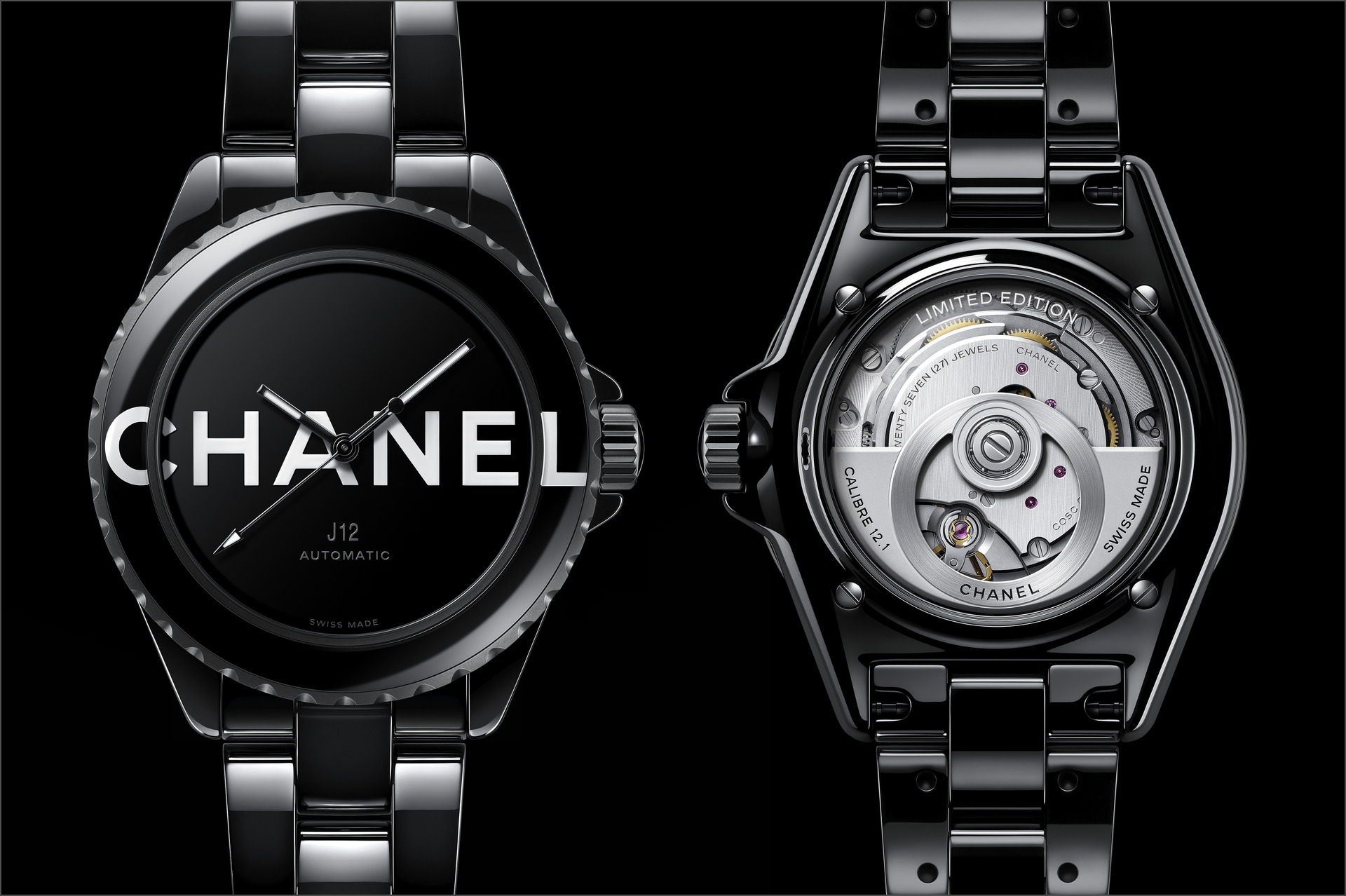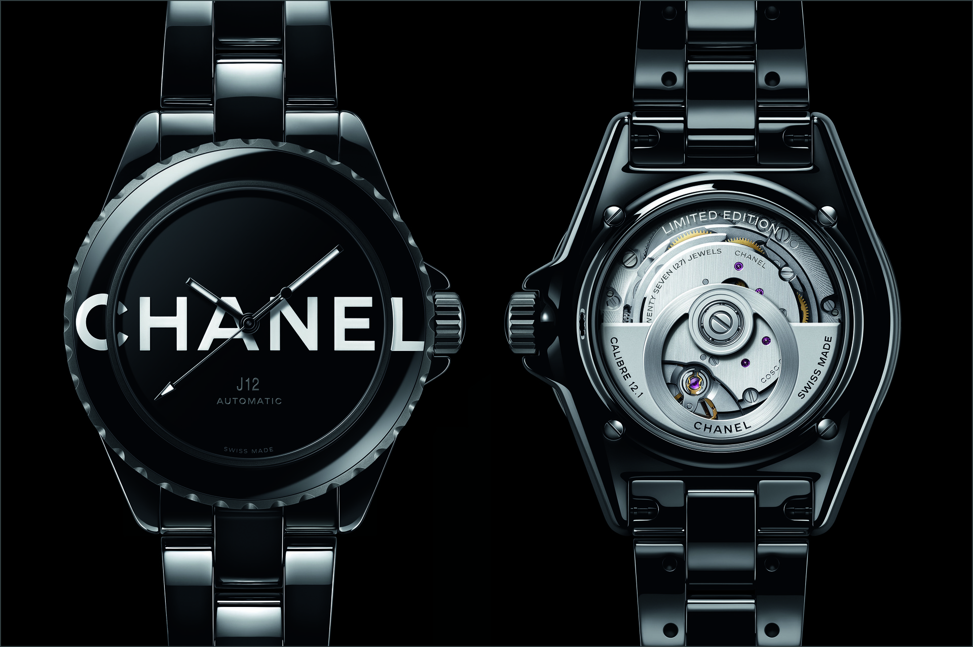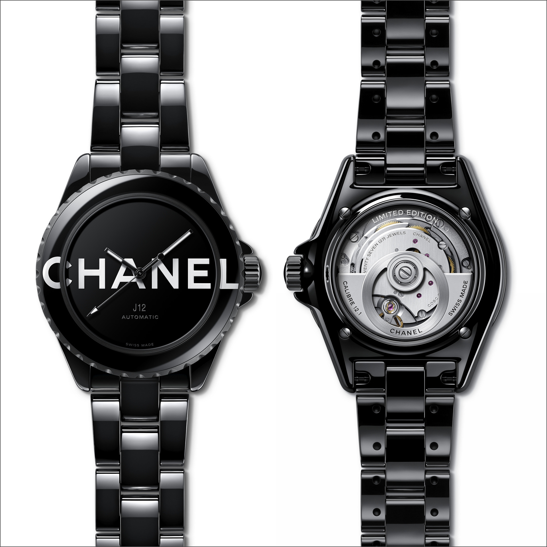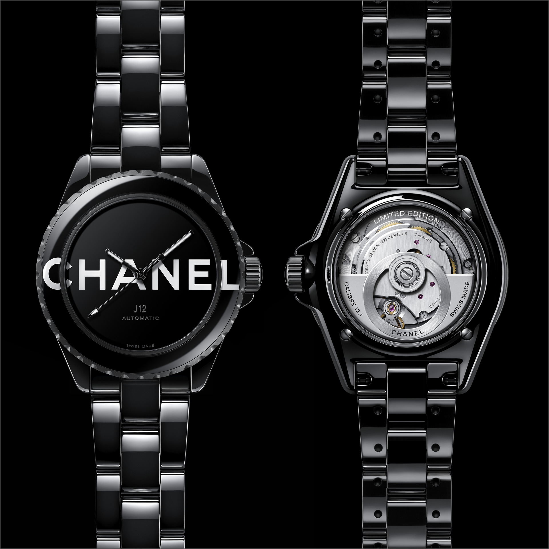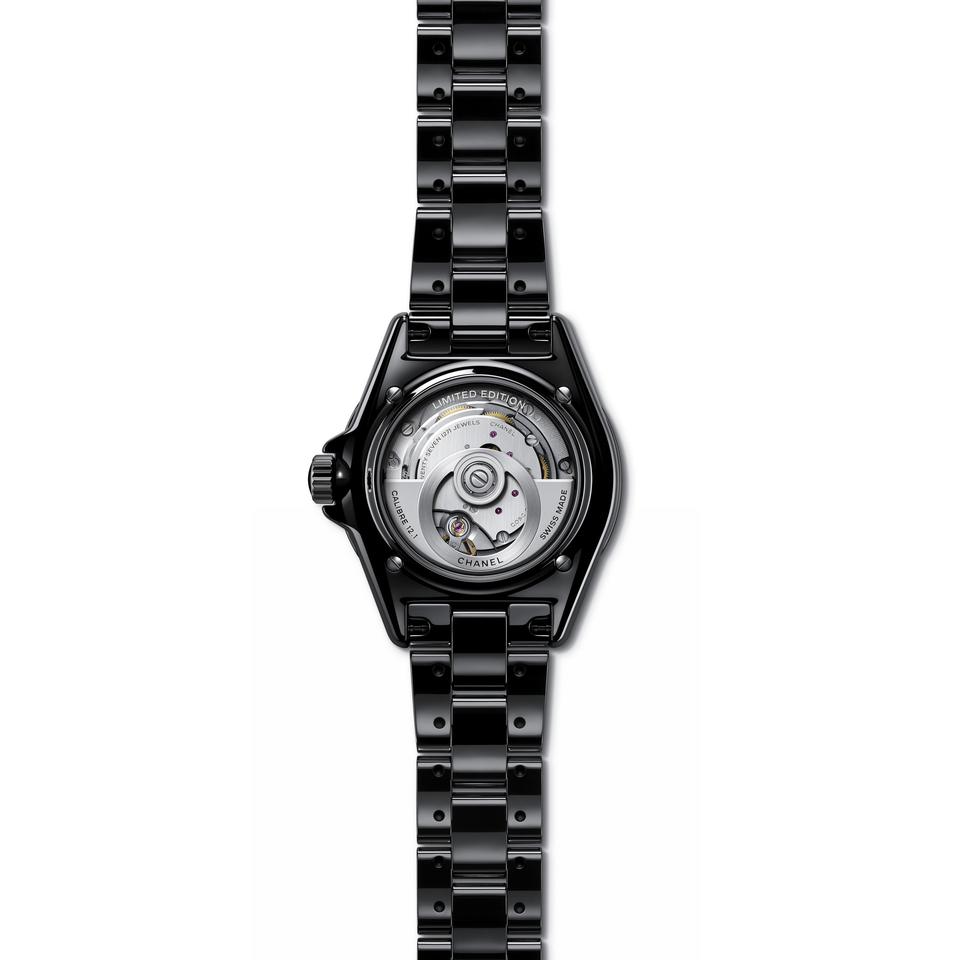 Les six J12 38 mm en céramique noire ton sur ton sont équipées du Calibre 12.1, serti de 34 diamants taille brillant. Un diamant ponctue la couronne de chaque montre.
