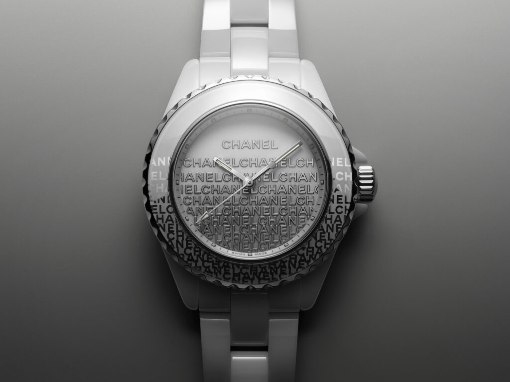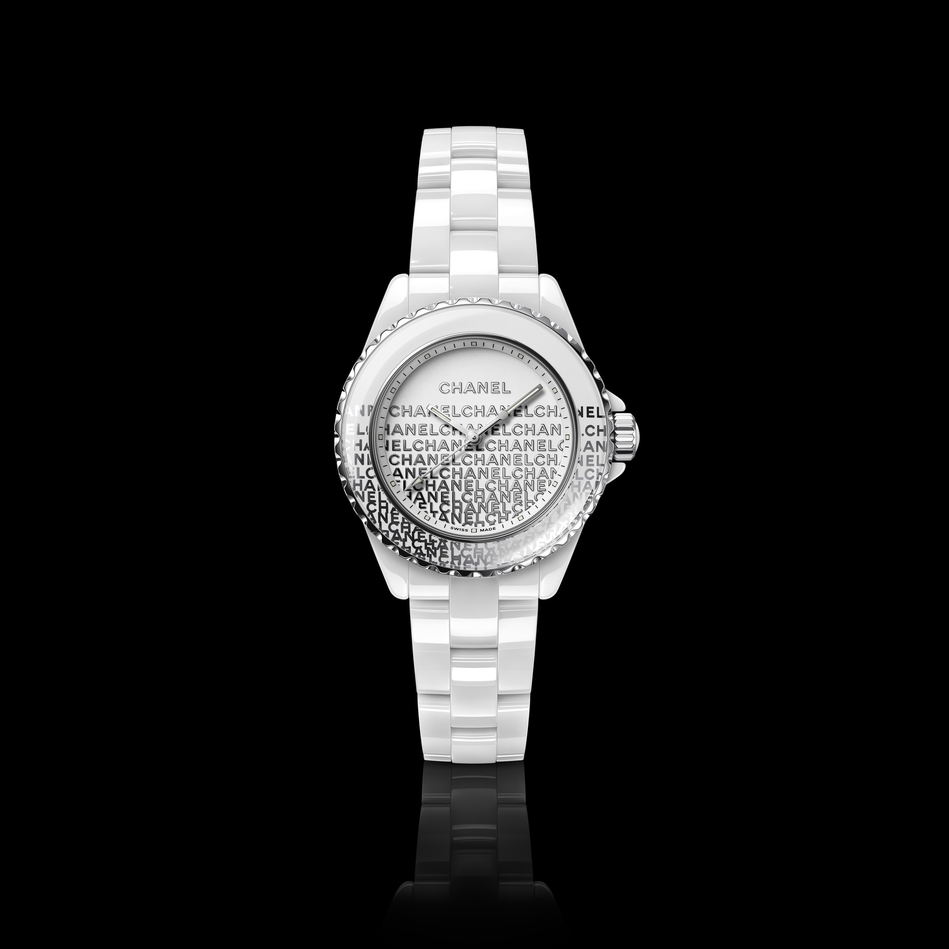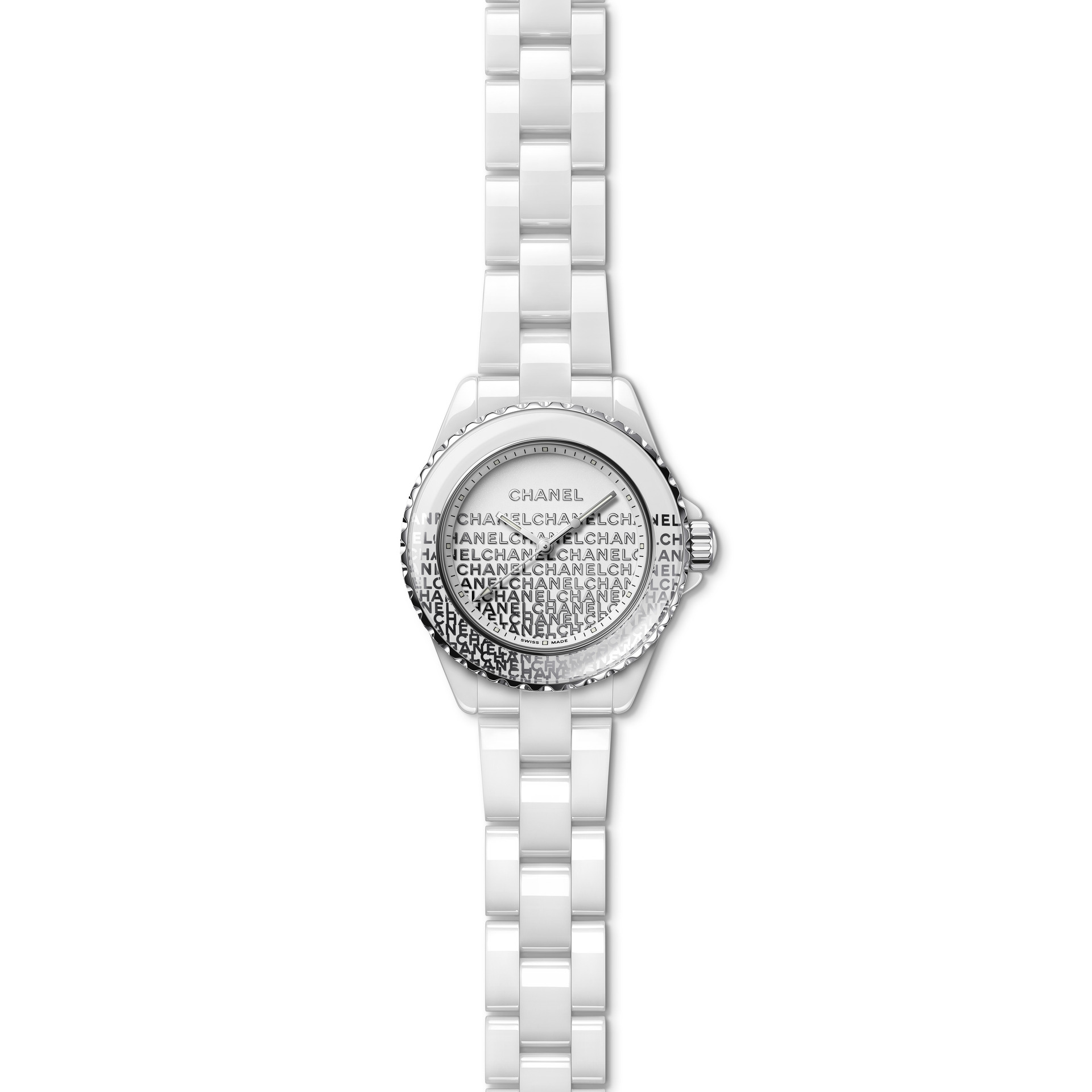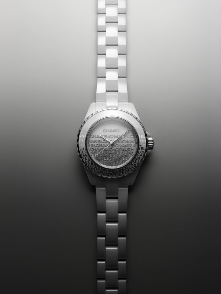 Audacieuse, la montre J12 33 mm se dévoile dans sa robe de céramique blanche. Une dentelle de logos se déploie de la lunette au cadran. La trame est fine, précieuse, graphique et la composition volontairement asymétrique.