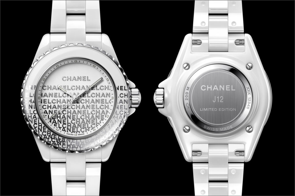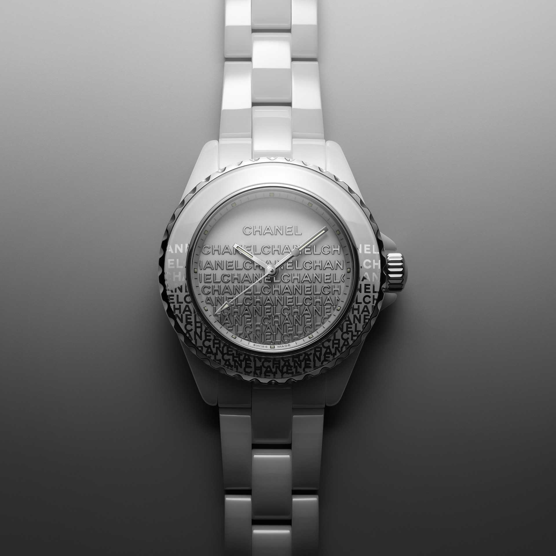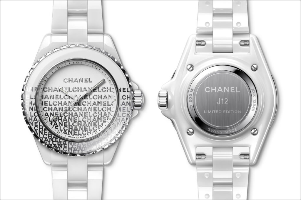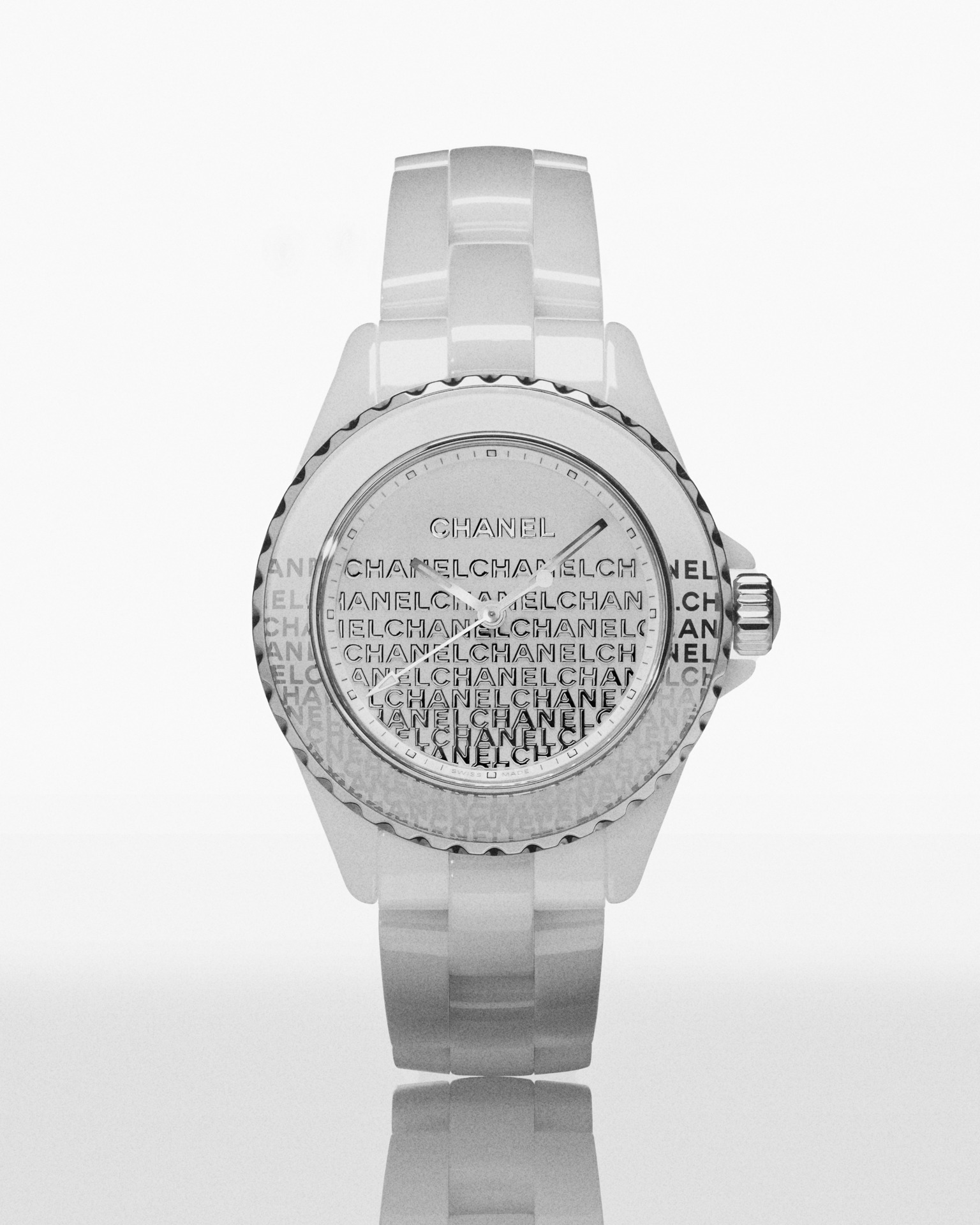 Audacieuse, la montre J12 33 mm se dévoile dans sa robe de céramique blanche. Une dentelle de logos se déploie de la lunette au cadran. La trame est fine, précieuse, graphique et la composition volontairement asymétrique.