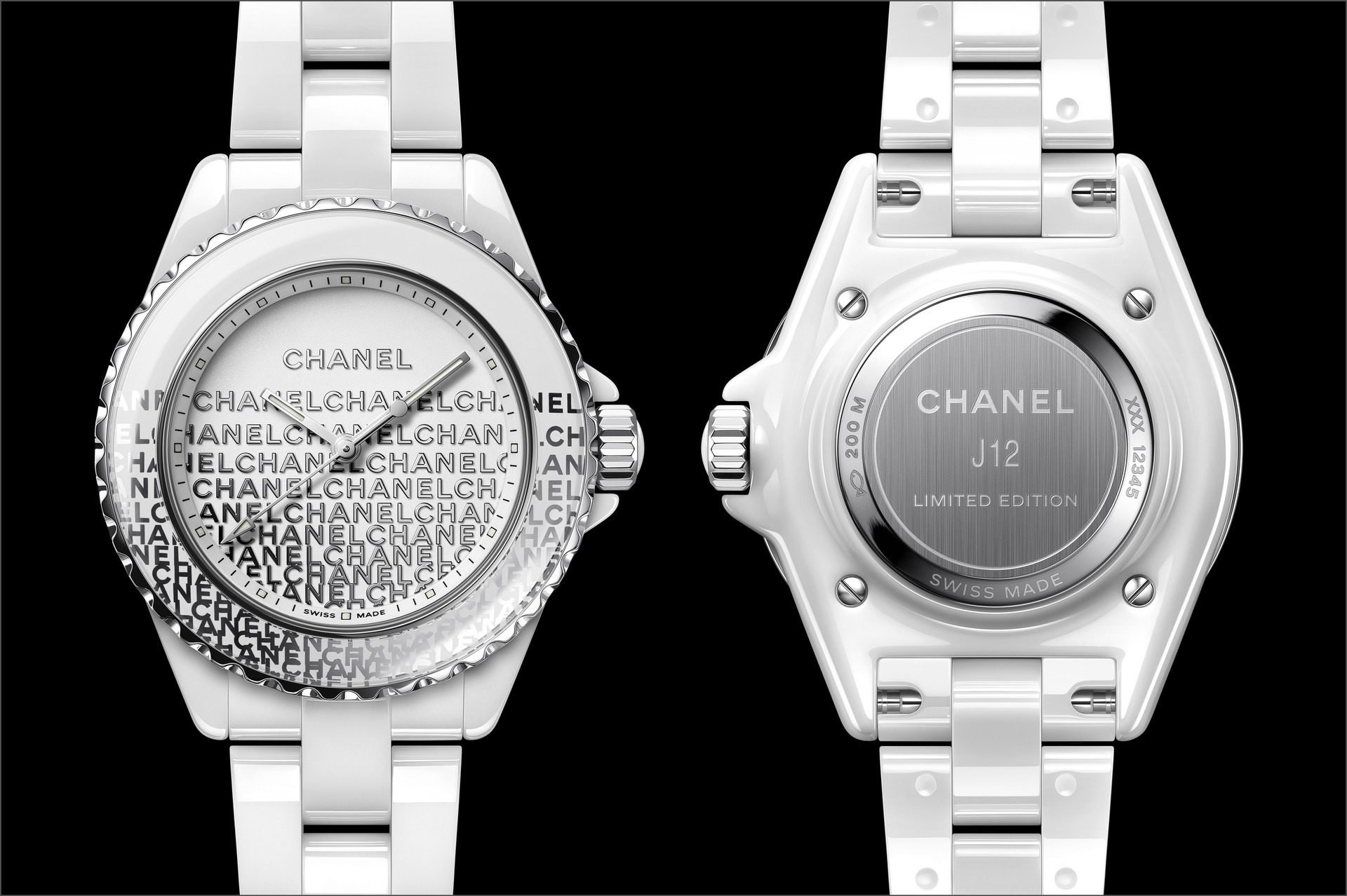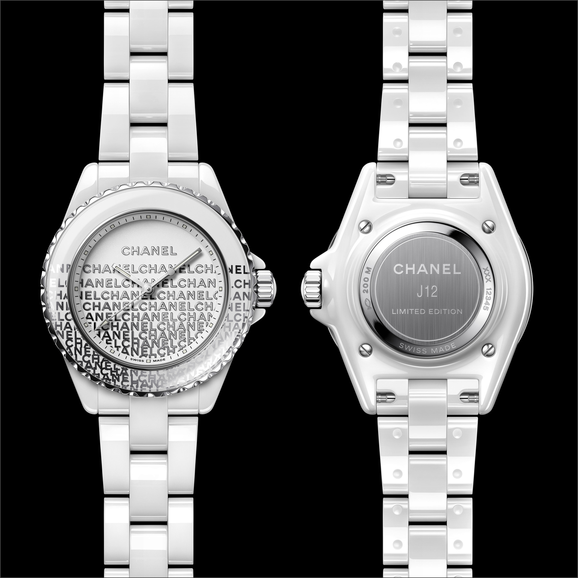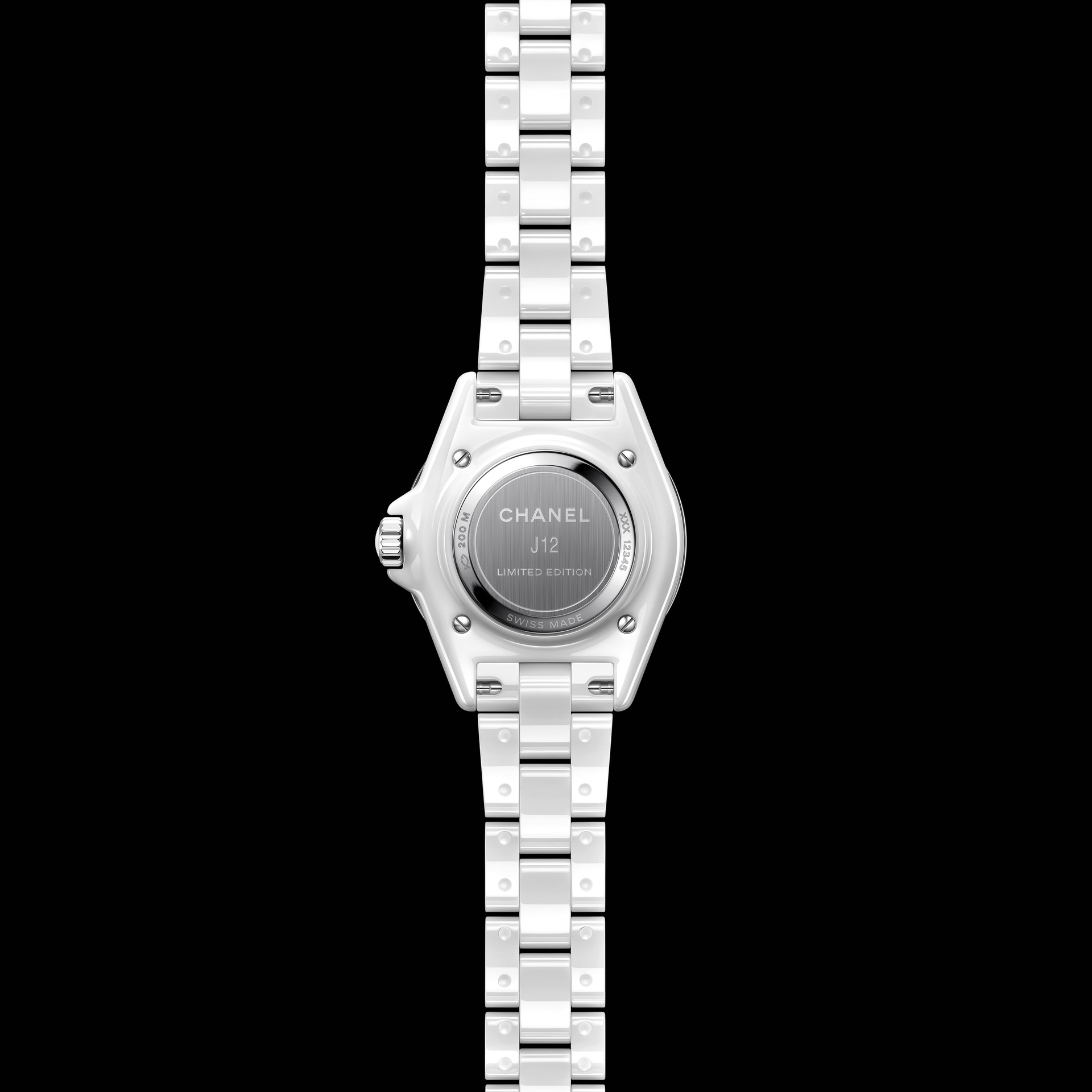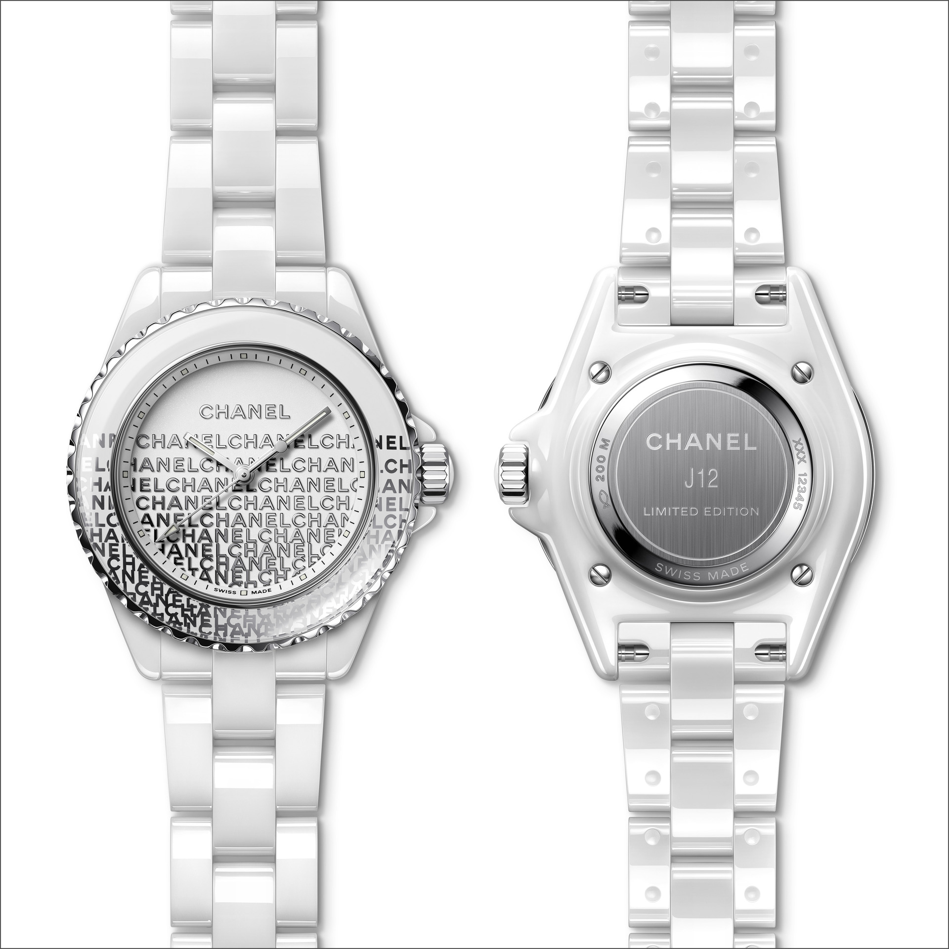 Audacieuse, la montre J12 33 mm se dévoile dans sa robe de céramique blanche. Une dentelle de logos se déploie de la lunette au cadran. La trame est fine, précieuse, graphique et la composition volontairement asymétrique.