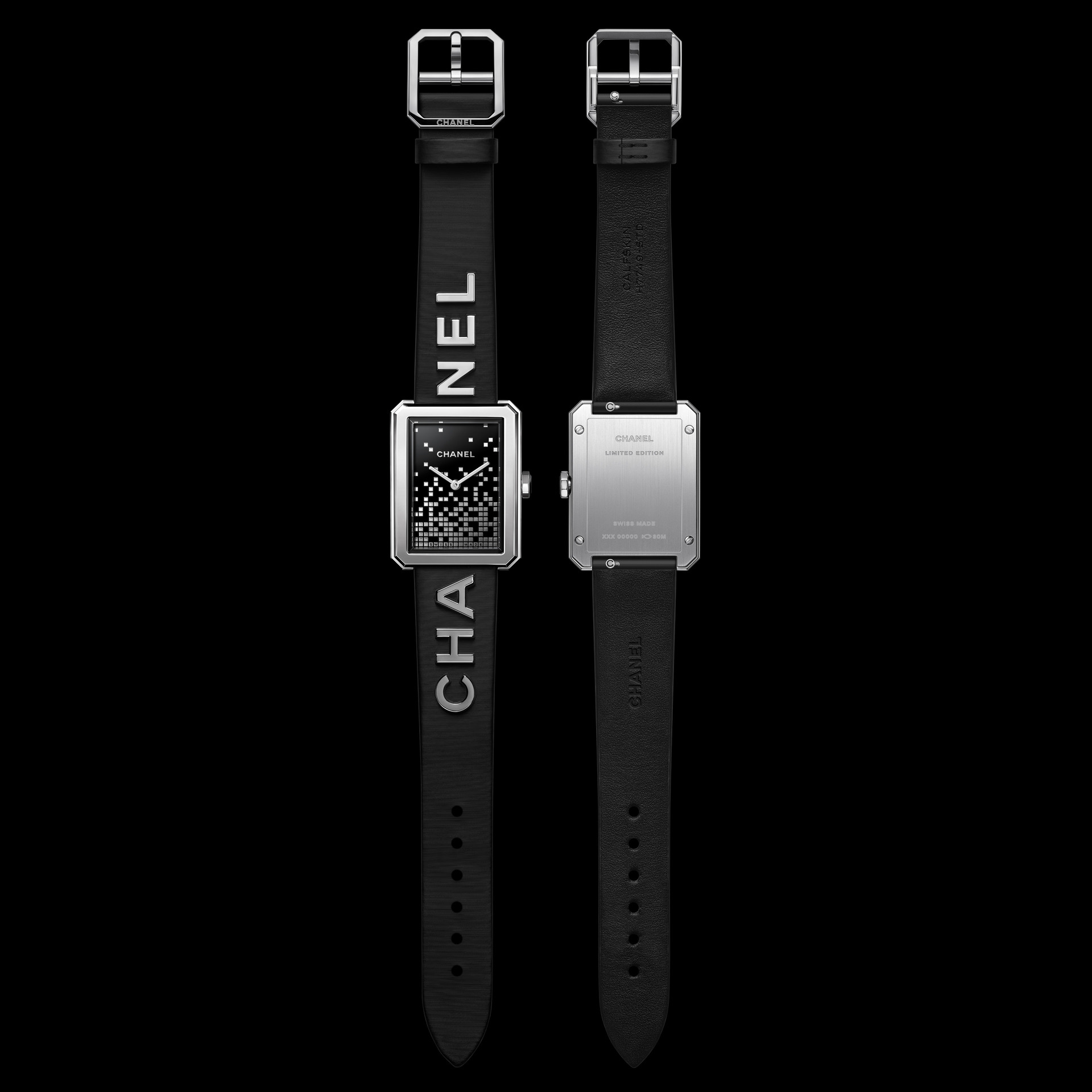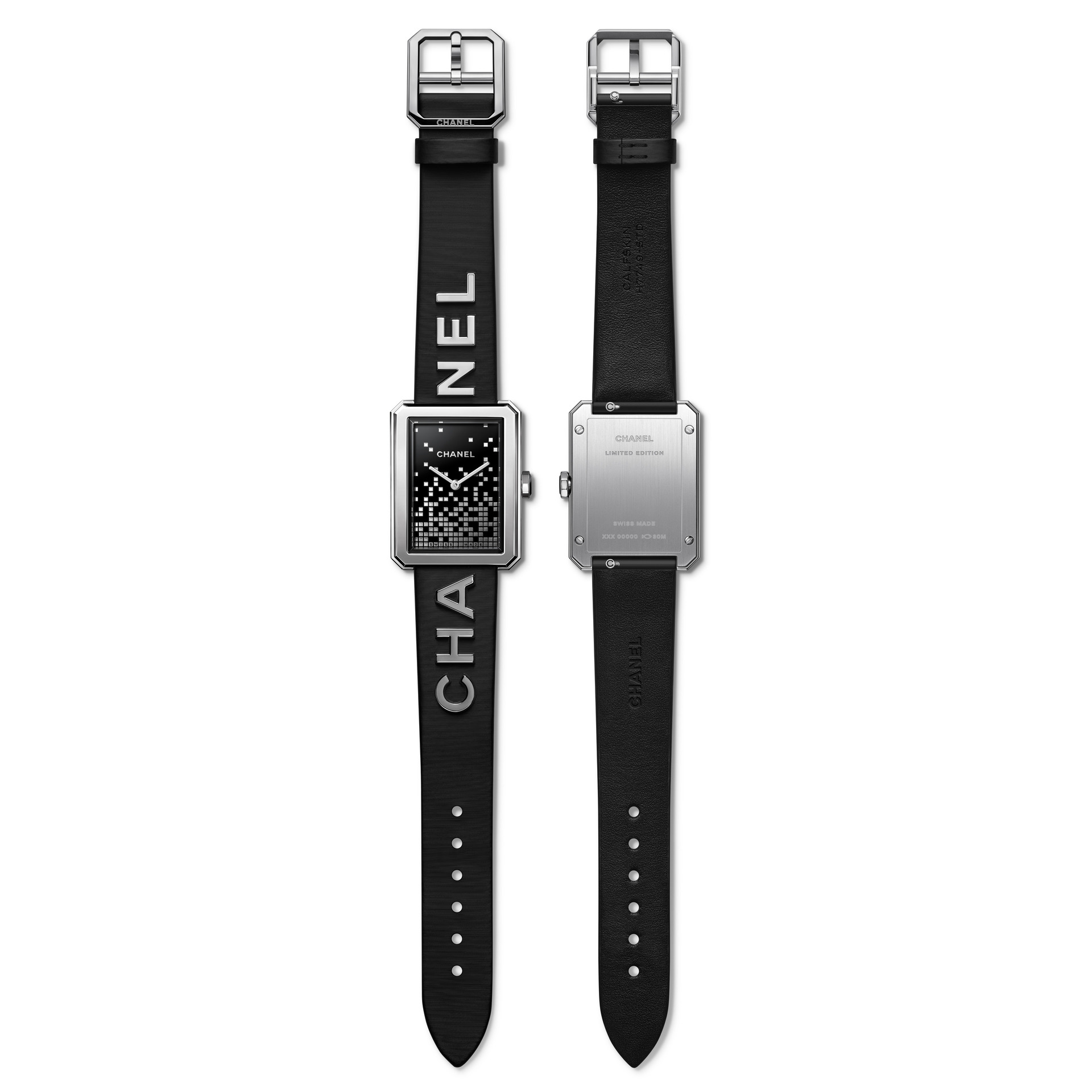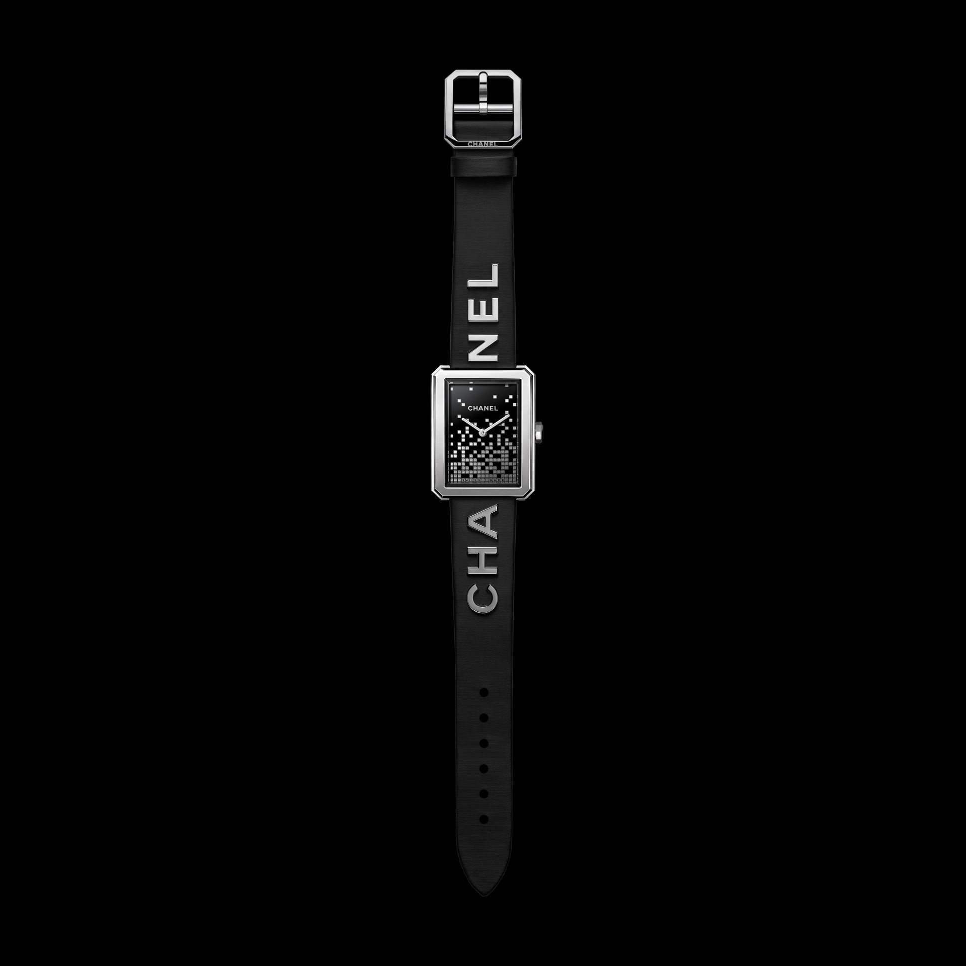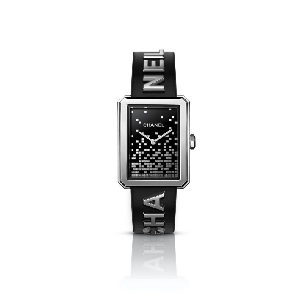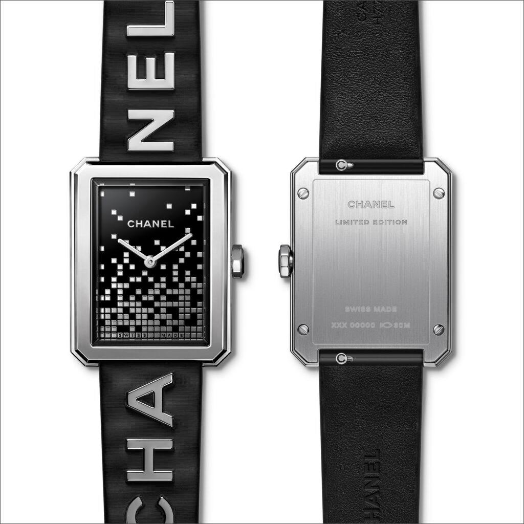 Les 6 lettres métalliques sont rivées à même le cuir. Entre CHA et NEL, la boîte de montre en acier dévoile un cadran laqué noir au décor pixélisé dans un esprit « 90’s ». Édition limitée.