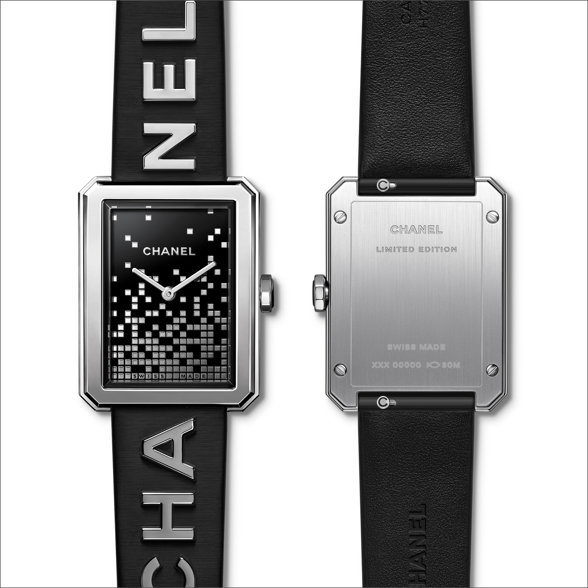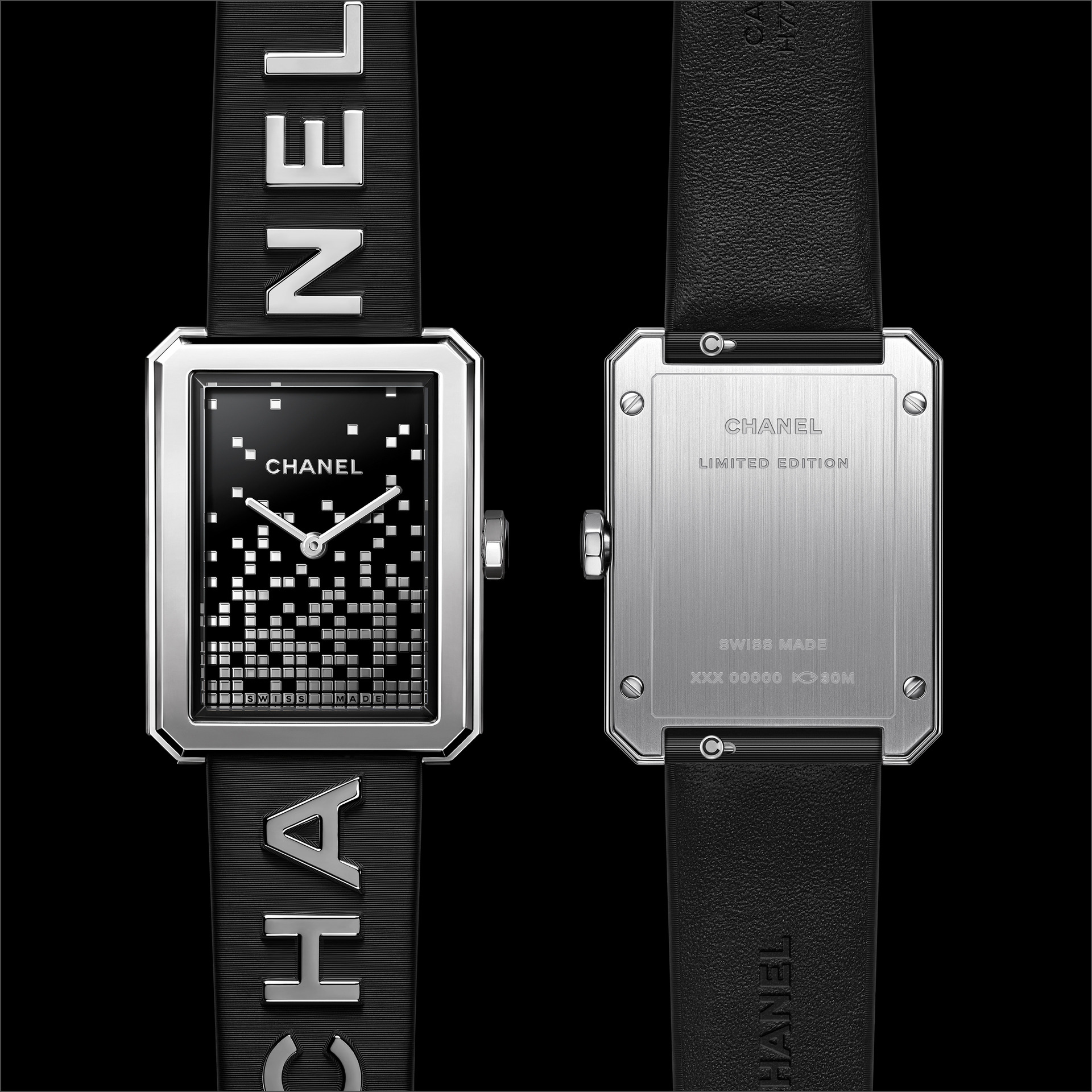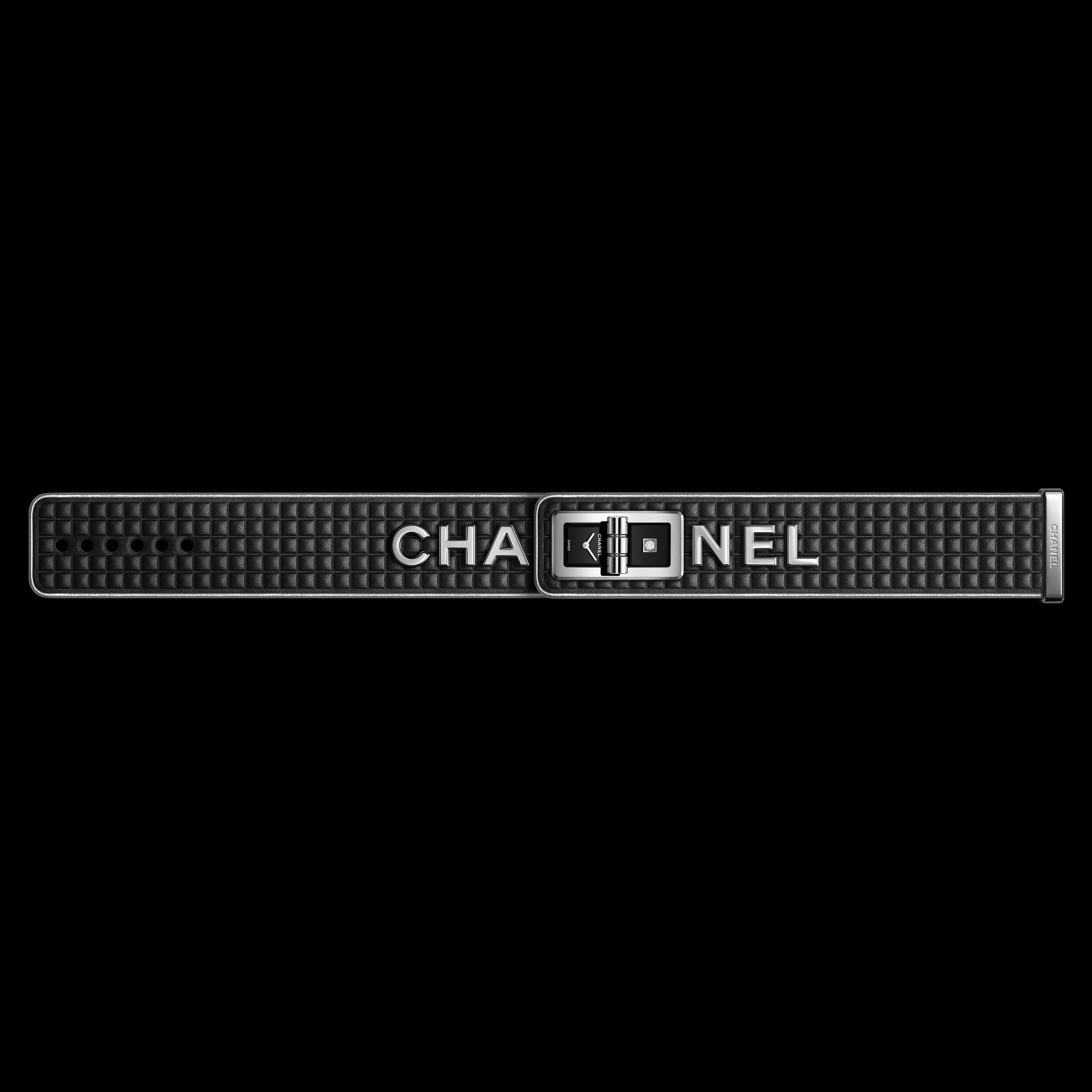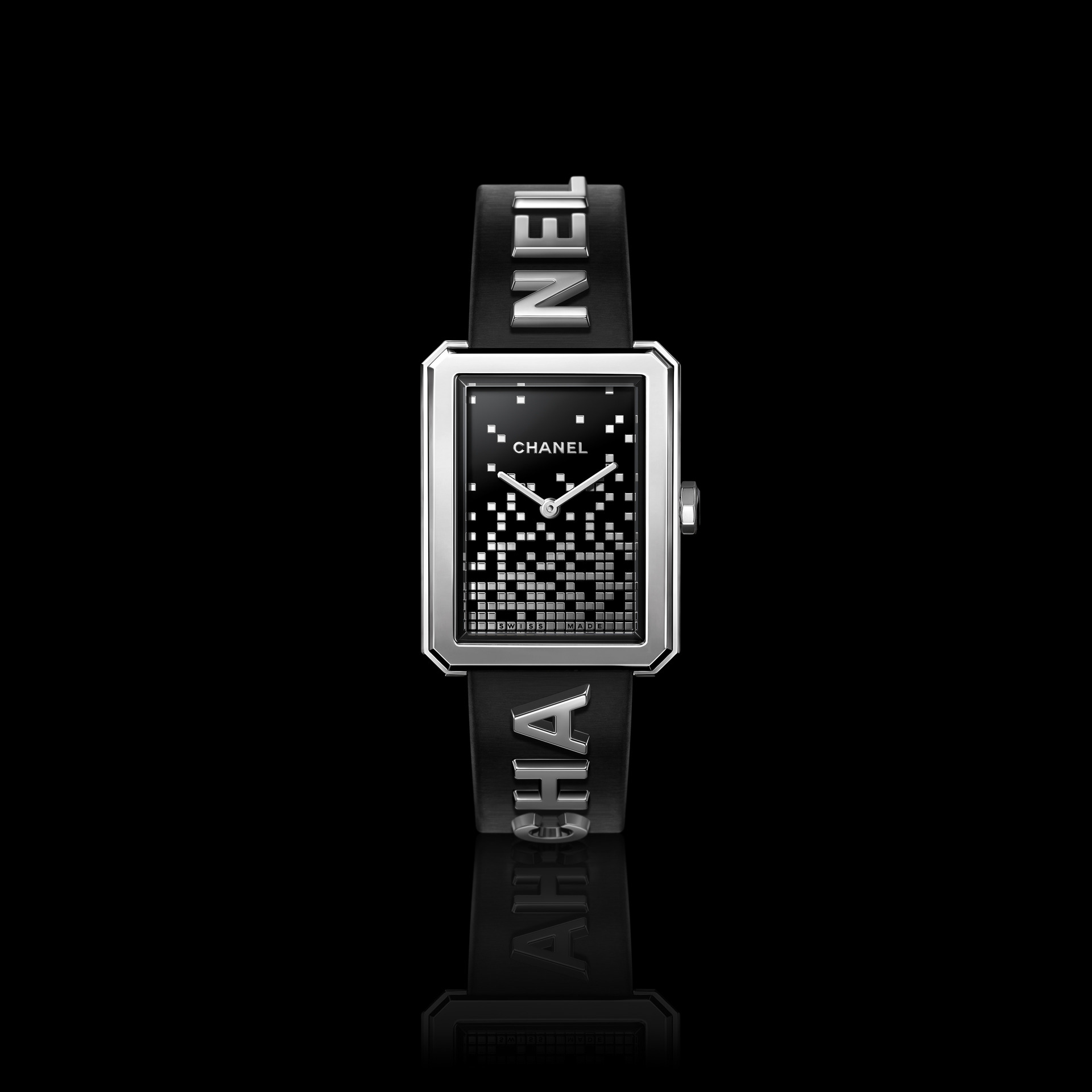 Les 6 lettres métalliques sont rivées à même le cuir. Entre CHA et NEL, la boîte de montre en acier dévoile un cadran laqué noir au décor pixélisé dans un esprit « 90’s ». Édition limitée.
