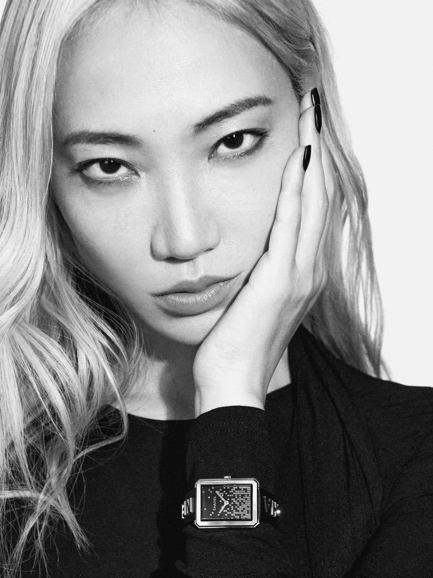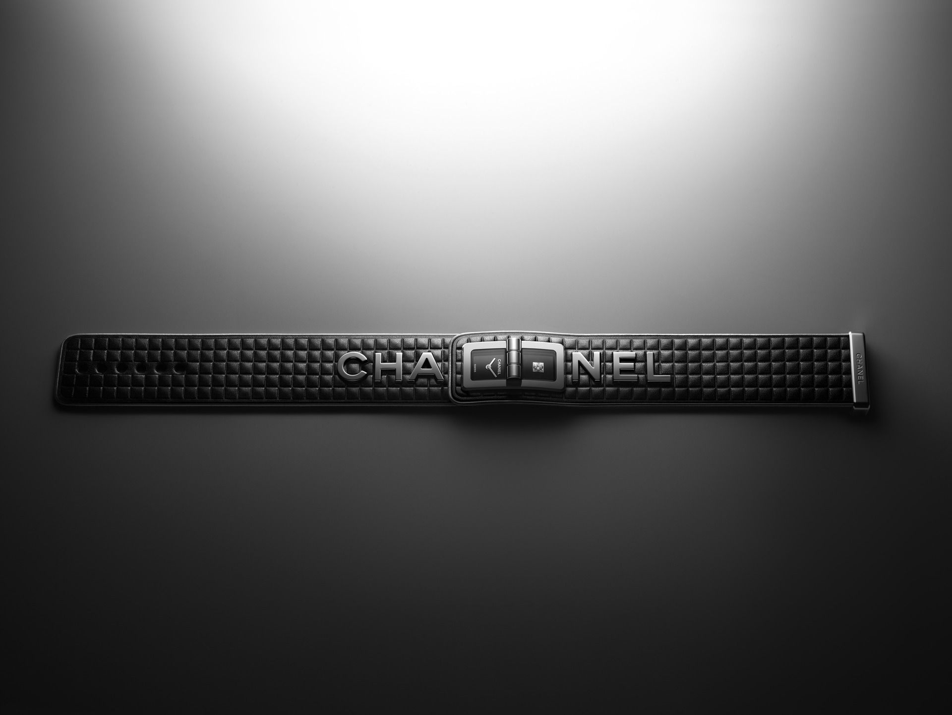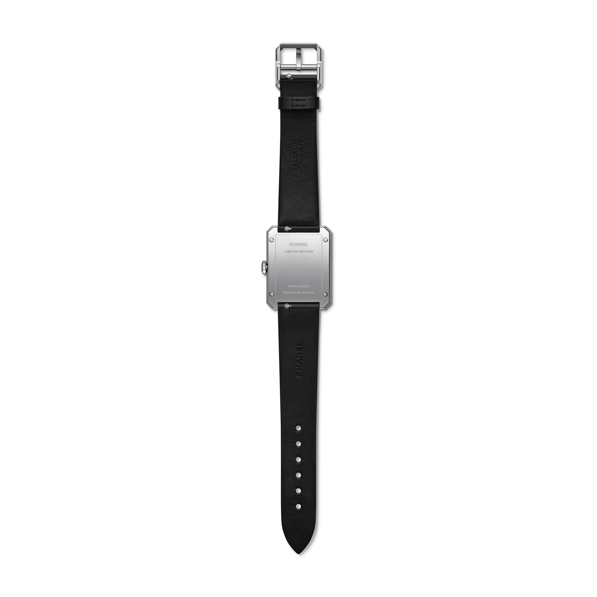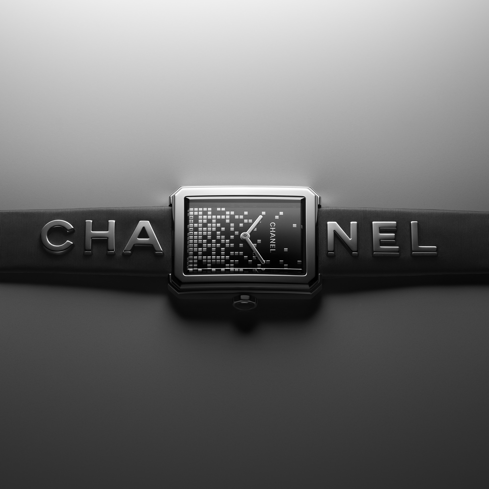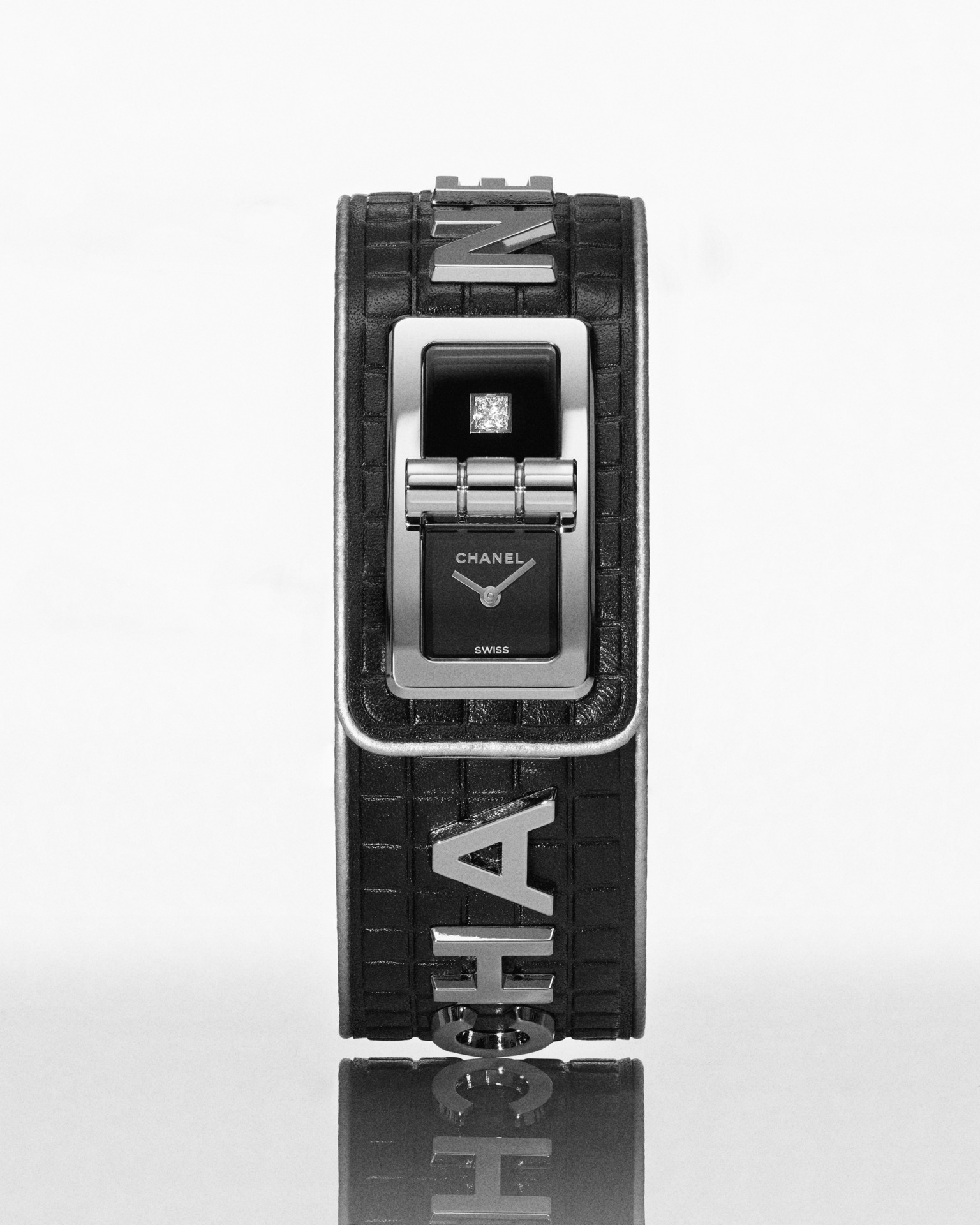 Les 6 lettres métalliques sont rivées à même le cuir. Entre CHA et NEL, la boîte de montre en acier dévoile un cadran laqué noir au décor pixélisé dans un esprit « 90’s ». Édition limitée.