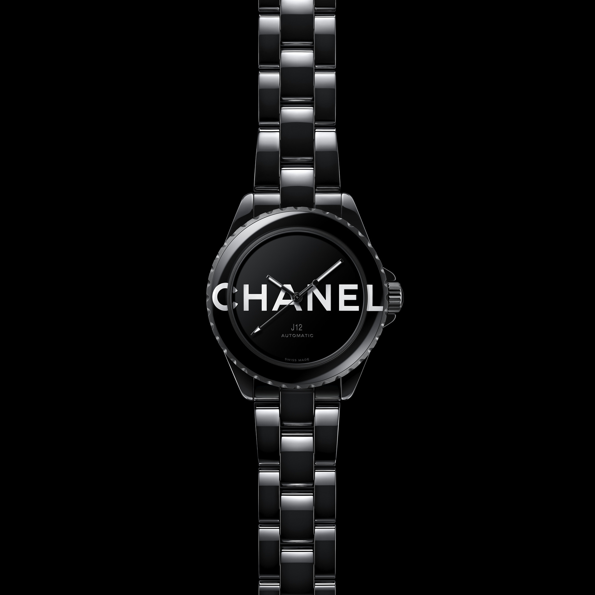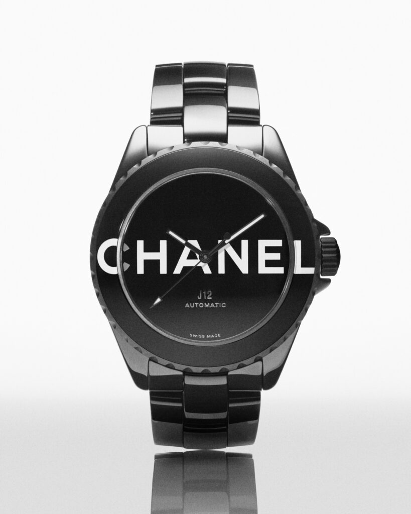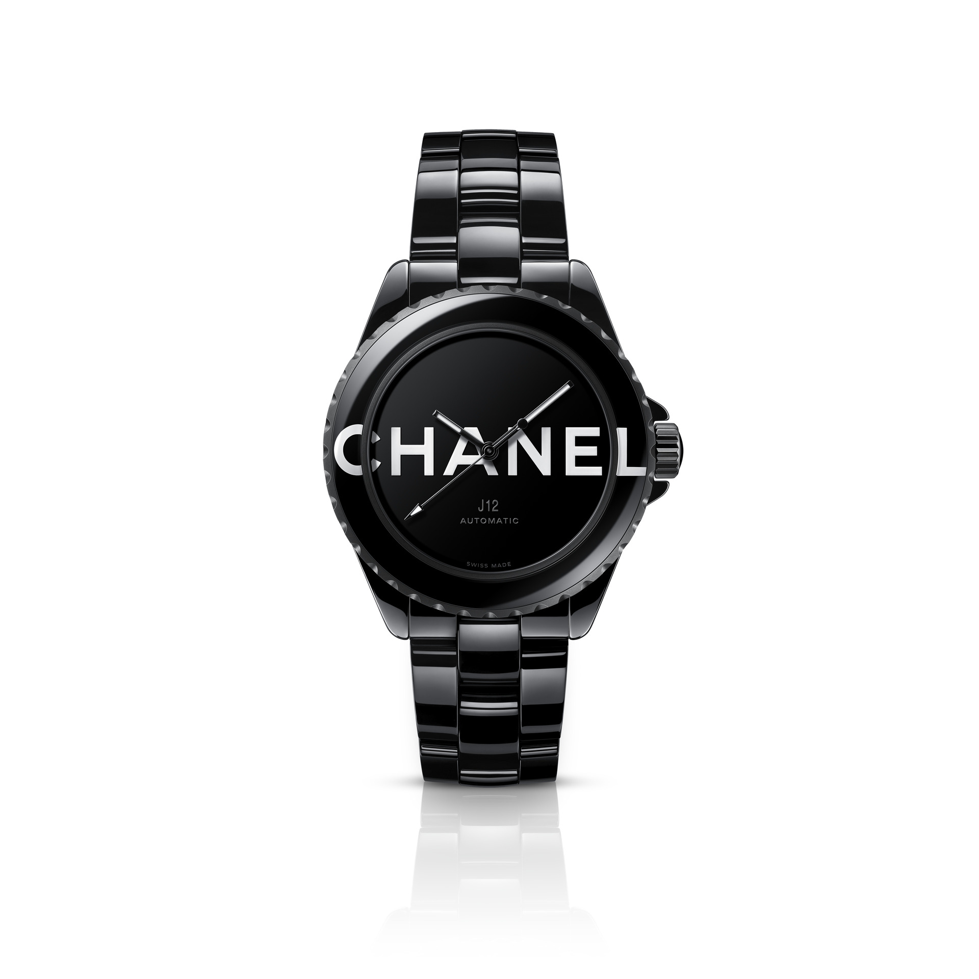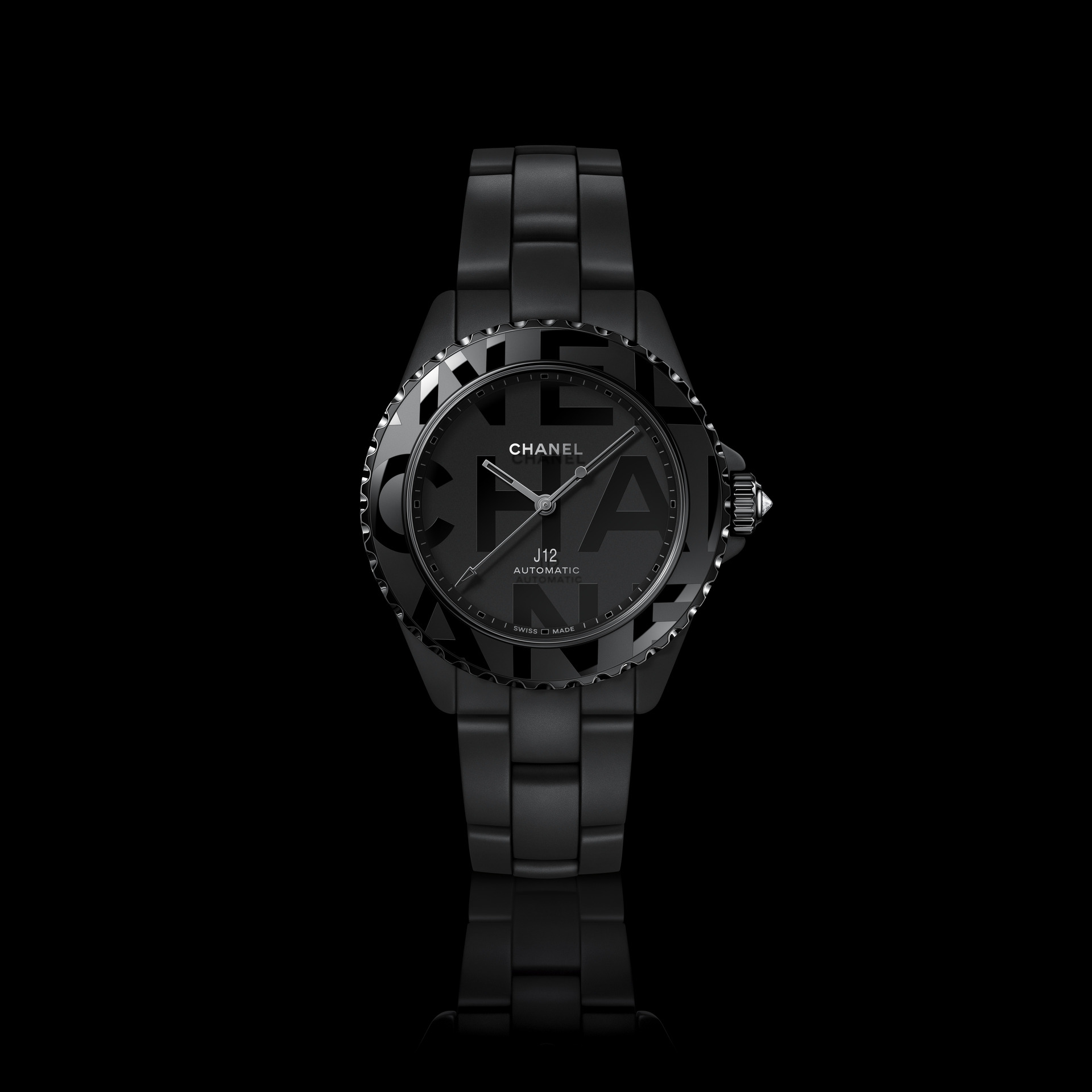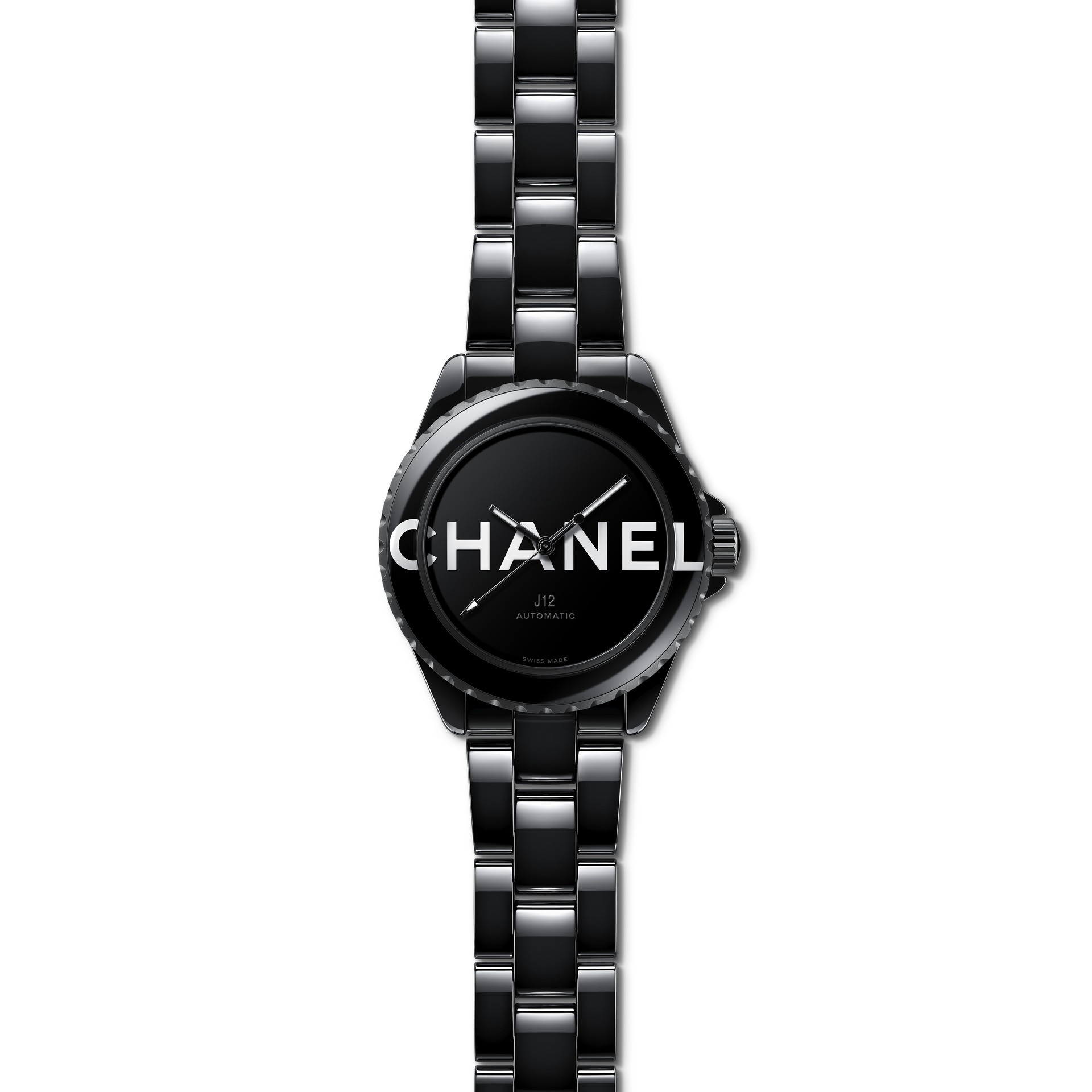 Audacieuse, la montre J12 38 mm se dévoile dans sa robe de céramique noire brillante. Les codes graphiques apposés sur son cadran et sa lunette ont intégralement disparu pour laisser place aux six lettres iconiques de CHANEL qui s’imposent en motif graphique impactant. Blanc sur noir, elles se déploient exagérément hors du cadran et envahissent la lunette.