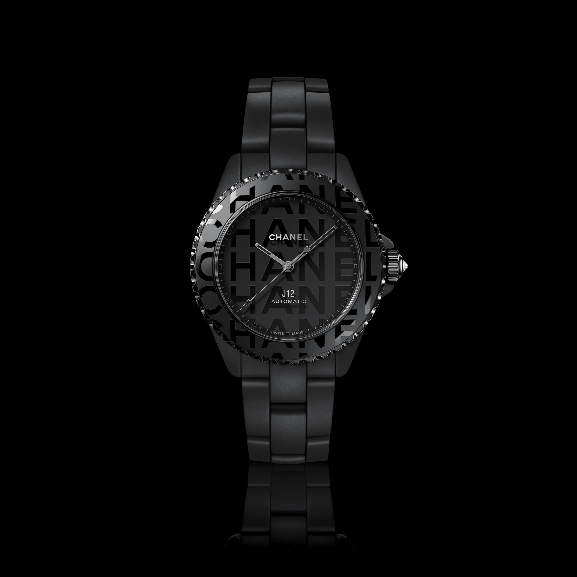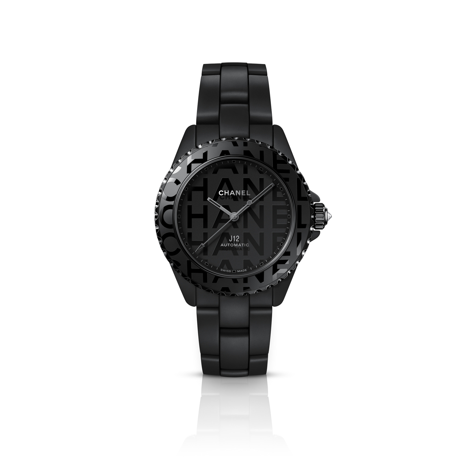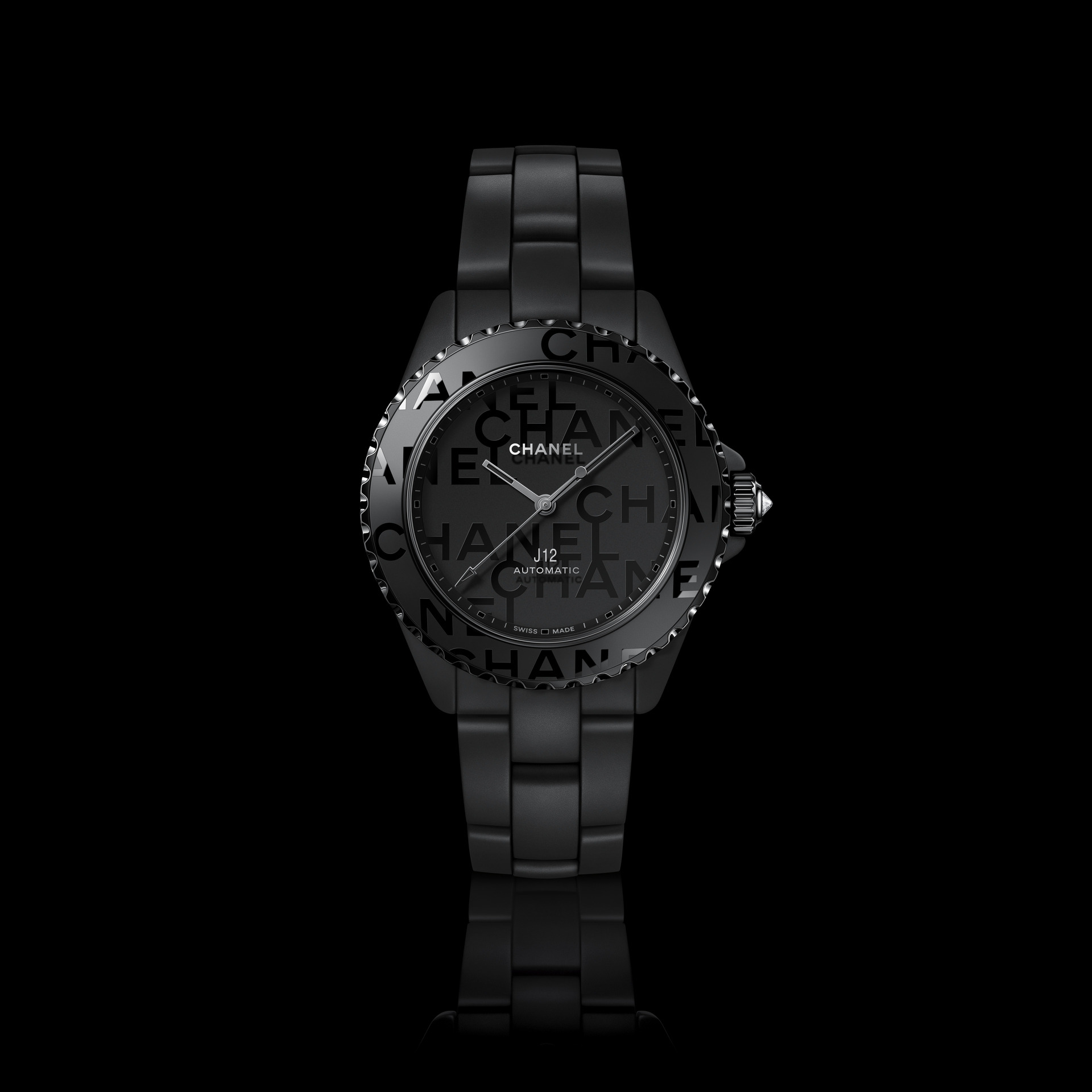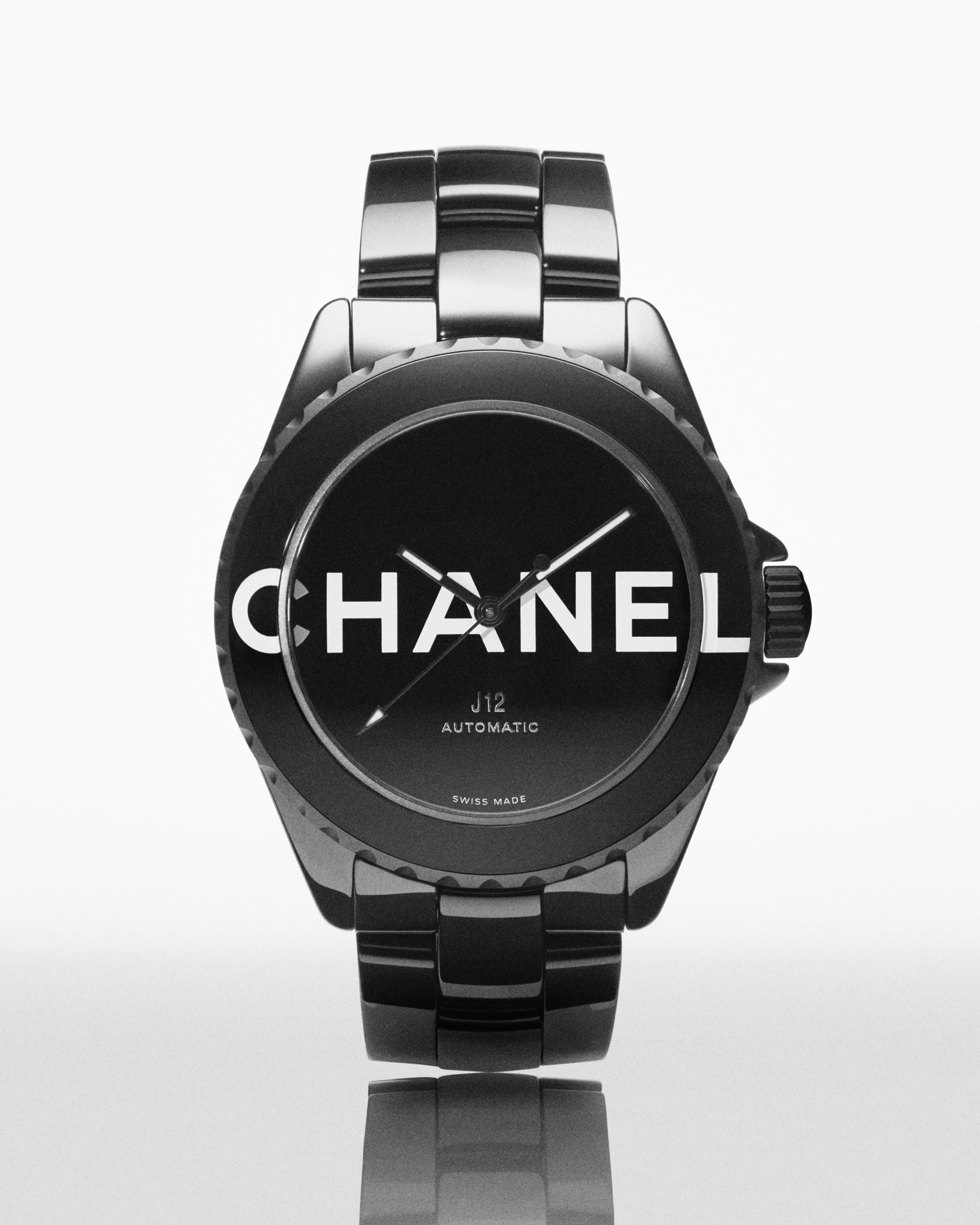Audacieuse, la montre J12 38 mm se dévoile dans sa robe de céramique noire brillante. Les codes graphiques apposés sur son cadran et sa lunette ont intégralement disparu pour laisser place aux six lettres iconiques de CHANEL qui s’imposent en motif graphique impactant. Blanc sur noir, elles se déploient exagérément hors du cadran et envahissent la lunette.