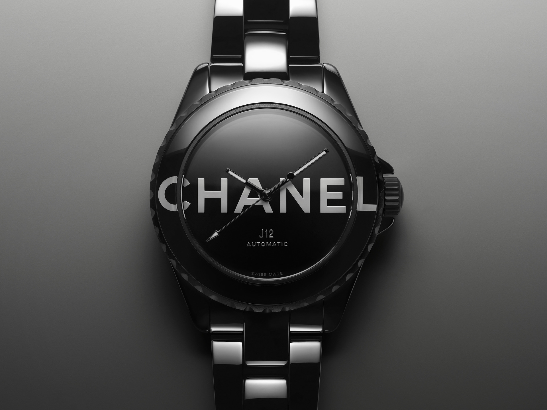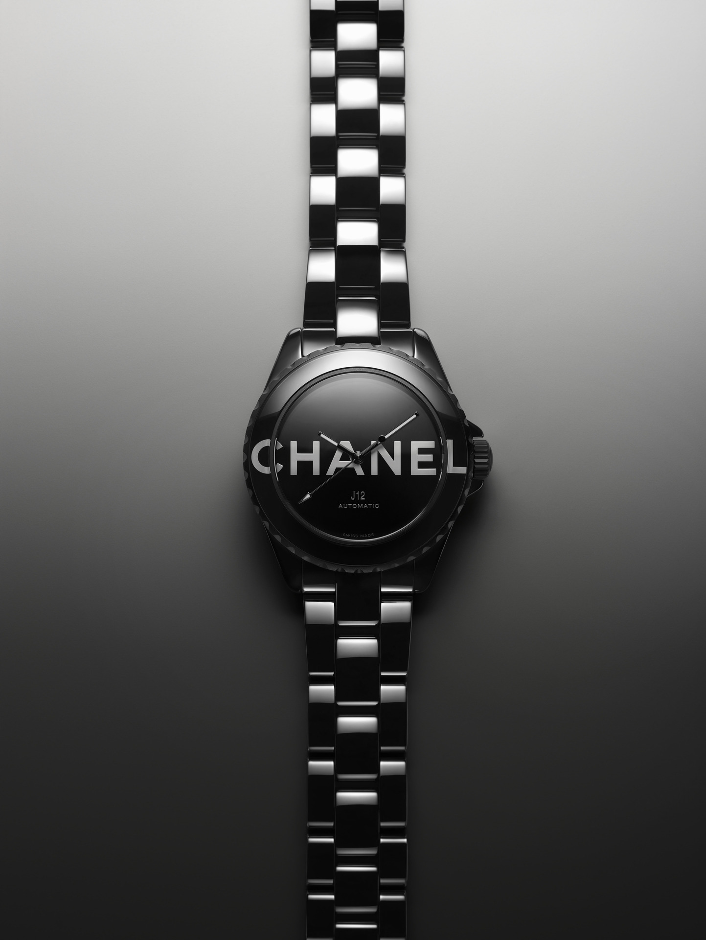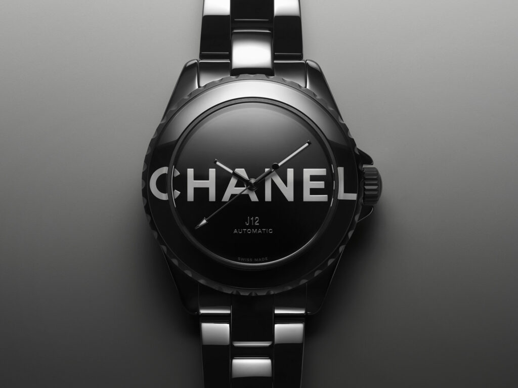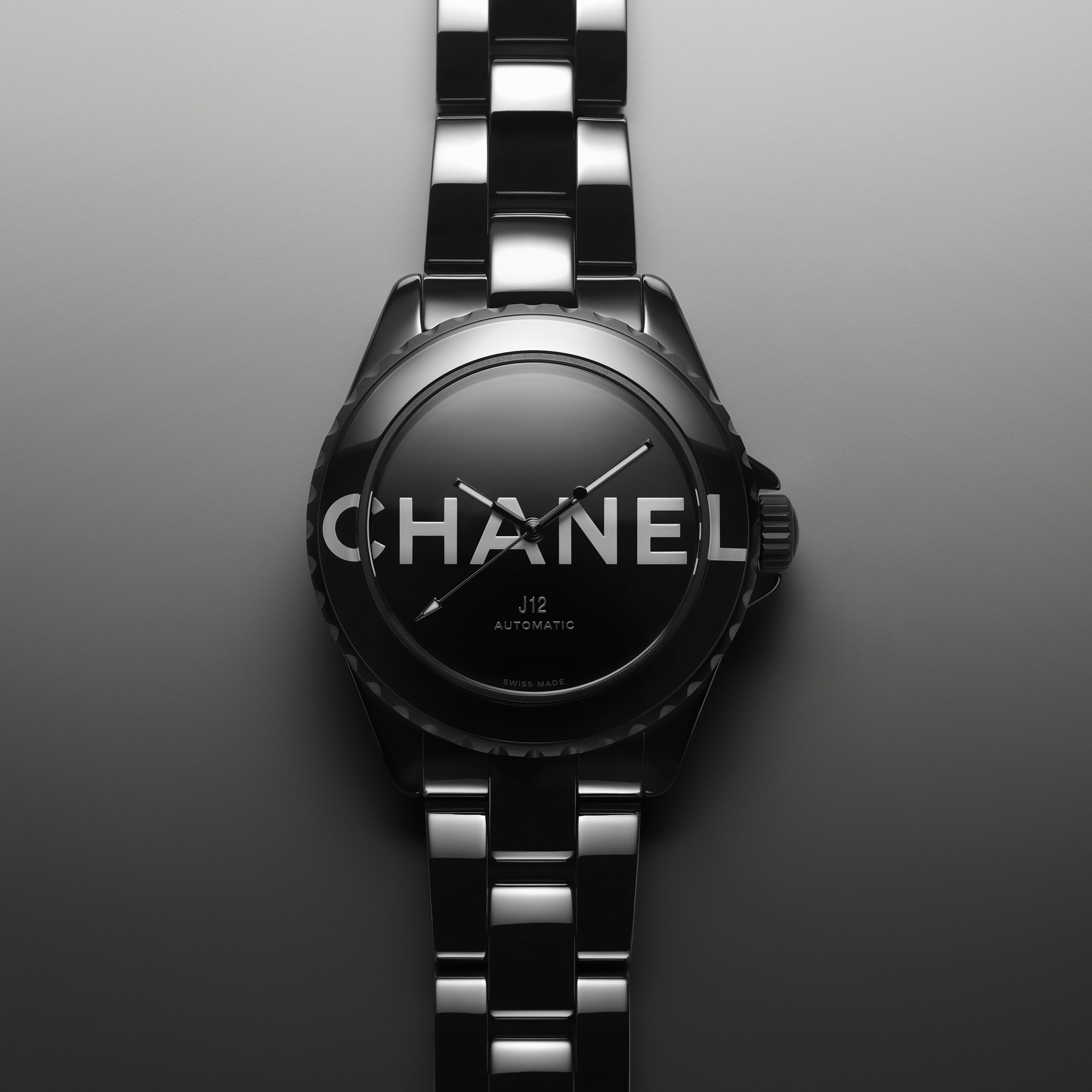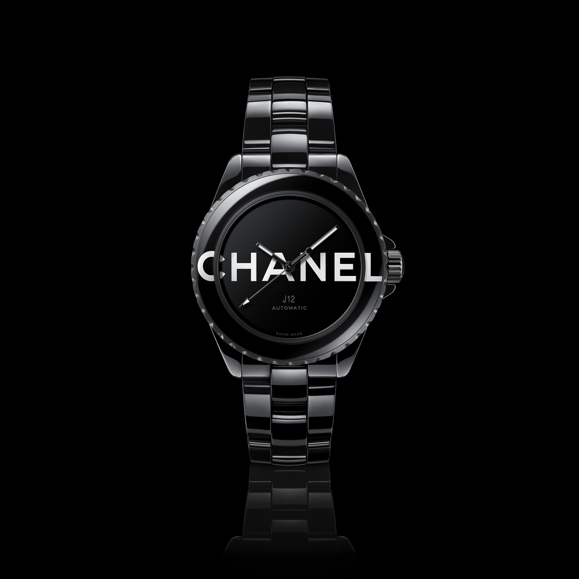 Audacieuse, la montre J12 38 mm se dévoile dans sa robe de céramique noire brillante. Les codes graphiques apposés sur son cadran et sa lunette ont intégralement disparu pour laisser place aux six lettres iconiques de CHANEL qui s’imposent en motif graphique impactant. Blanc sur noir, elles se déploient exagérément hors du cadran et envahissent la lunette.