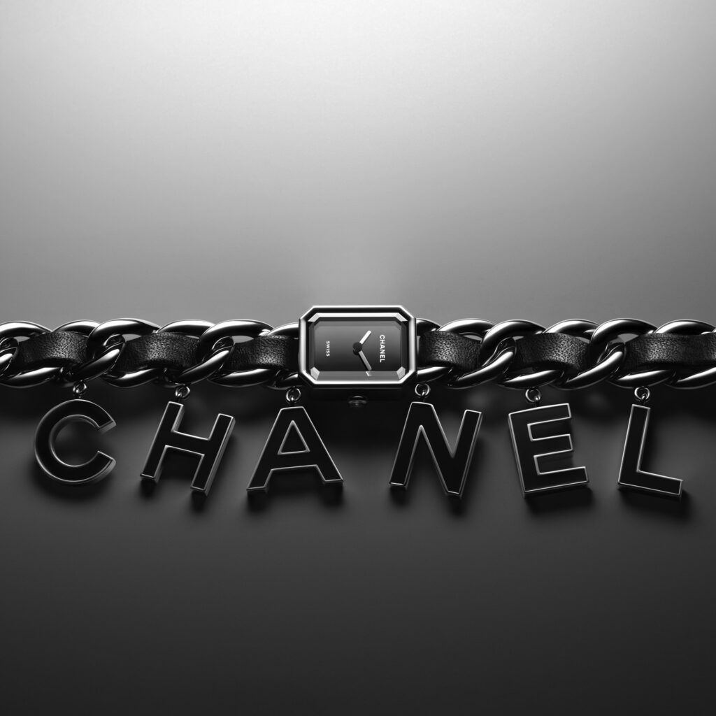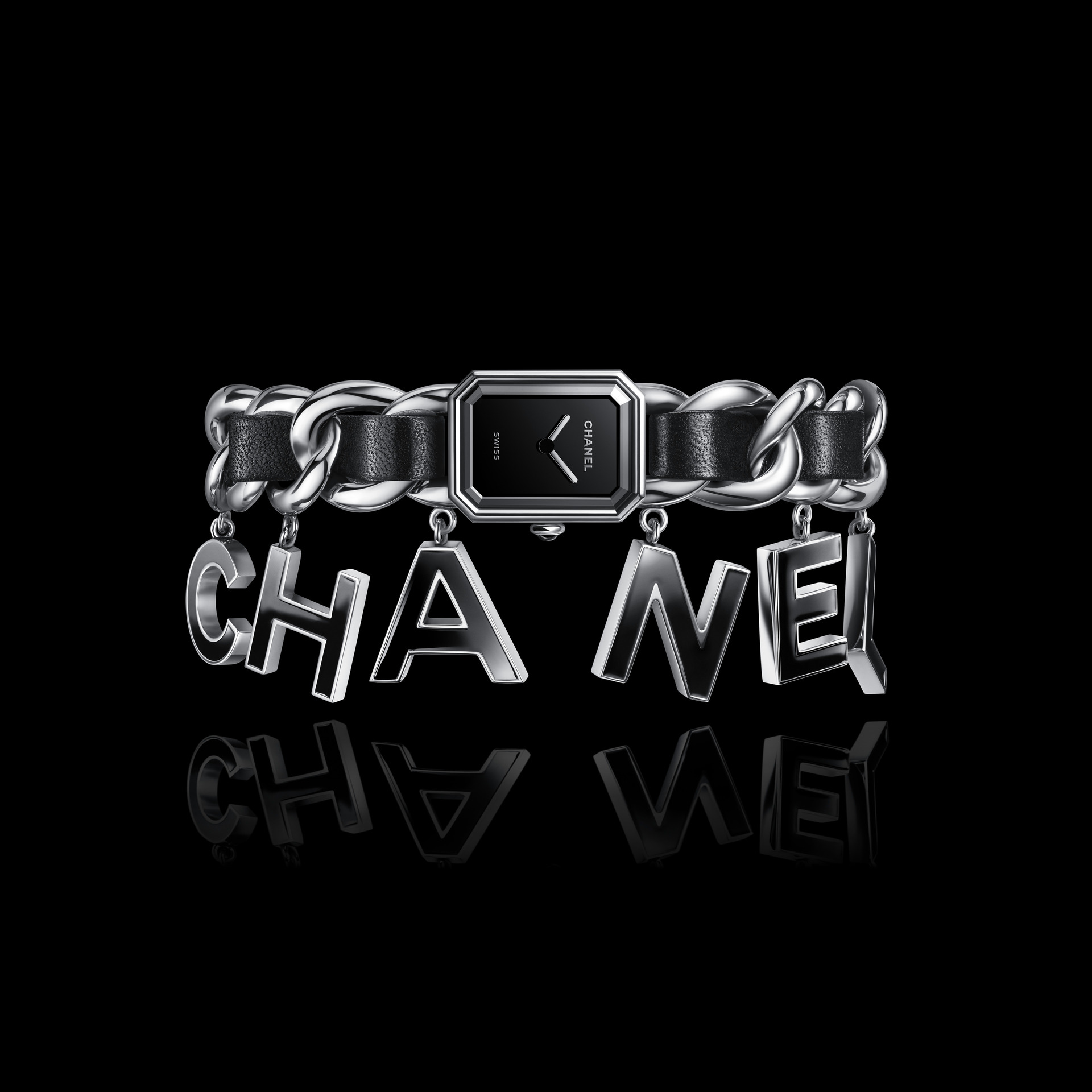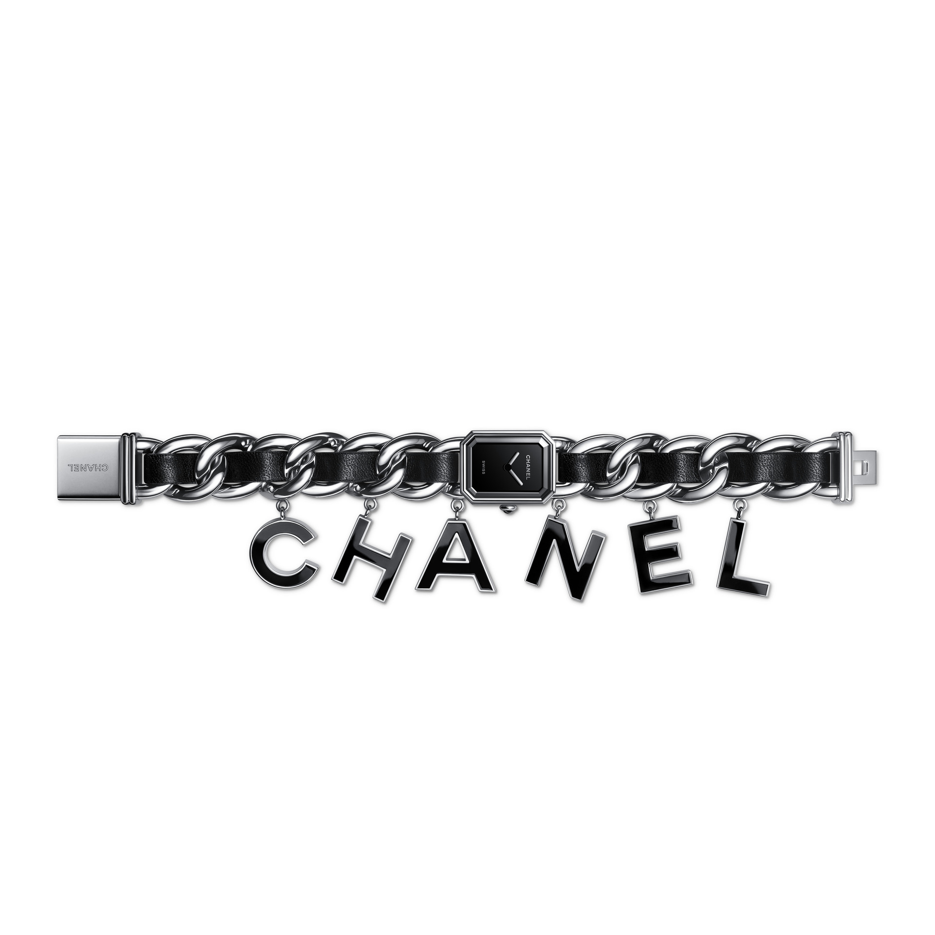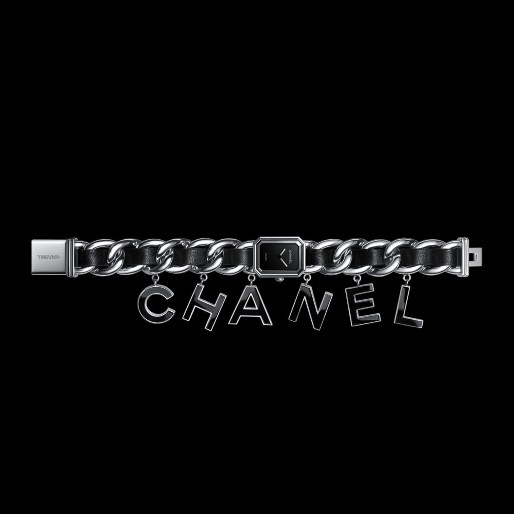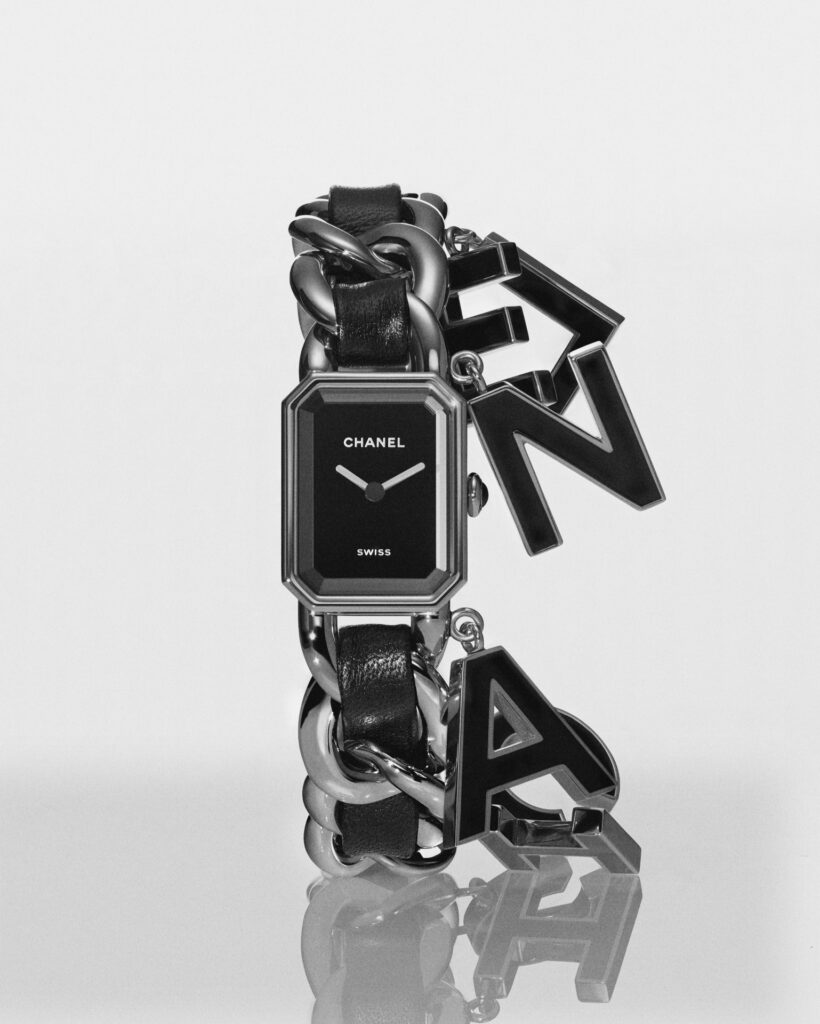 Suspendues à la chaîne gourmette de la montre Première, six pampilles lettres « CHANEL »