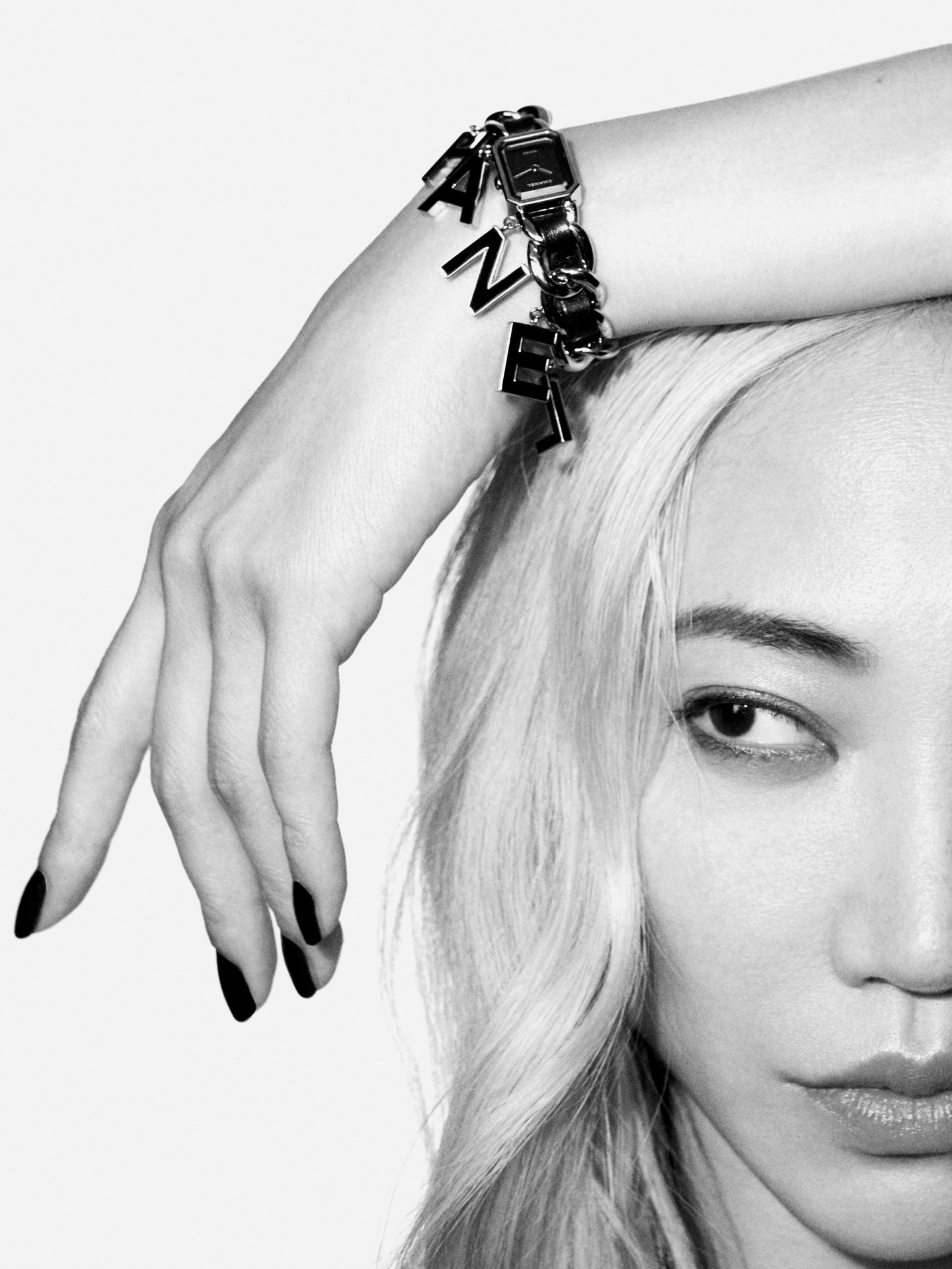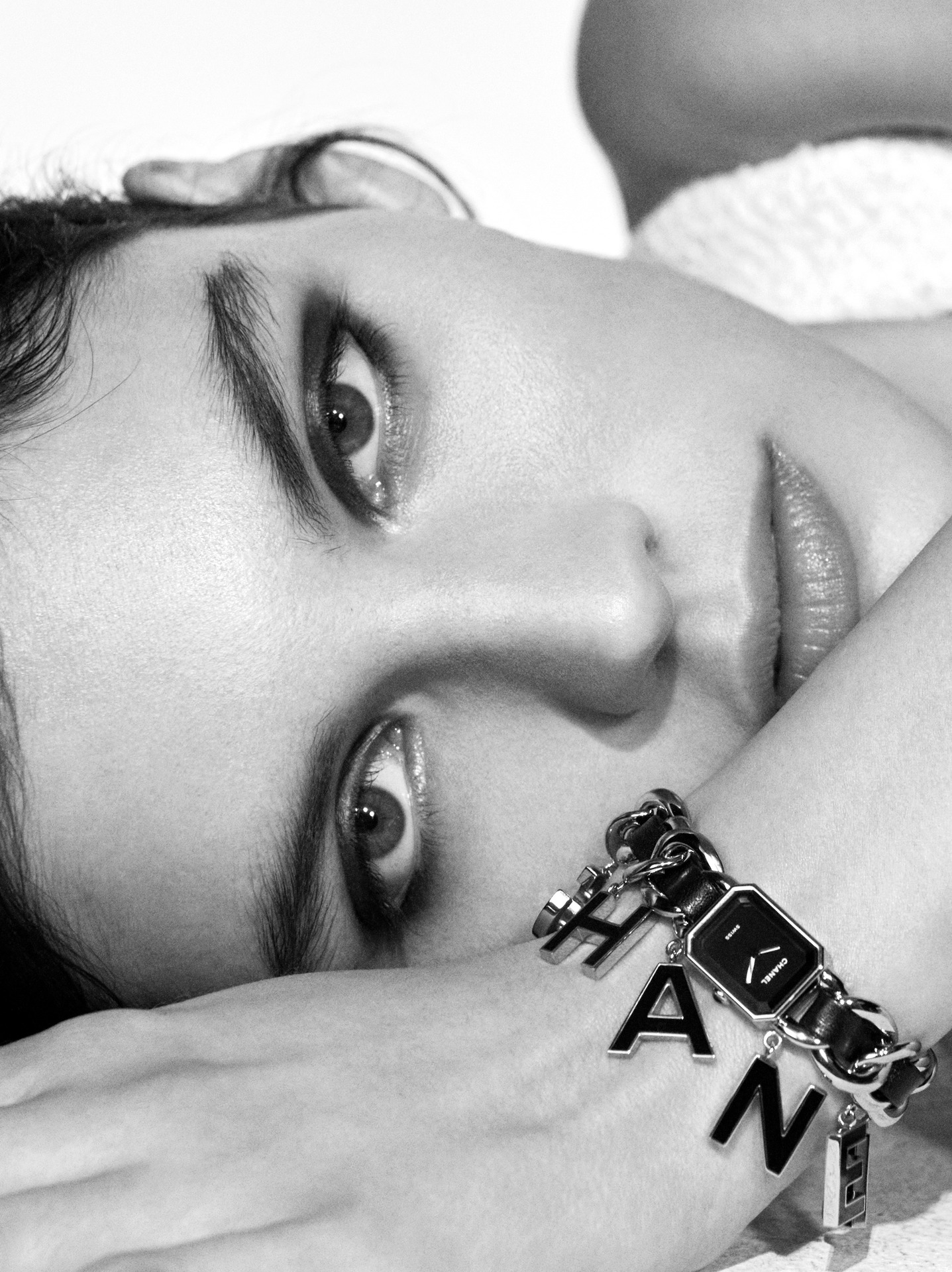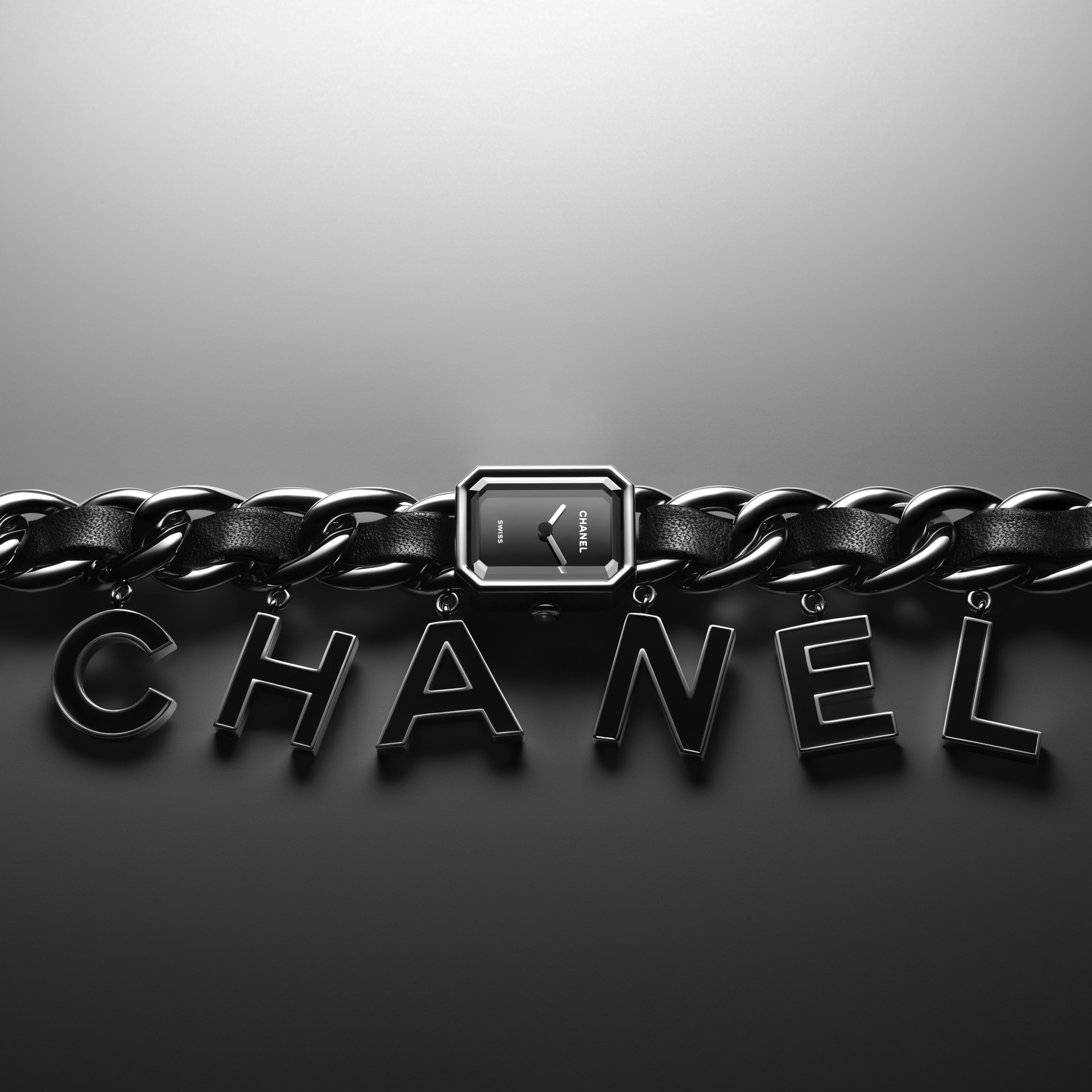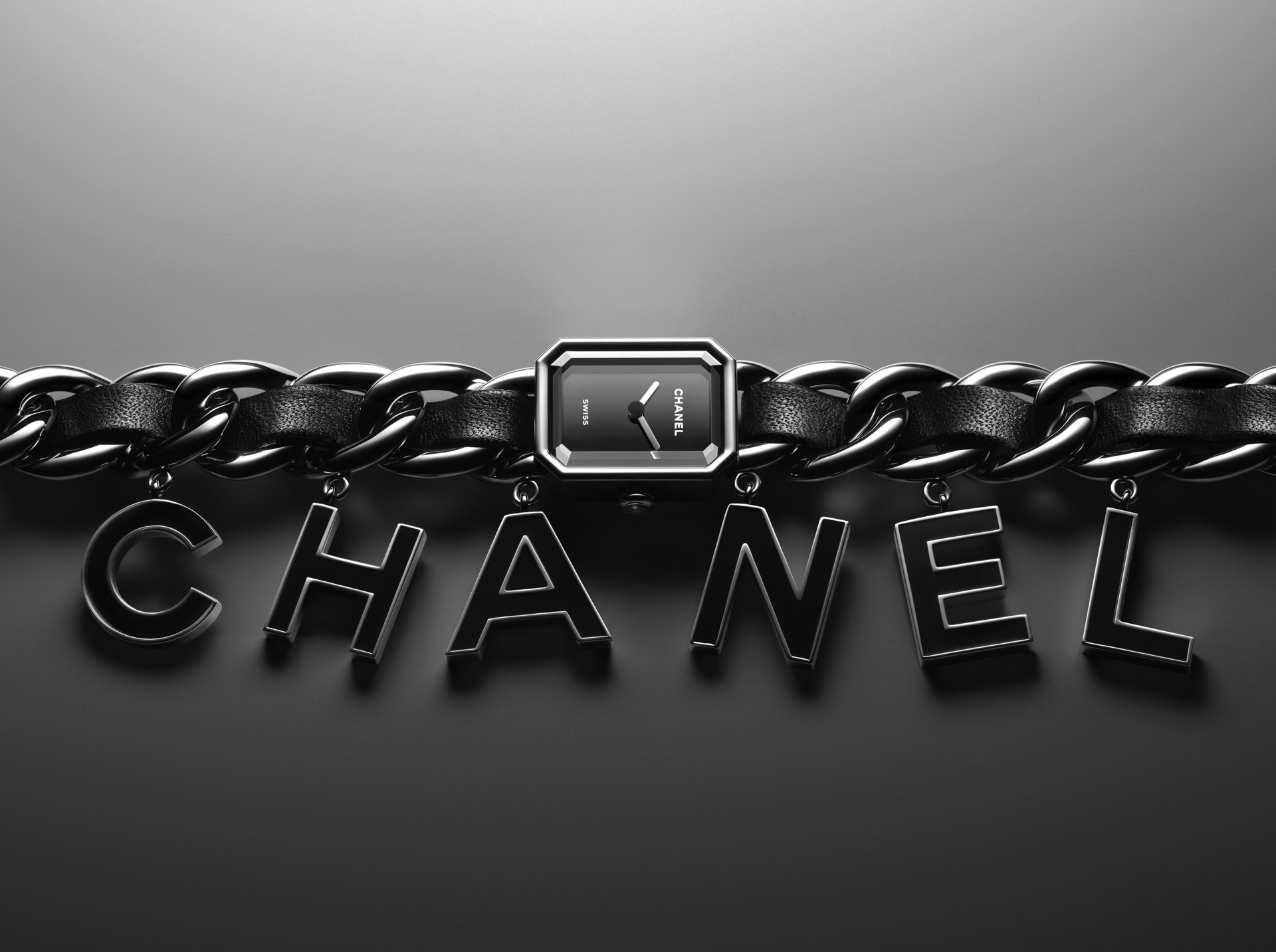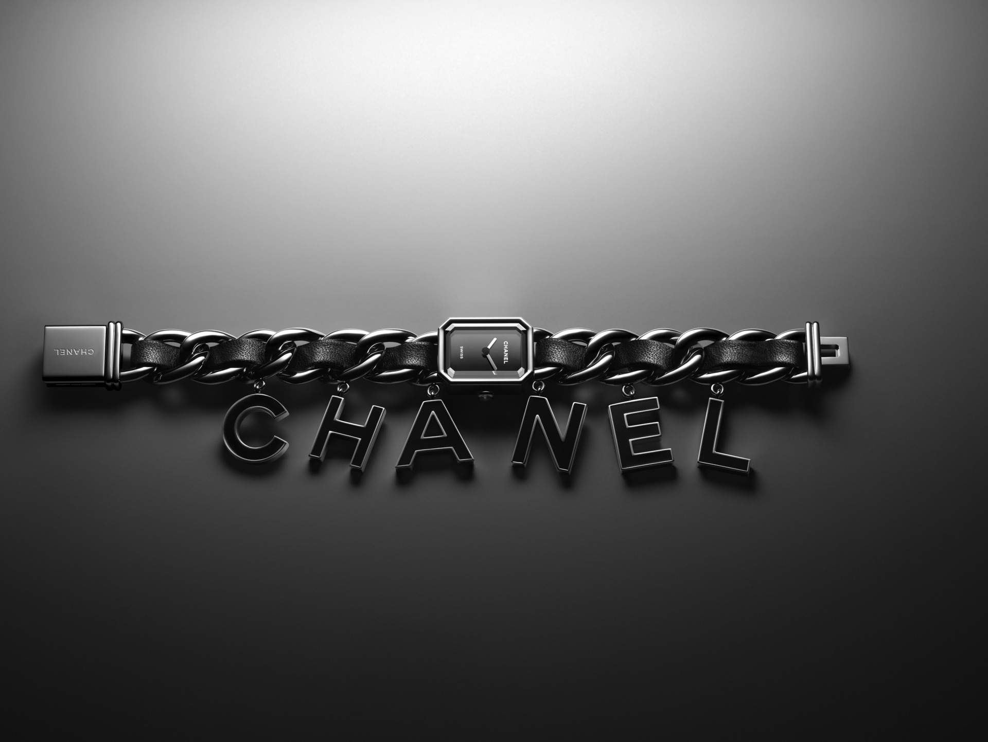 Suspendues à la chaîne gourmette de la montre Première, six pampilles lettres « CHANEL »
