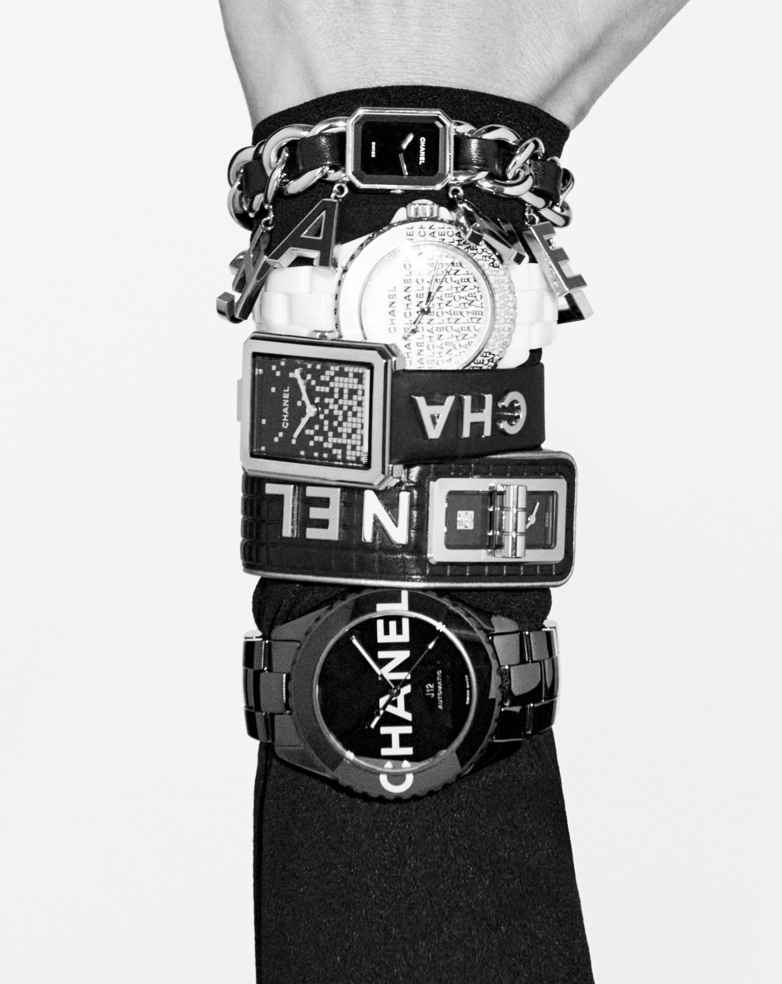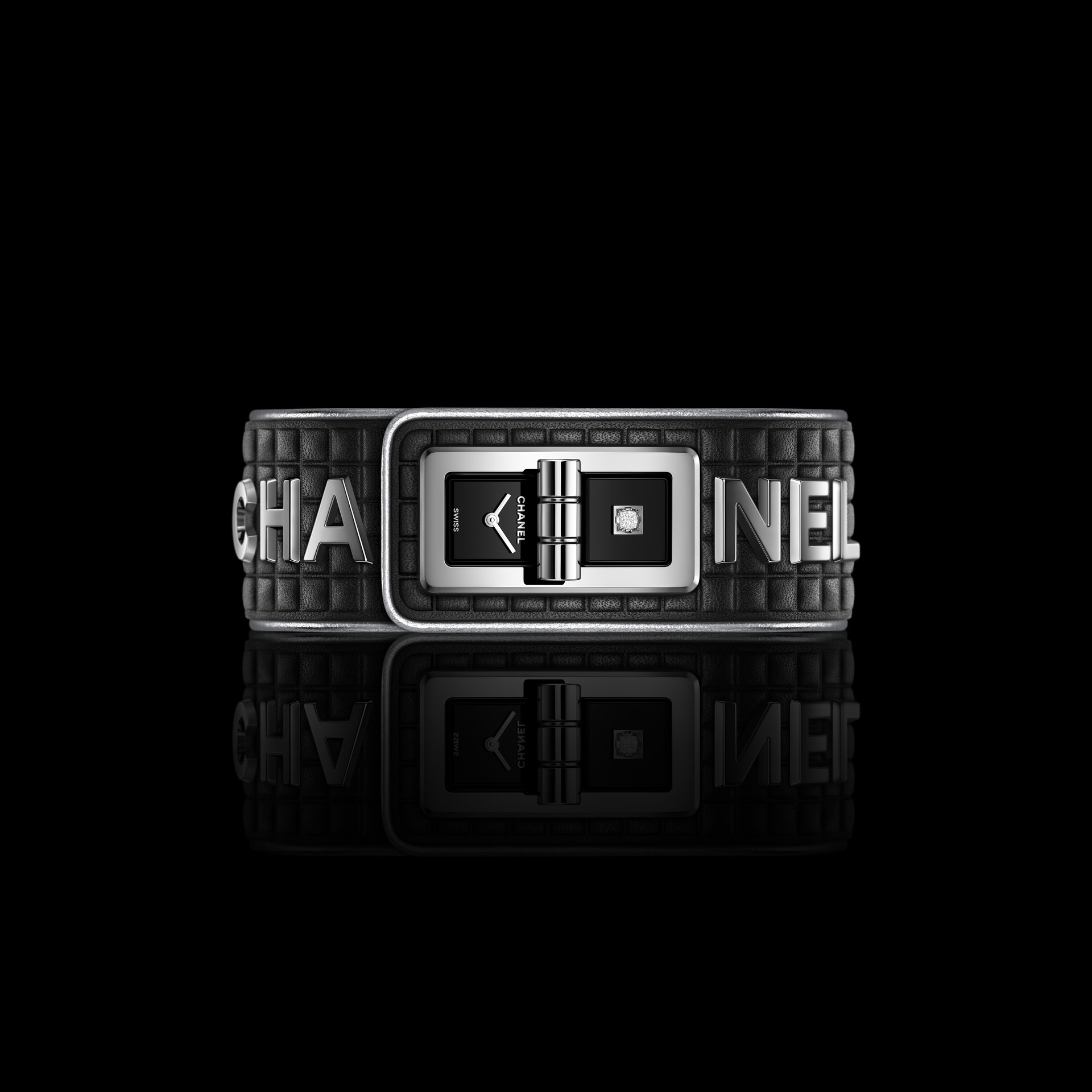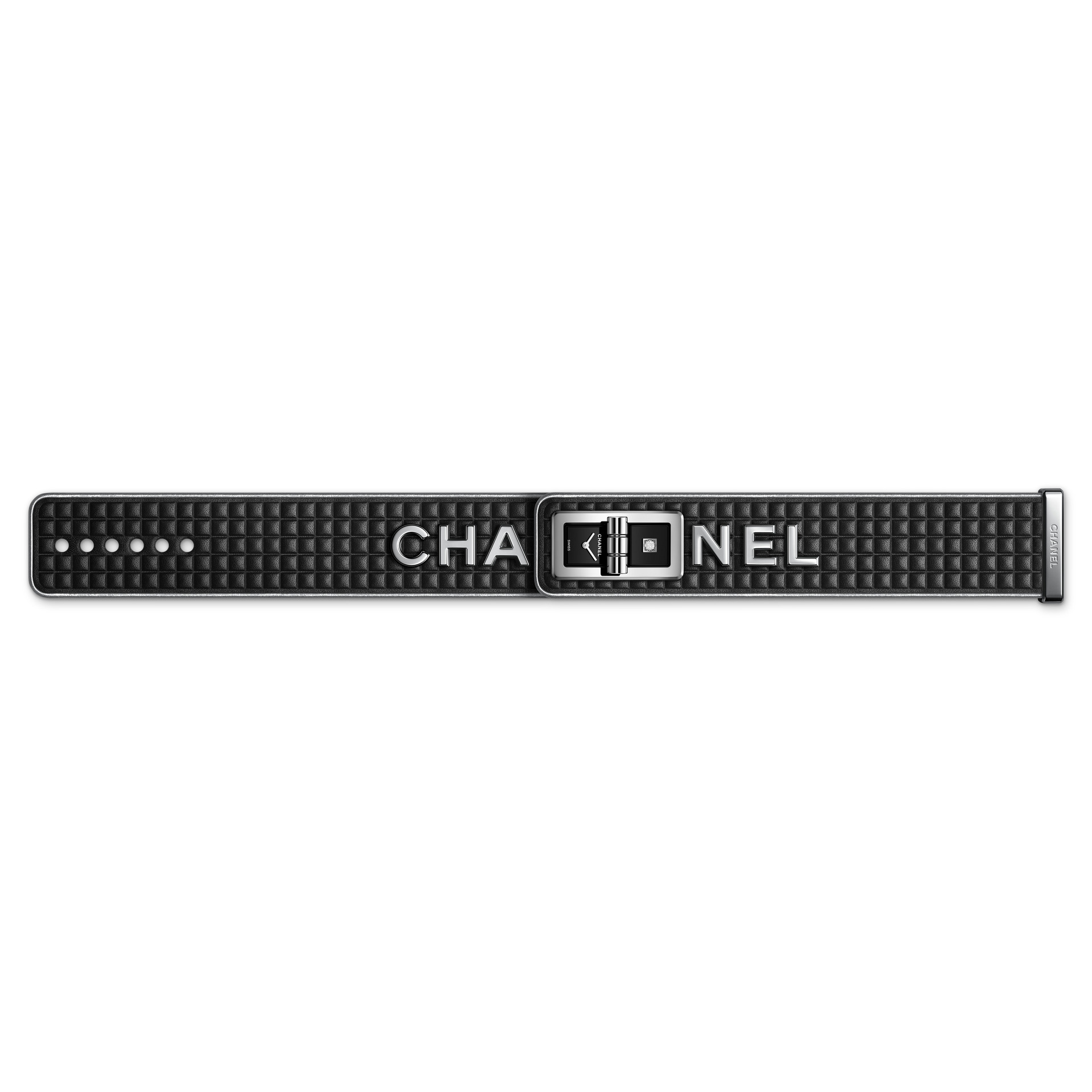 Cette création adopte le graphisme impactant des six lettres qui ponctuent le ruban de cuir de son bracelet. L’heure est à la démesure d’un look rock affirmé où les lettres qui forment CHANEL résonnent tel un emblème.