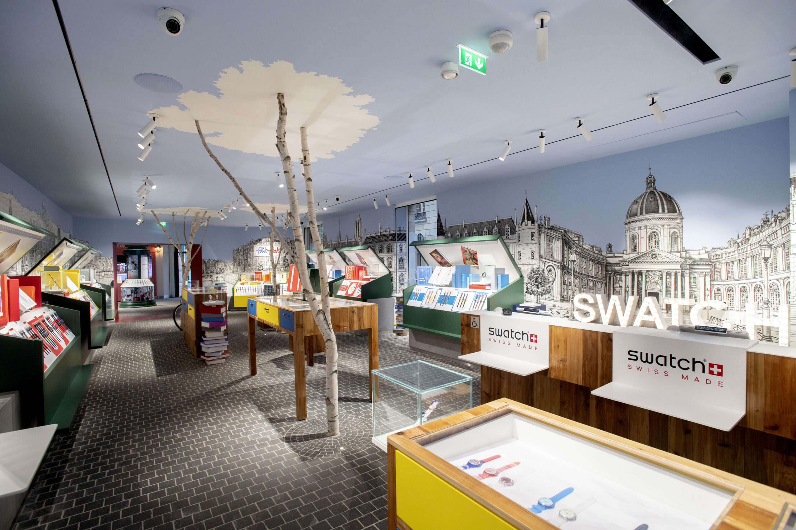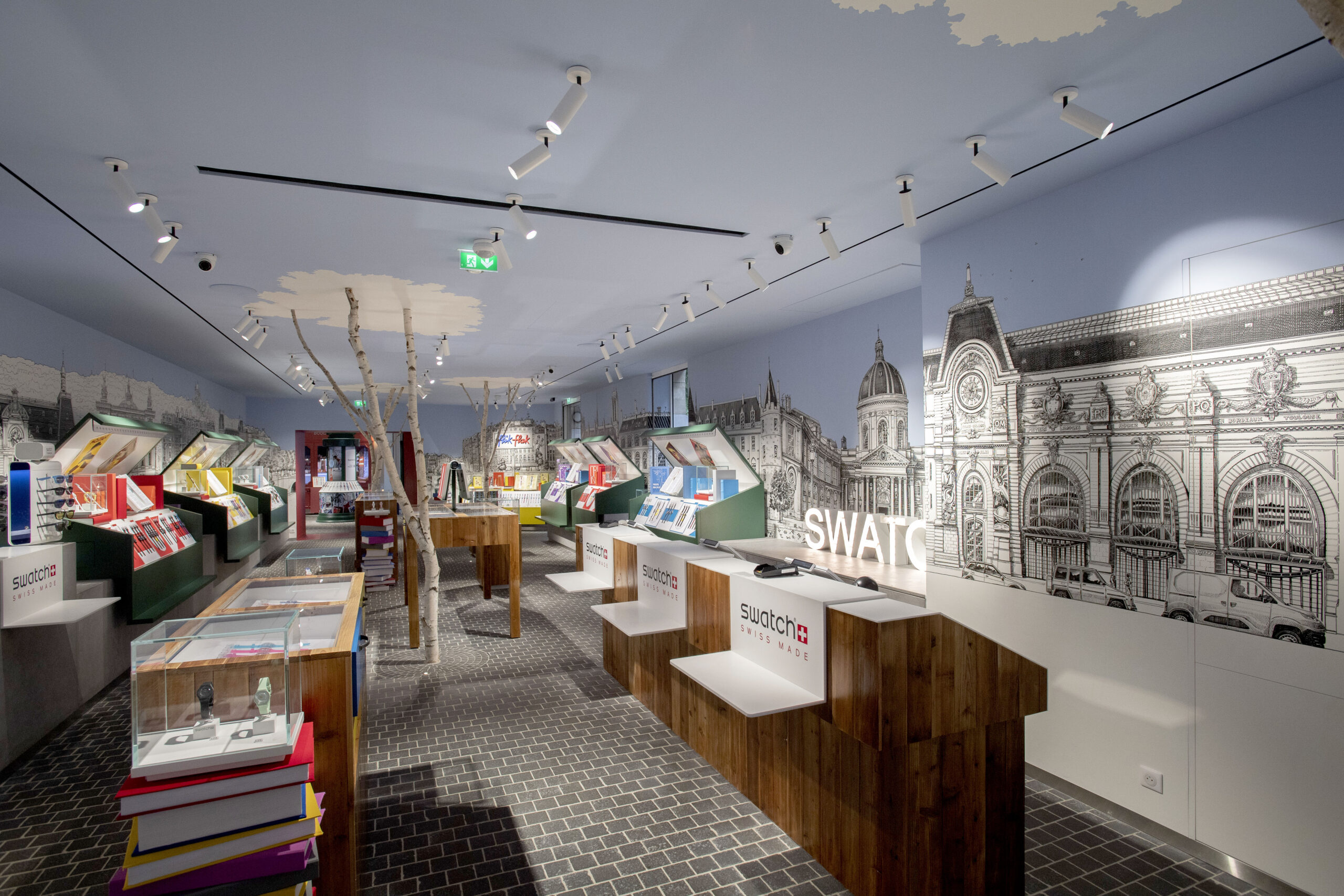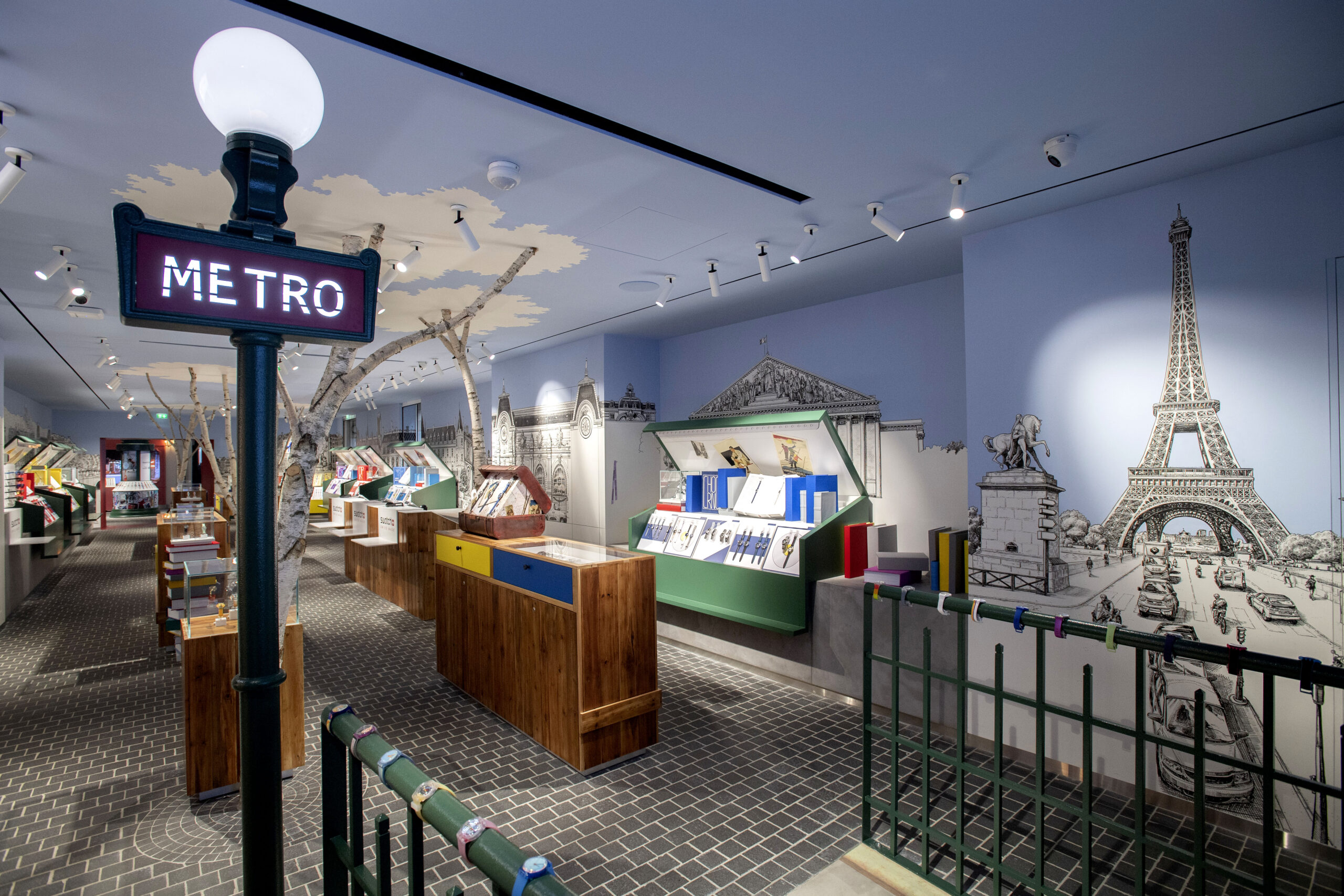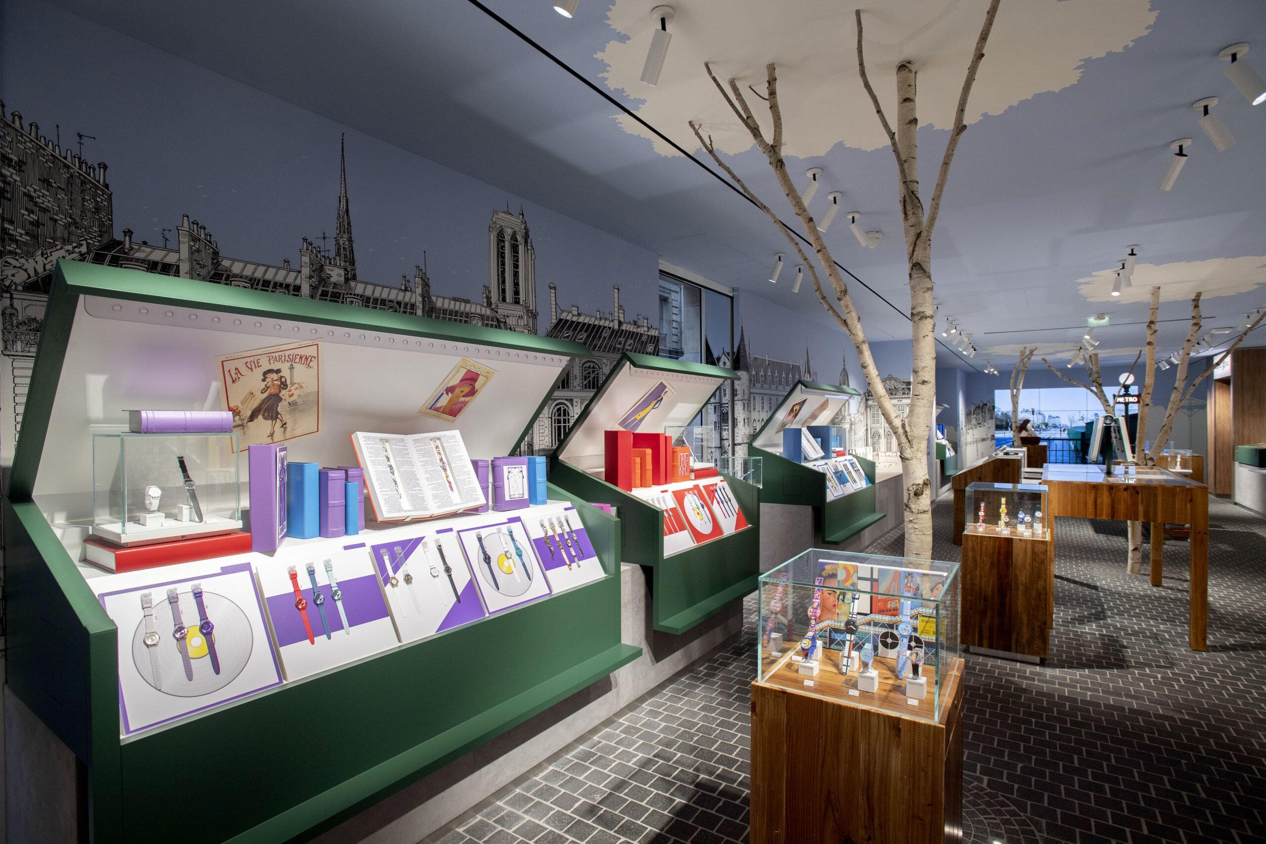 Lorsque les badauds s’aventurent dans le reste de la boutique en passant sous une grande arche rouge, ils déambulent sur un sol pavé entre les arbres véritables et le mobilier en bois. Des quais de Seine sont occupés par des stands de bouquinistes pour exposer les montres. Les murs sont décorés par une fresque illustrée monumentale réalisée à la main par le talentueux artiste Thomas Dartigues, alias Decktwo.