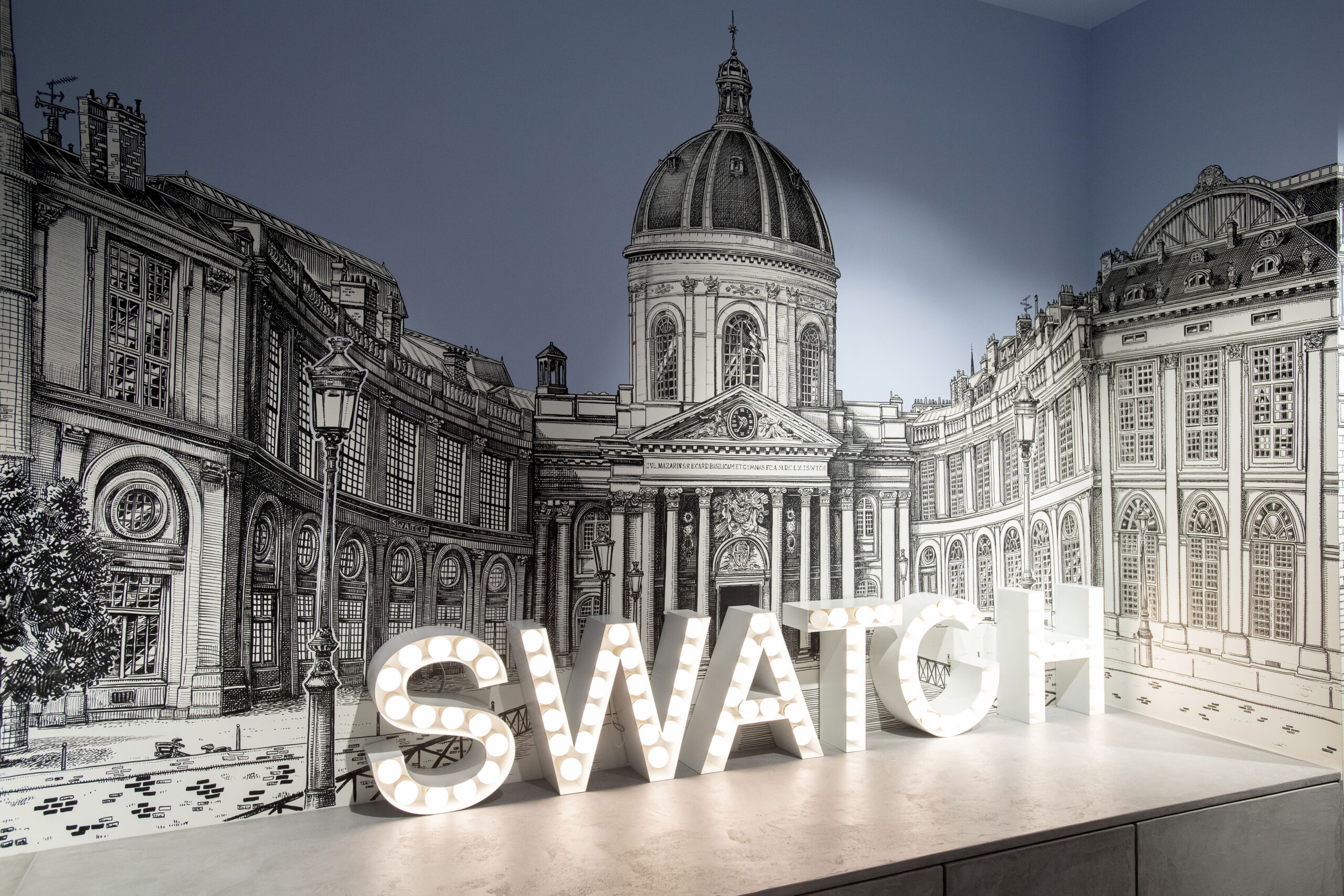 Swatch offre une vision enchantée de Paris où les visiteurs flânent dans les rues pavées de la ville, admirent les vitrines généreuses des petits commerces de proximité et admirent la vue historique des berges de la Seine…tout cela au sein même du Megastore des Champs-Elysées !