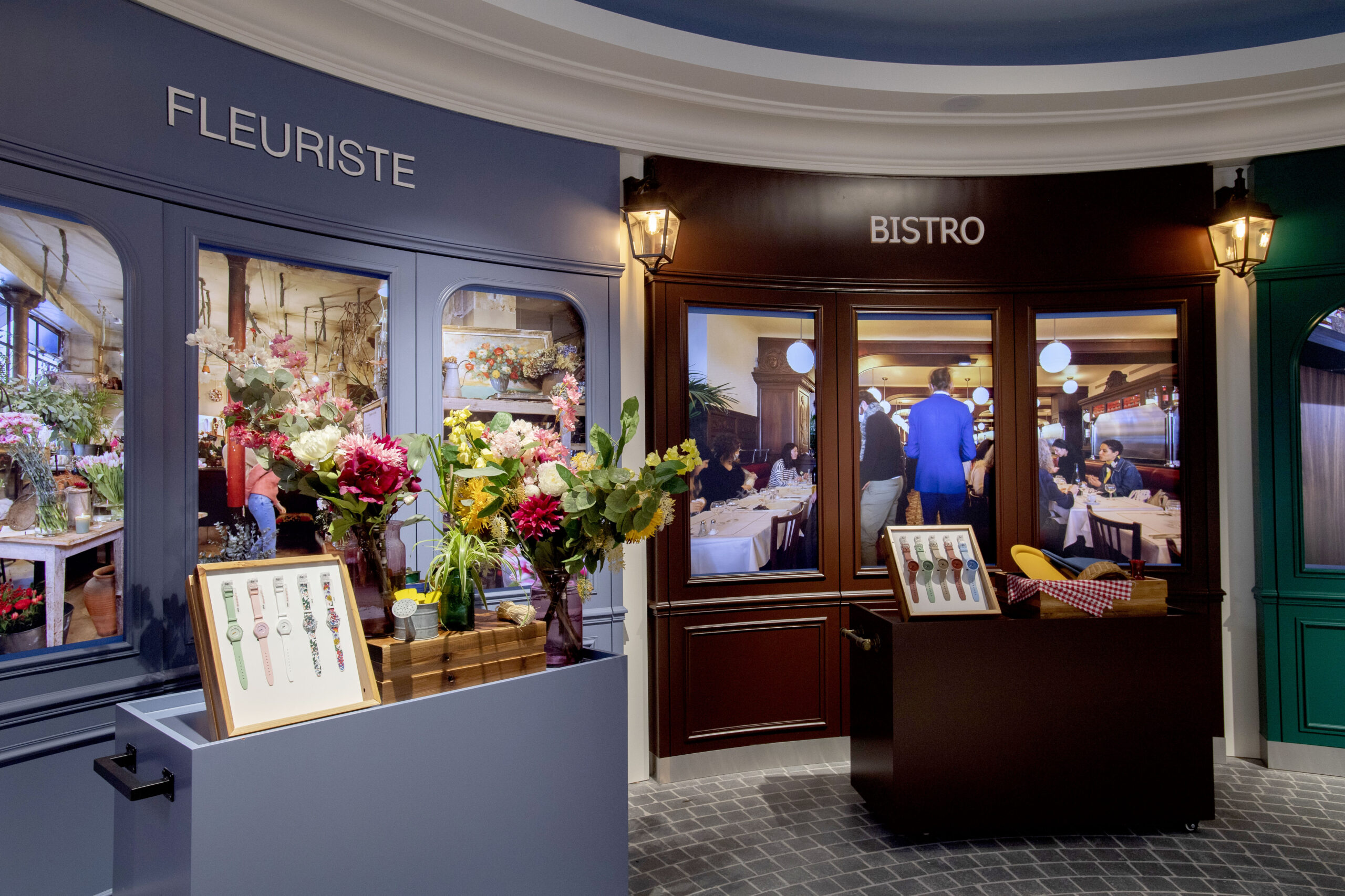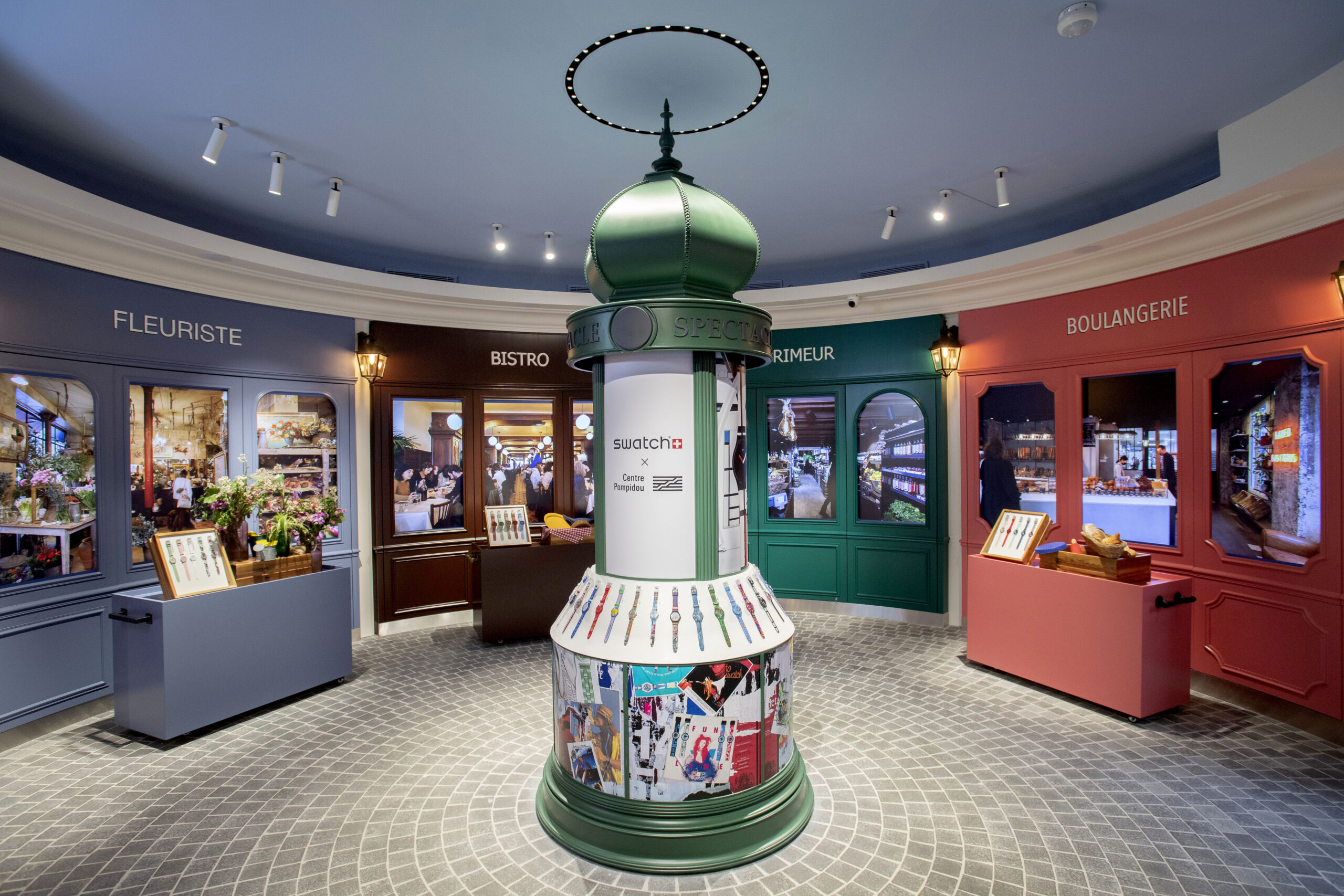 La marque suisse s’inspire de ce qui fait de Paris la capitale de l’art, de la mode, de la gastronomie et de la culture. A l’entrée principale, la Rotonde se pare de devantures de boutiques allant du bistrot au fleuriste en passant par le primeur, le fromager, le boulanger et le cordonnier. Des écrans digitaux diffusent des vidéos qui mettent en scène des commerçants de la Ville de Paris pour une expérience immersive. Au centre, une colonne Morris, mobilier emblématique du paysage parisien, affiche les dernières nouveautés de Swatch.