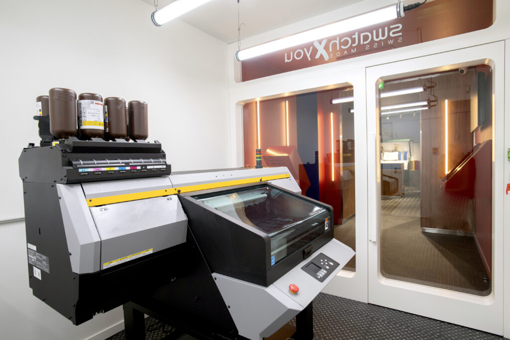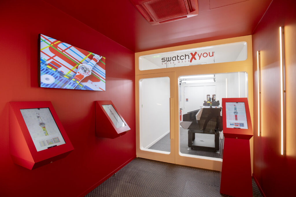 Au fond du magasin, Swatch maintient l’illusion avec un écran géant qui diffuse une vue de Paris derrière une bouche de métro qui marque l’arrêt, direction la créativité avec Swatch X You. A l’instar d’un Speakeasy, les curieux passent le rideau d’un photomaton trompe-l’œil pour entrer dans une salle dédiée à la personnalisation. Le corner Swatch X You permet aux visiteurs de créer une Swatch personnalisée à partir de motifs éphémères ou permanents et ceux disponibles uniquement dans ce flagship. Les clients peuvent ensuite assister à l’impression et à l’assemblage de leur montre en quelques minutes : quelle expérience !