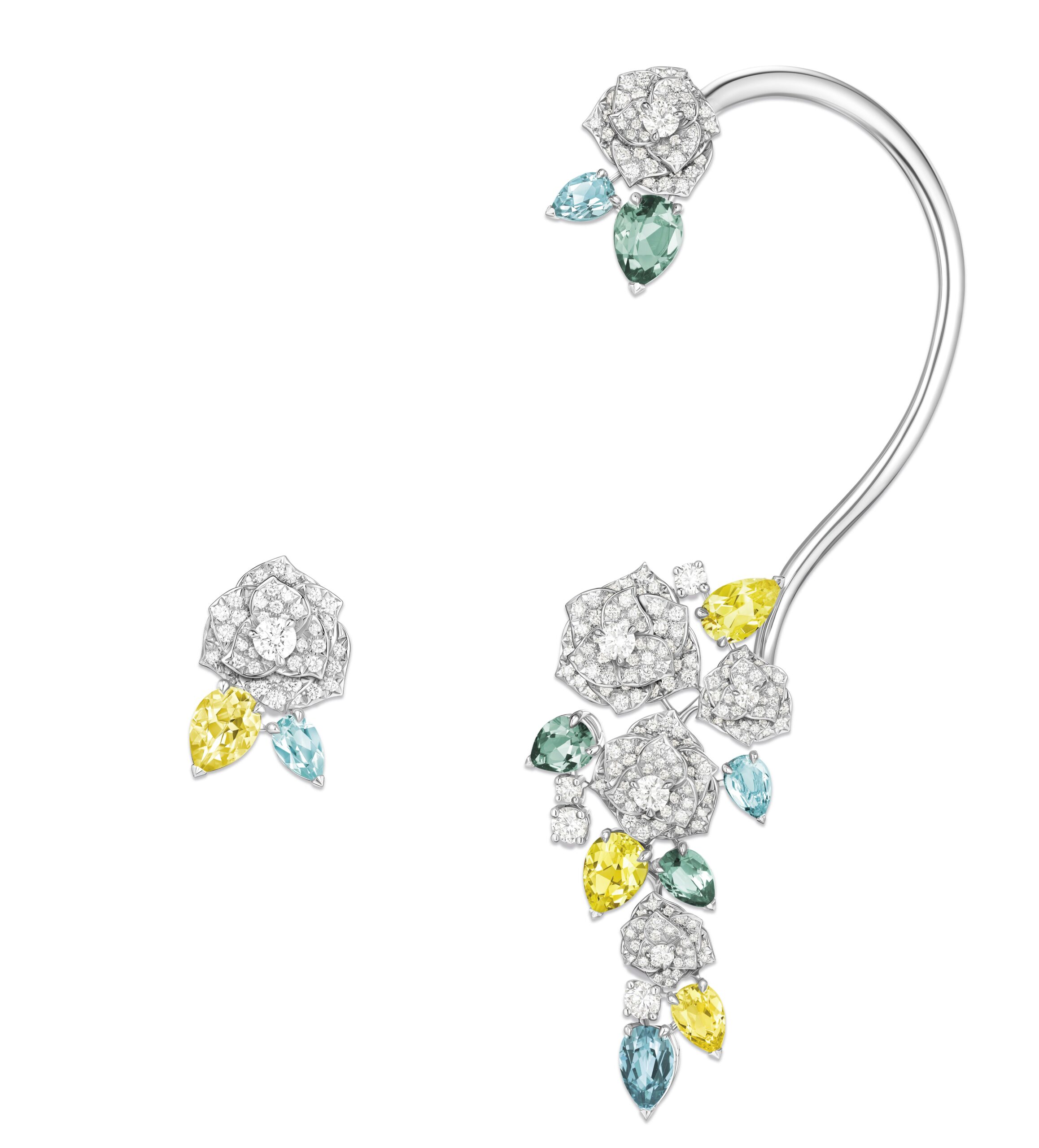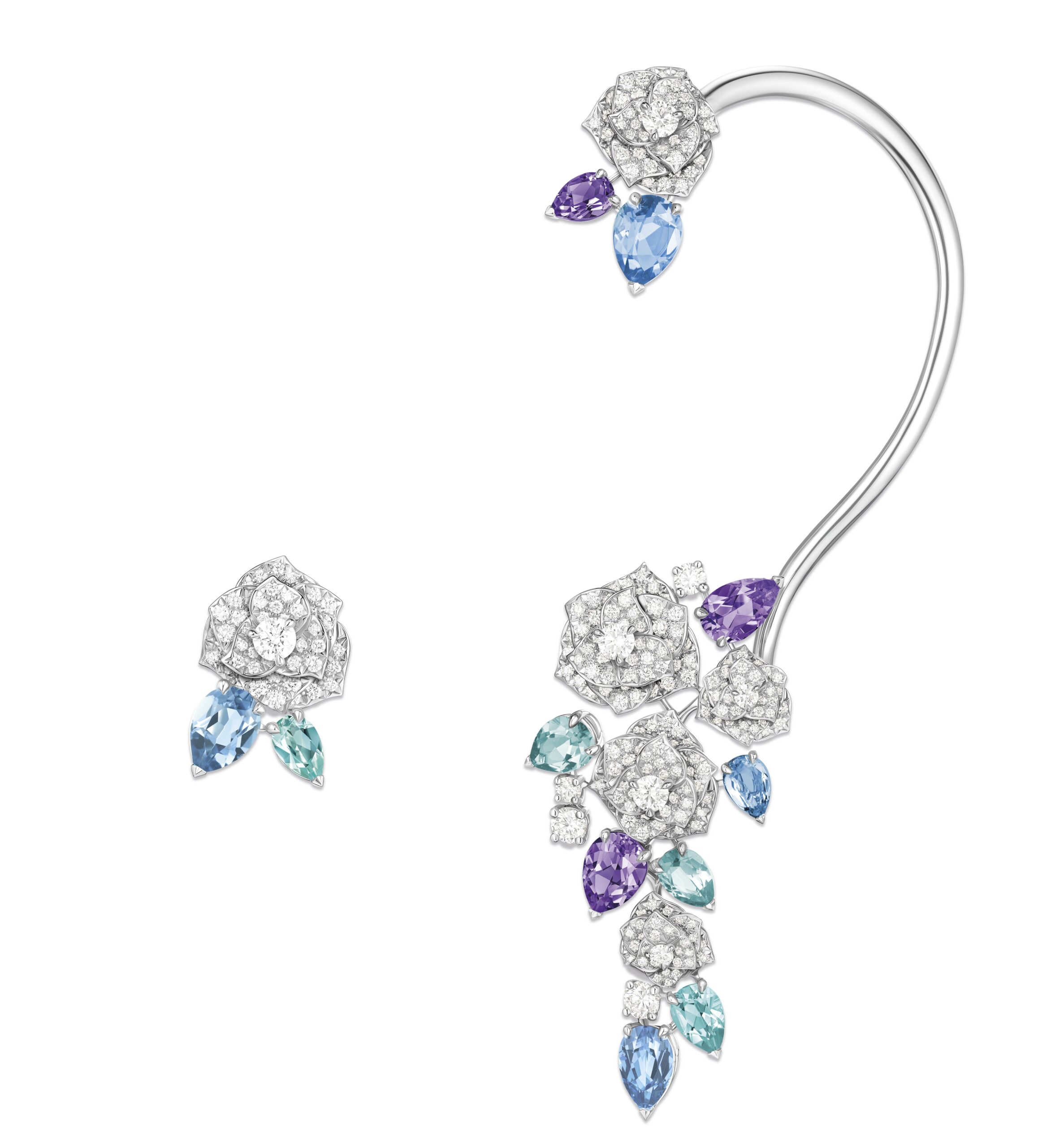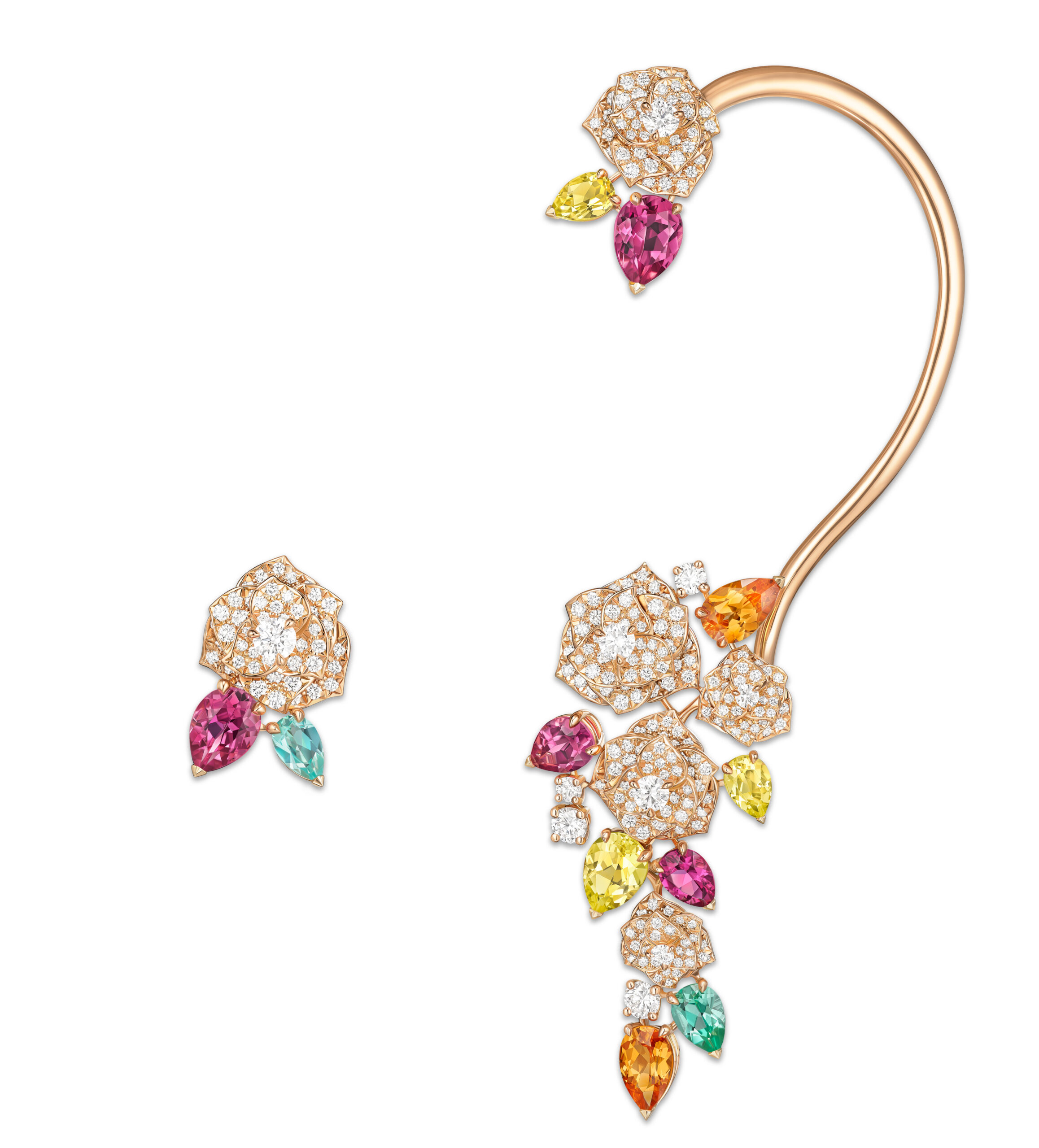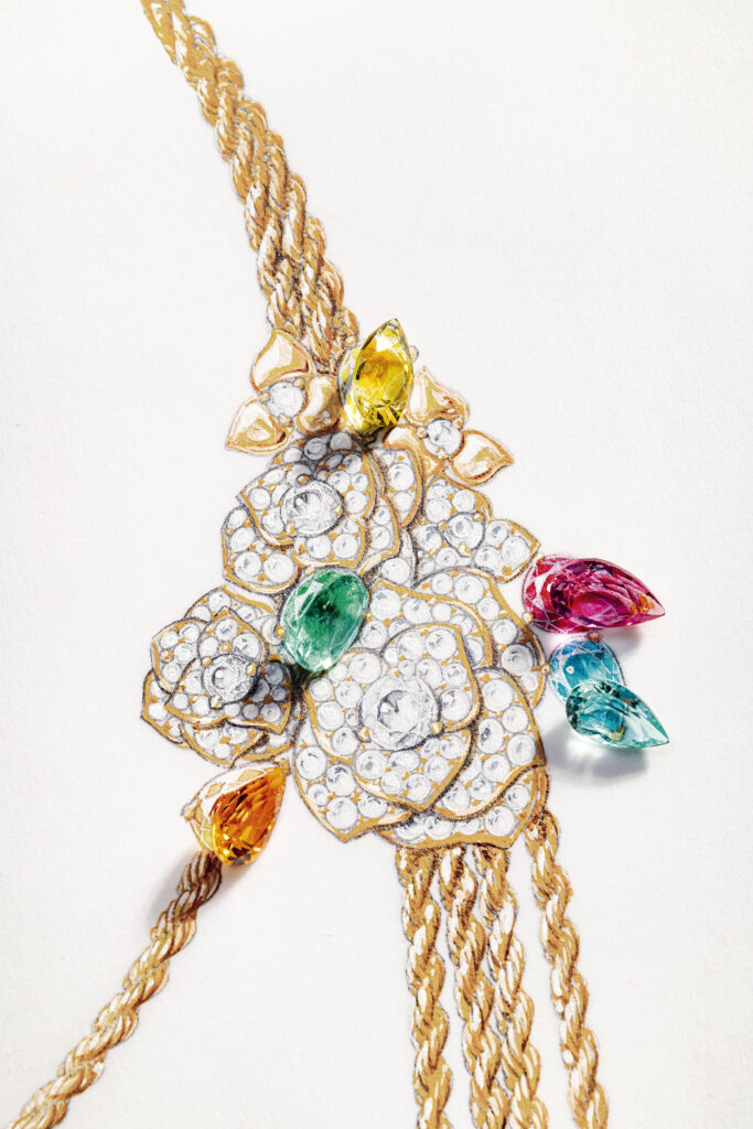 Yves Piaget est un homme de contrastes et de bon goût, aussi passionné pour les beaux-arts que pour l’artisanat et l’excellence. Il y a quelques décennies, il avait l’immense honneur de rassembler non seulement ses amis, mais également la Piaget Society tout entière autour de son art, autour d’une rose. Depuis lors, de la Côte-aux-Fées à la Côte d’Azur, précurseurs, artistes, penseurs, hédonistes hauts en couleur, et personnages en quête incessante de beauté et de plaisir, ont fait de la reine des fleurs le symbole du raffinement et de la joie. Pour fêter le 40e anniversaire de la rose Yves Piaget, la Maison fait briller la beauté pure et l’audace de la rose dans trois nouvelles parures. L’orfèvrerie de Piaget y est sublimée par des pierres colorées minutieusement sélectionnées par nos créateurs et nos gemmologues. Véritable foisonnement d’extravagance, la parure en or rose, composée d’une manchette d’oreille originale, d’une bague et d’un collier d’exception, contraste avec les deux autres parures inspirées par les délicates variations chromatiques du jardin d’Yves Piaget.
