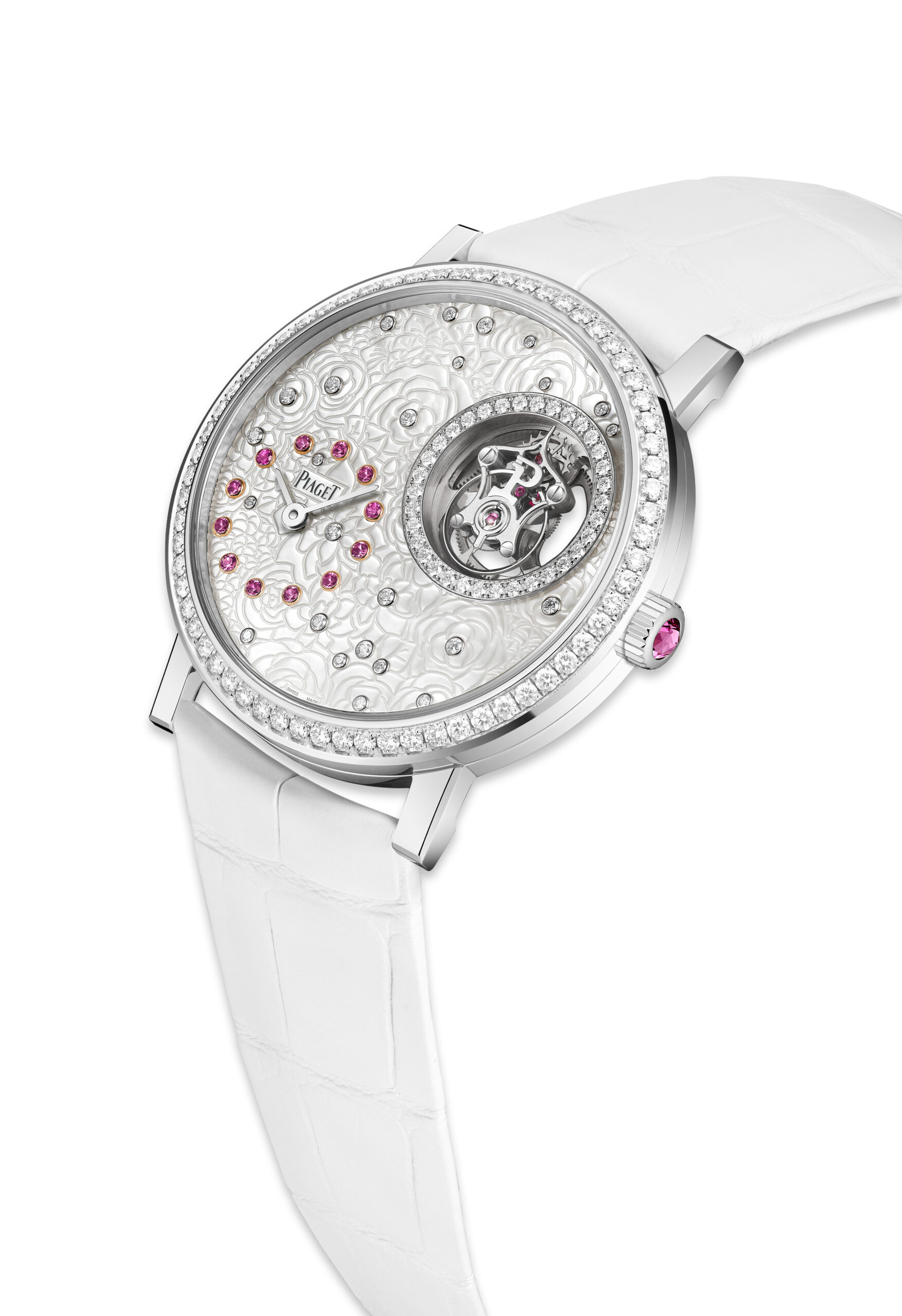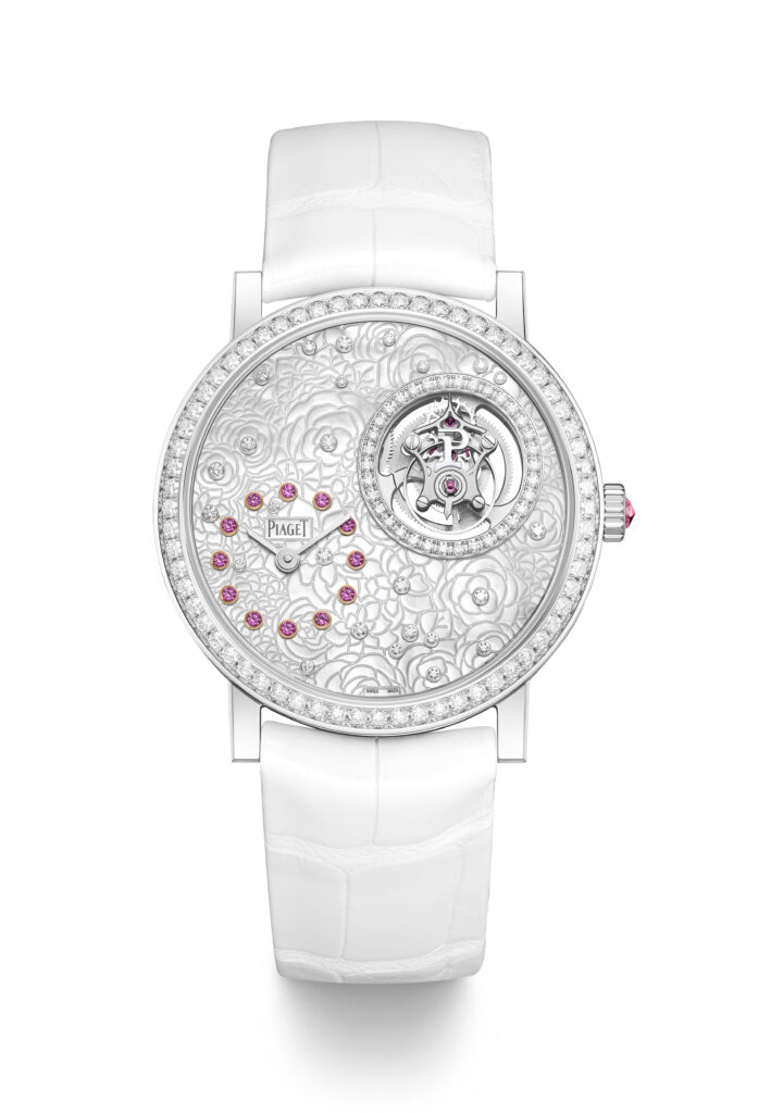 Piaget exprime cette fascination dans ses créations joaillières, mais également dans l’univers de l’horlogerie en dévoilant un nouveau modèle de la collection Altiplano. Cherchant à recréer la beauté de la rose à travers ses gravures florales, cette montre est l’incarnation ultime de l’innovation et de l’esthétique signées Piaget. Il a fallu plus de deux ans pour réaliser le bracelet rose, composé de l’une des matières les plus délicates au monde : de véritables pétales de fleur. L’Altiplano Tourbillon Rose en or blanc est une montre extra-plate intemporelle dédiée à celles qui aiment porter le style, la gaieté et la virtuosité à leur poignet.