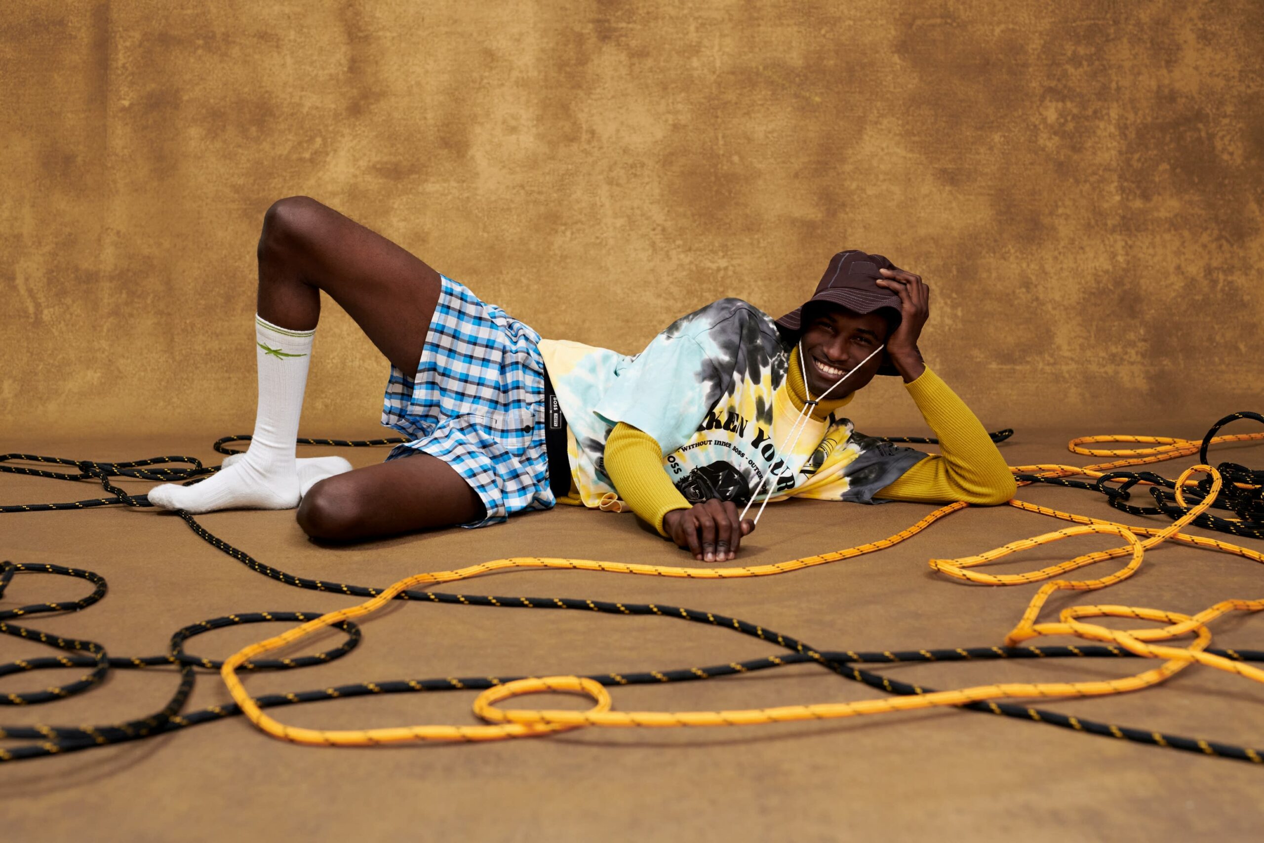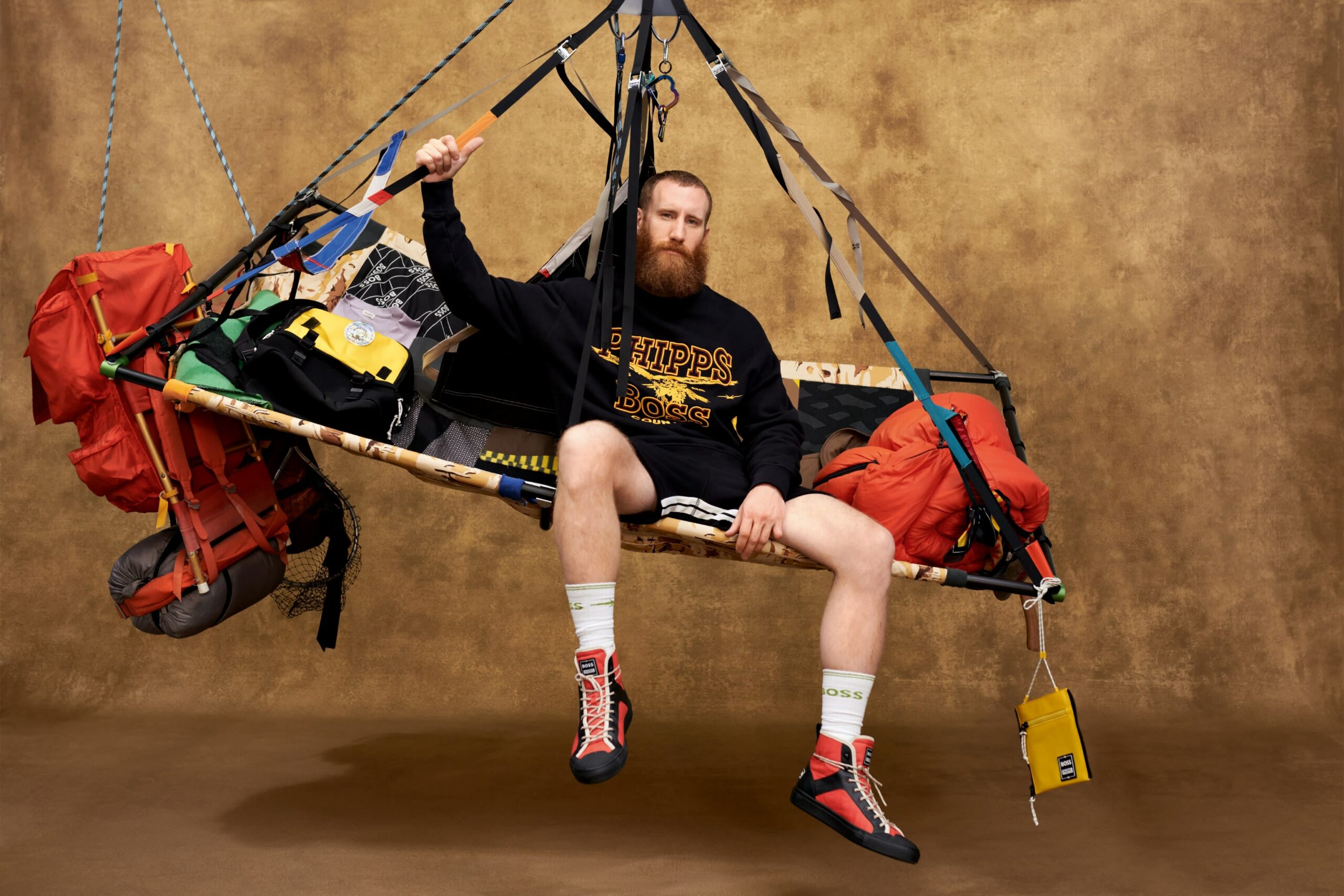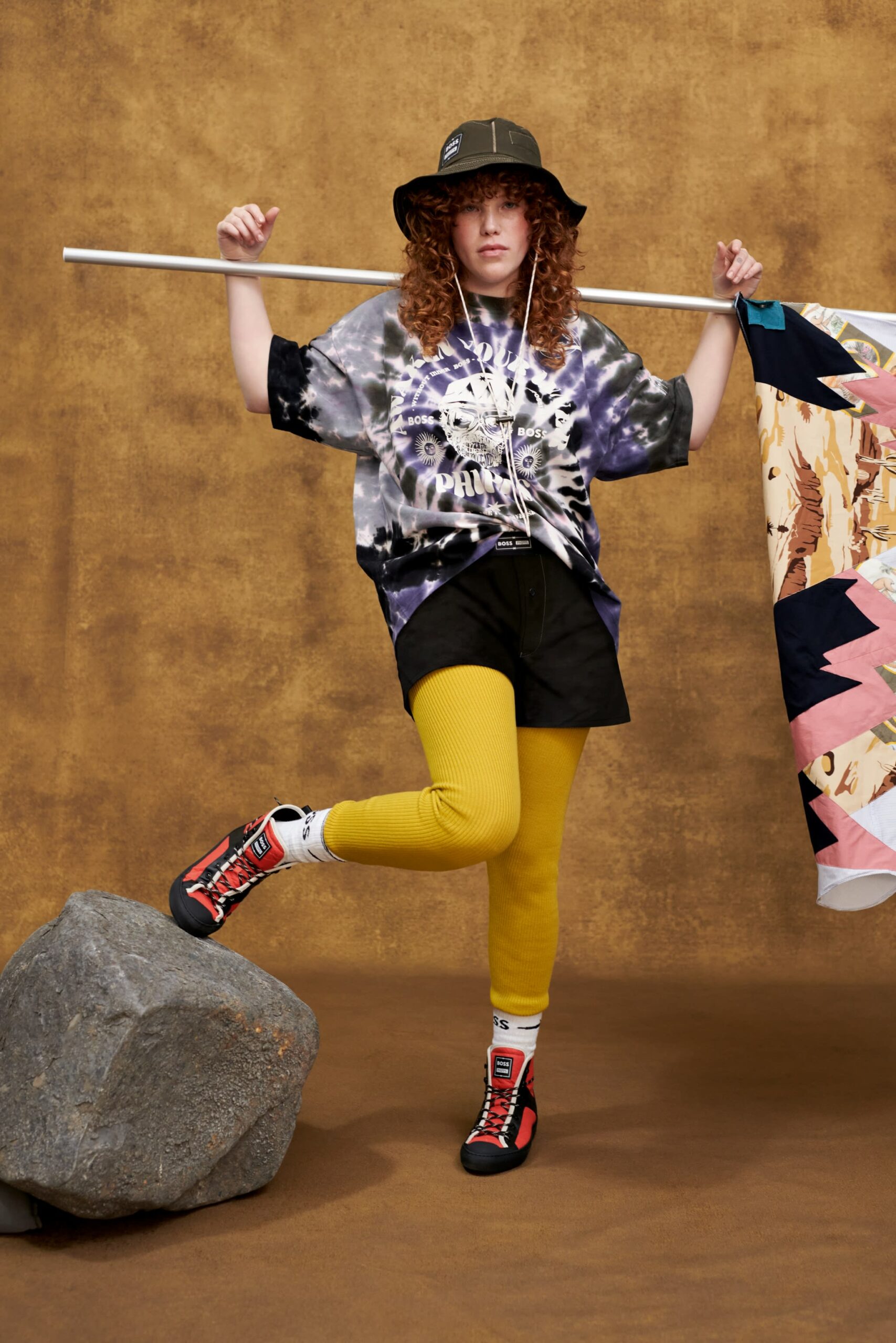 Das Besondere an dieser Kapsel ist nämlich die Art und Weise, wie sie entstanden ist. Von Anfang an suchten BOSS und PHIPPS nach kreativen Wegen, um Ressourcen zu sparen. Die Kollektion wurde aus verantwortungsvolleren Materialien und Stoffresten aus den Archiven von BOSS entworfen. Einige Stücke gehen sogar über die klassischen nachhaltigen Prozesse hinaus: Die Kapsel umfasst eine Cargo-Shorts und einen Bob, die aus Baumwollanzügen aus dem Lager der Marke kreiert wurden.