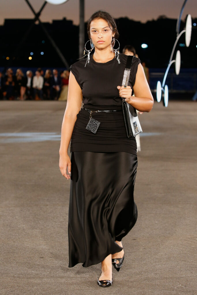 LE DEFILE : Installé sur le fleuve Hudson au Pier 76, le défilé printemps-été 2023 a eu lieu au coucher du soleil avec un mobile céleste suspendu au-dessus de la piste. Wladimir Schall a produit la musique, qui comprenait « Suite Bergamasque » de Tomita, « Whole Lotta (V dub edit) » de Led Zeppelin, « I Heard it Through the Grapevine » de The Slits, « Don’t Break My Heart » de UB40, et « Tonight, Tonight » de The Smashing Pumpkins.