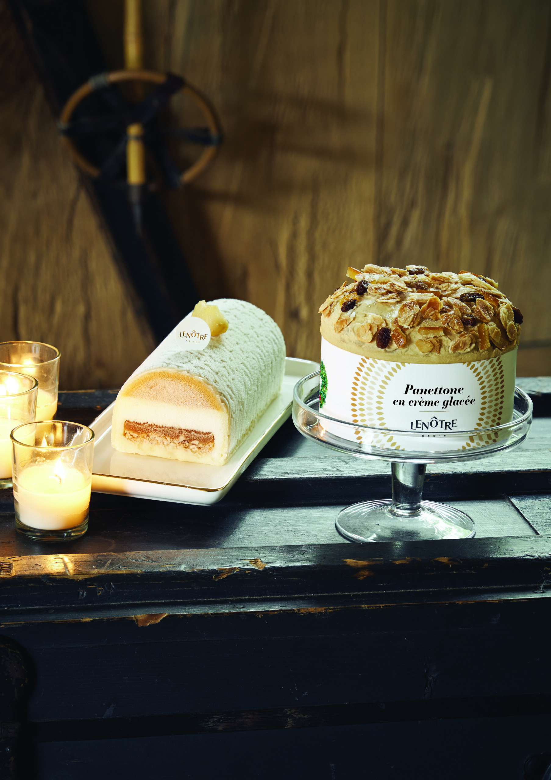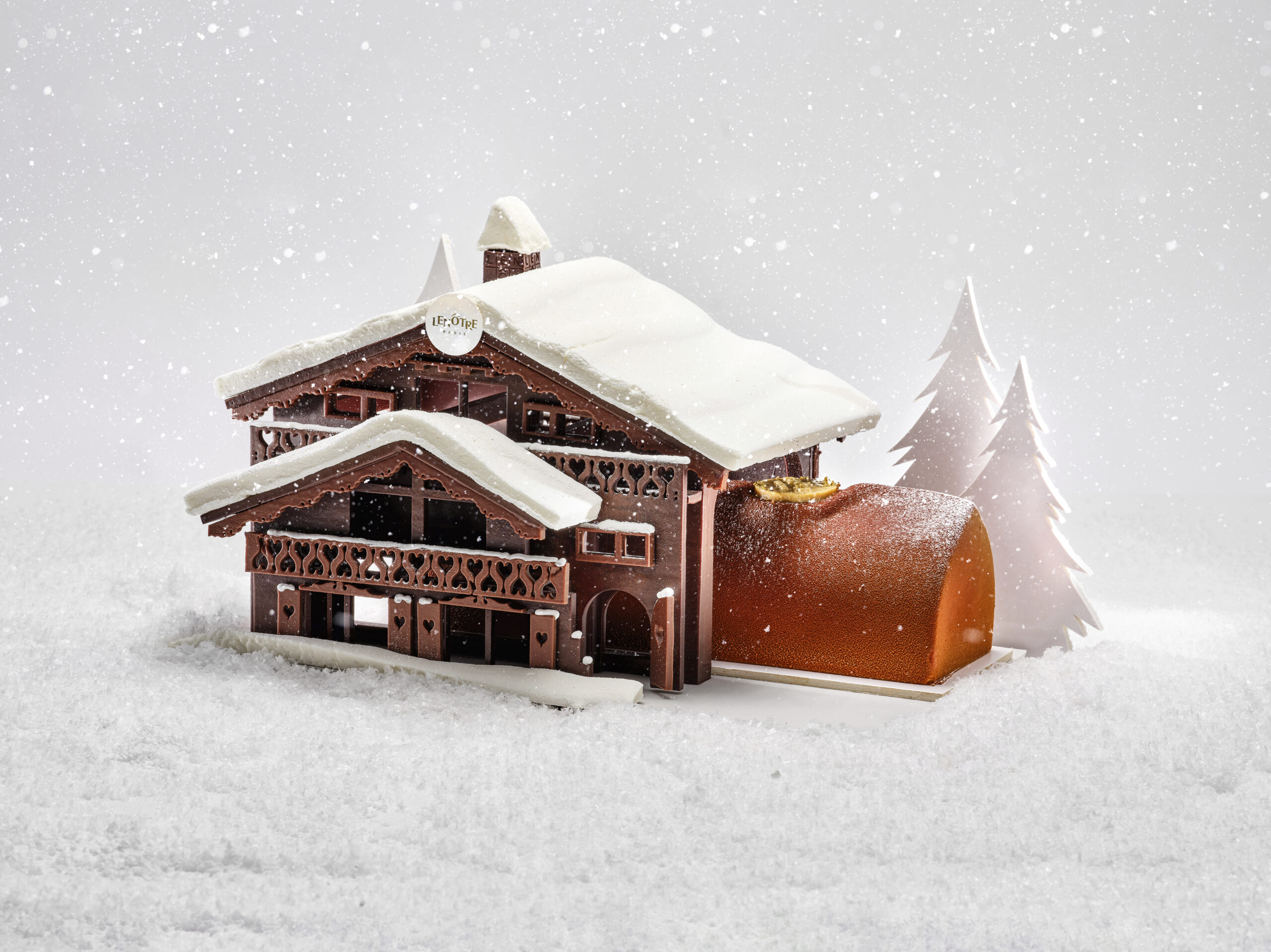 Inspiré par l’architecture en bois d’un chalet alpin, Etienne Leroy, , réalise cette année sa première bûche signature Lenôtre au goût réconfortant de lait chaud, aux notes gourmandes et épicées. Une création en trompe-l’œil qui mise sur un jeu de textures et parfums lactées, alliant de la vanille Bourbon de Madagascar et de la cannelle, une touche de noix de muscade, une pointe de rhum vieux 7 ans d’âge et du caramel fondant. Le crémeux et la mousse qui composent la bûche ont été réalisés à partir de lait infusé à la brioche toastée, pour encore plus de gourmandise.