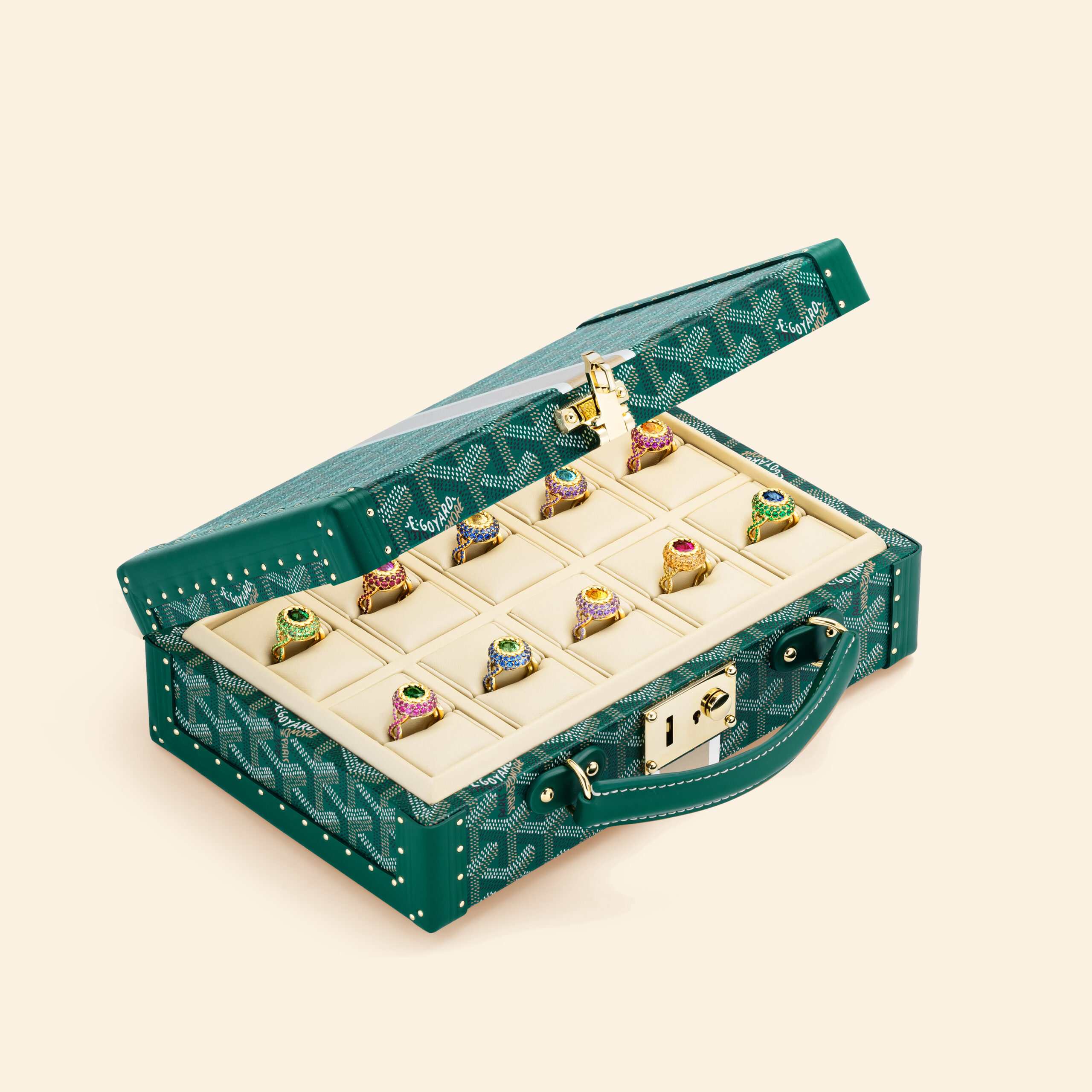 La Maison Mellerio souhaite un écrin unique sublimant sa dernière collection de dix bagues Color Queen. Très naturellement la Maison se rapproche du malletier Goyard, maison elle aussi familiale et indépendante partageant les mêmes valeurs. La profondeur de leur histoire, leur fidélité à leurs racines et une certaine vision de l’excellence française liée à une créativité et un savoir-faire d’exception sont une évidence pour Mellerio qui lance la commande spéciale.
