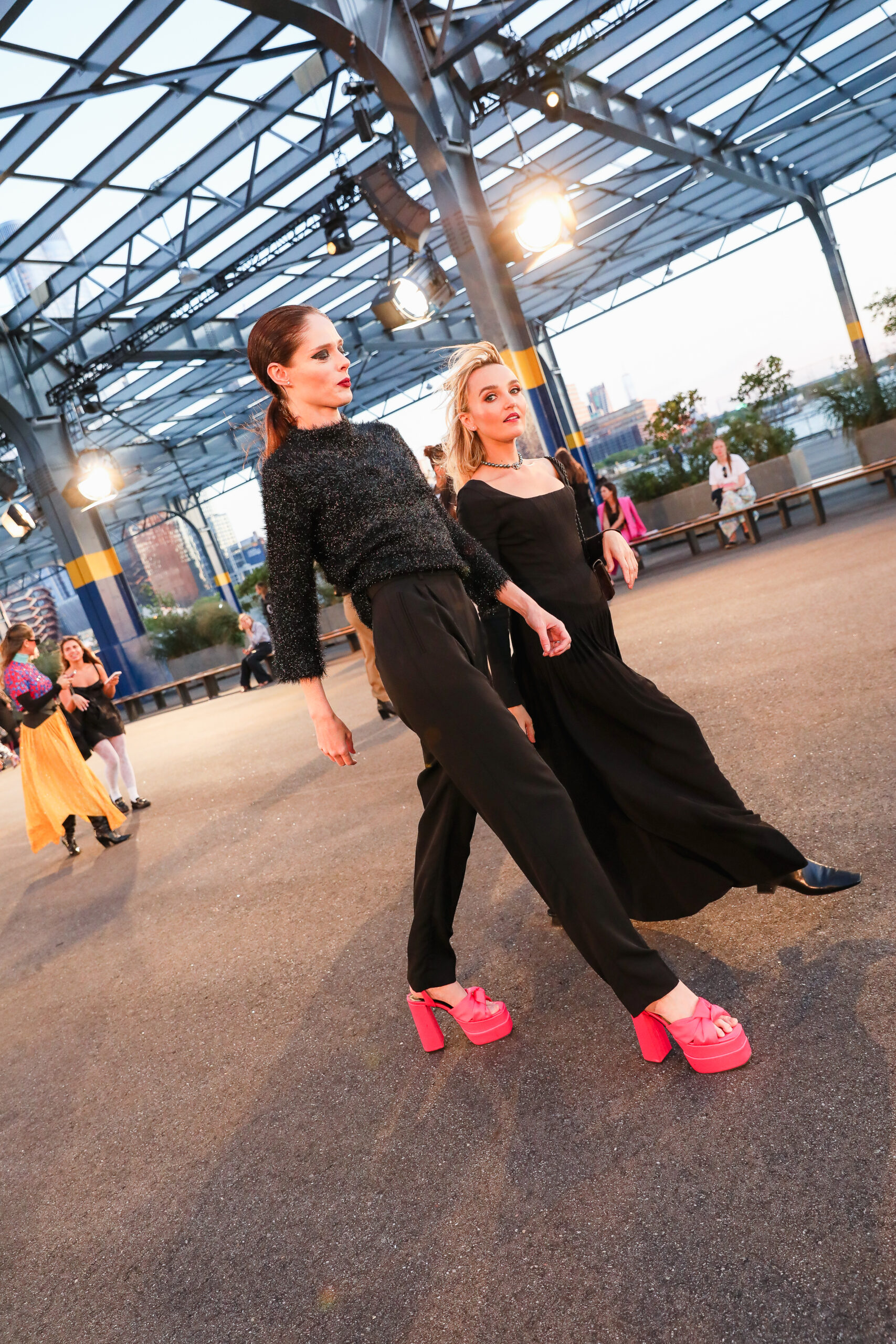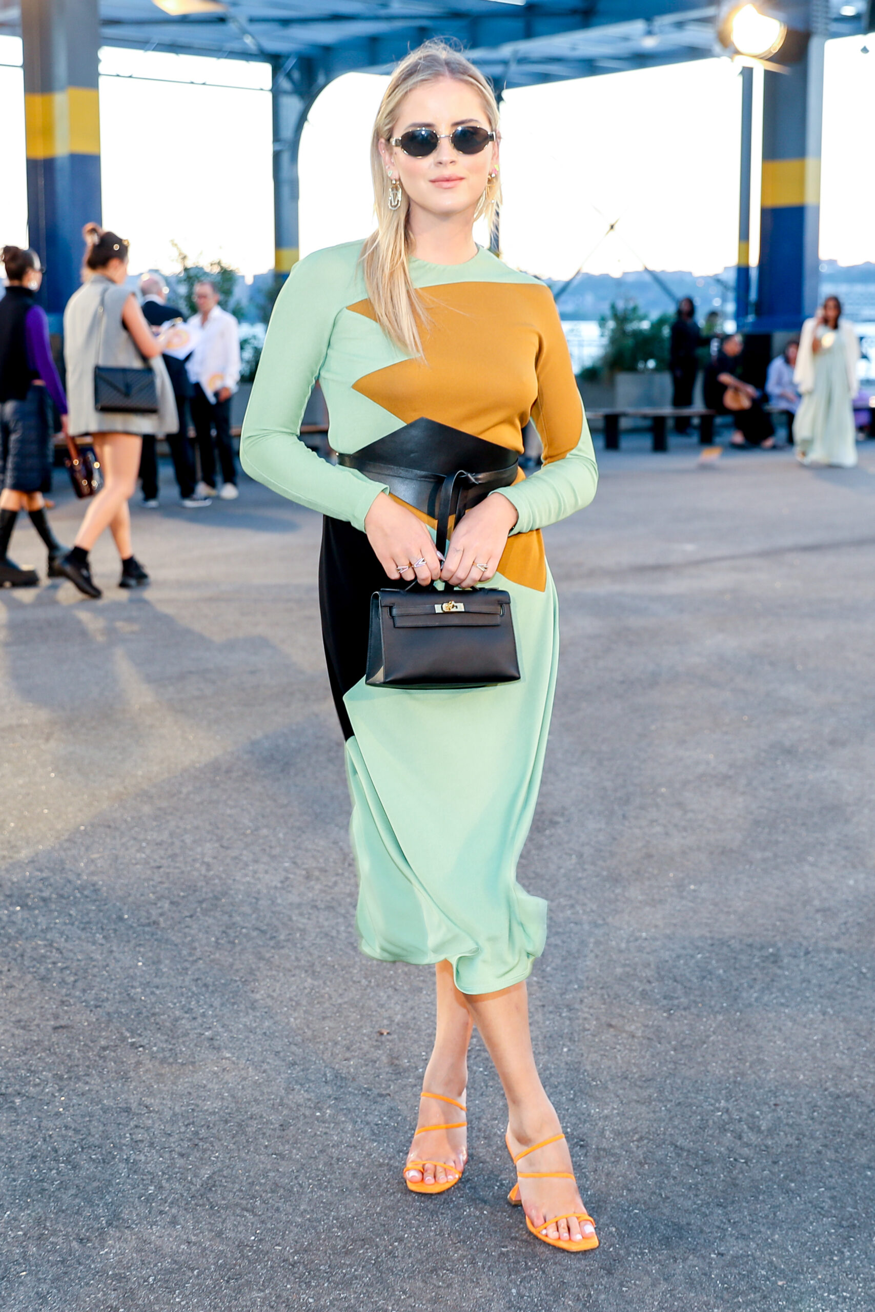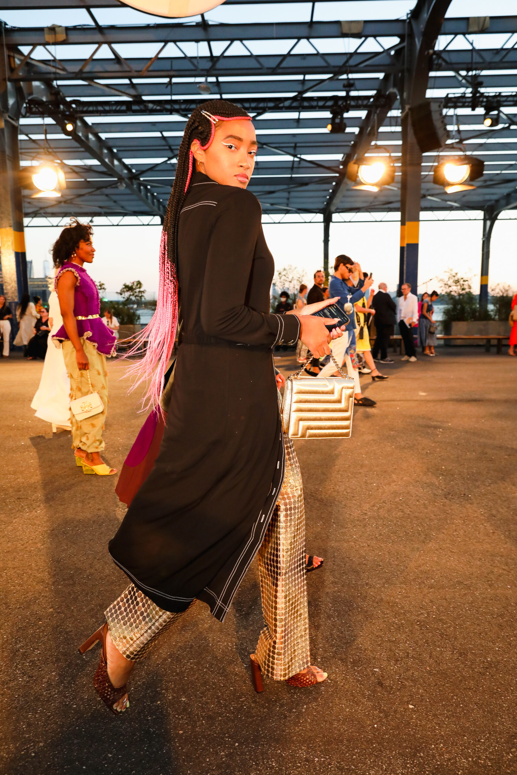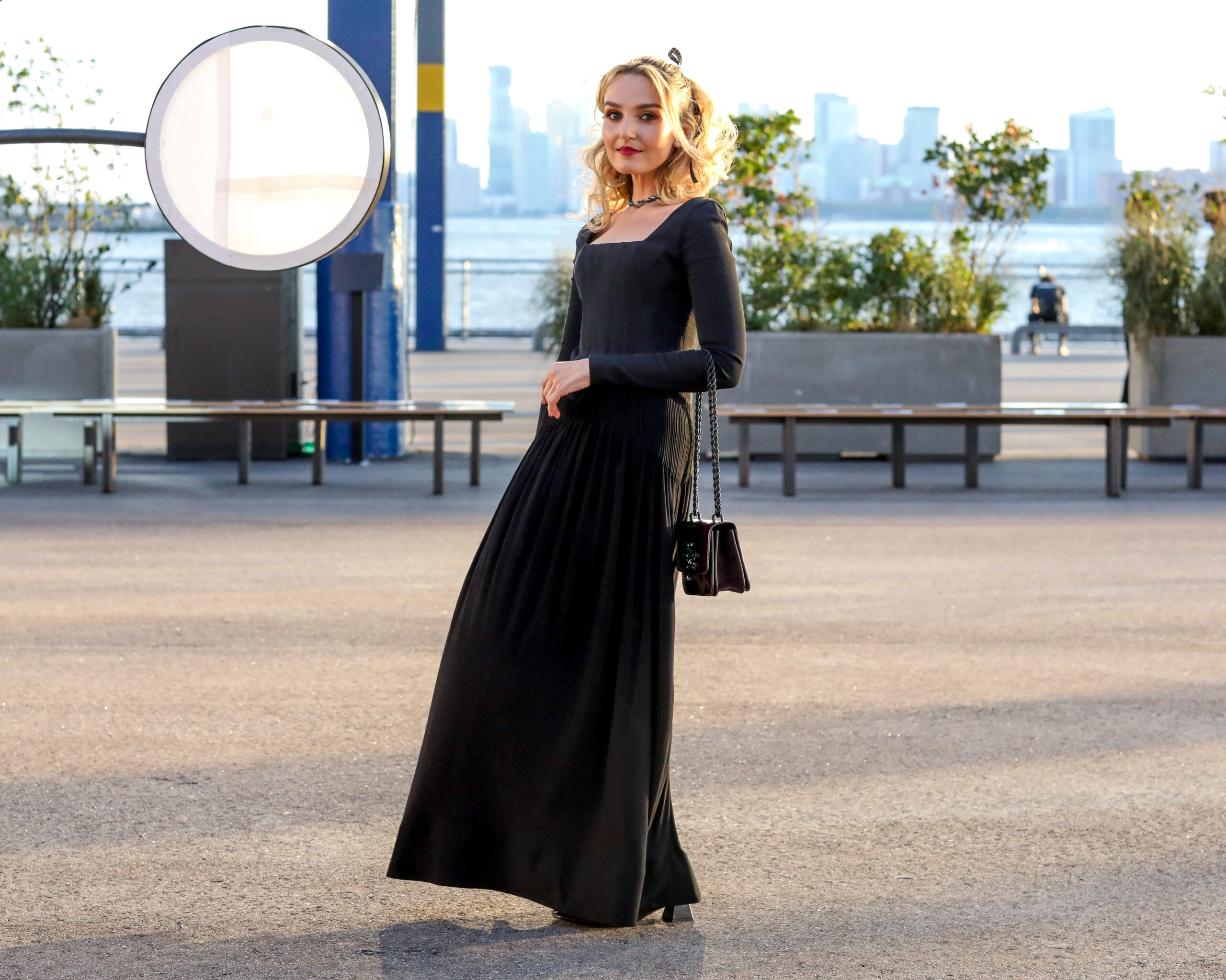 • Chloe Fineman portant RE23 Look 12, la robe corset, la mule élastique à bride arrière et le petit sac à bandoulière convertible Eleanor Patent Jeweled Logo.