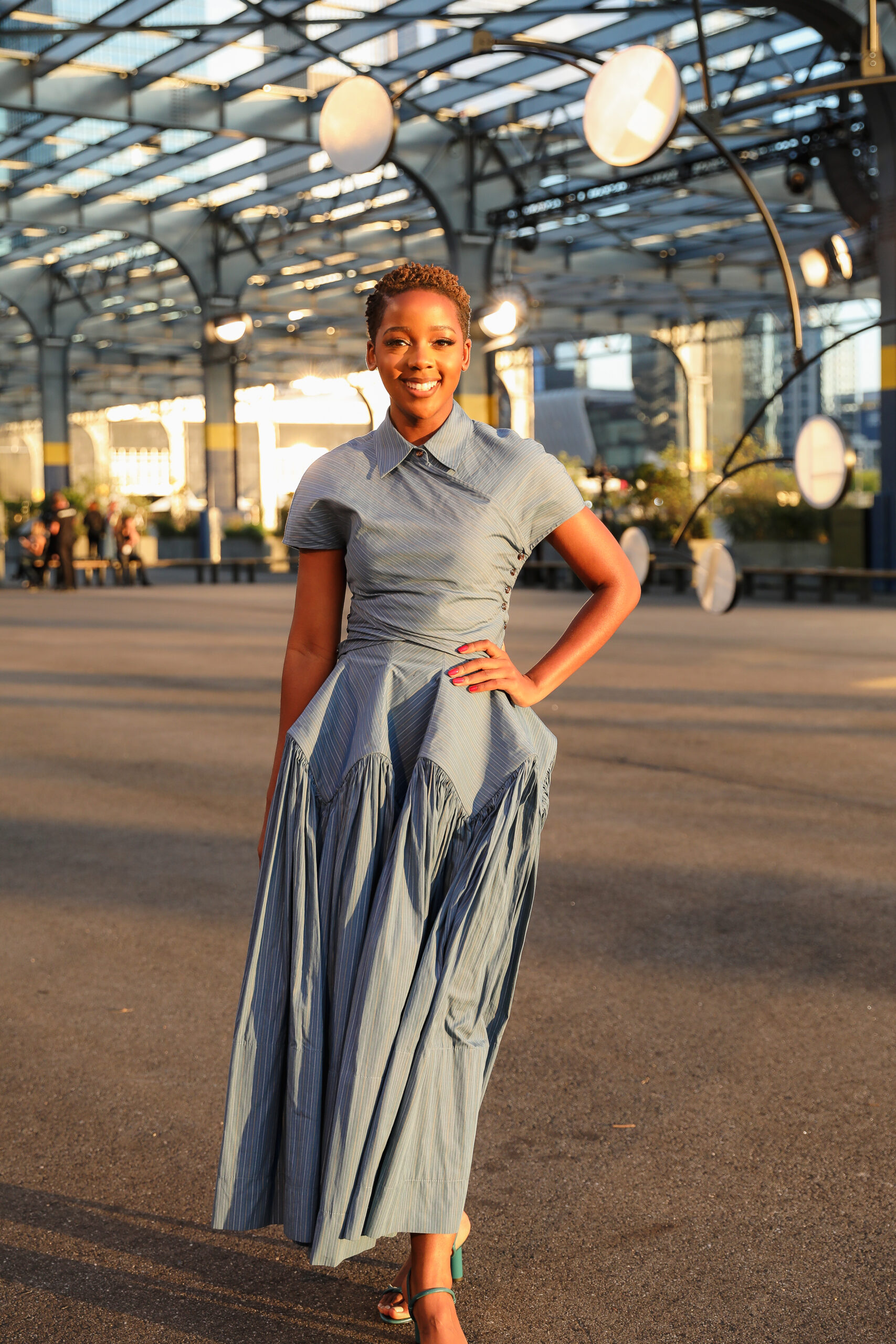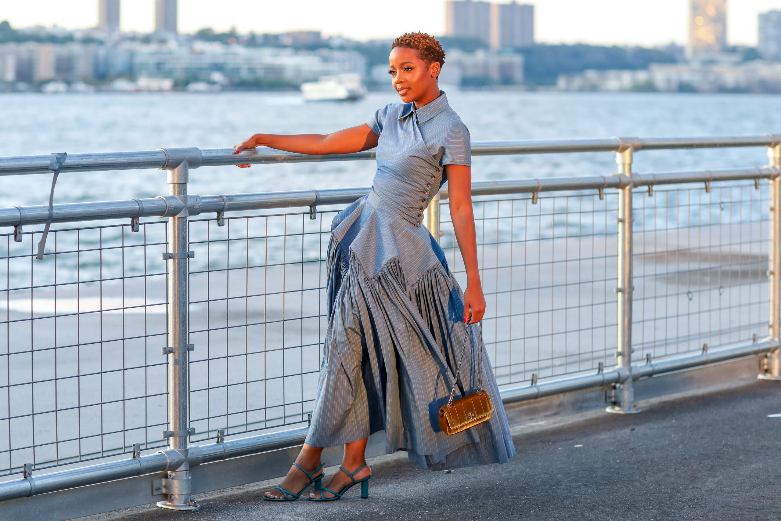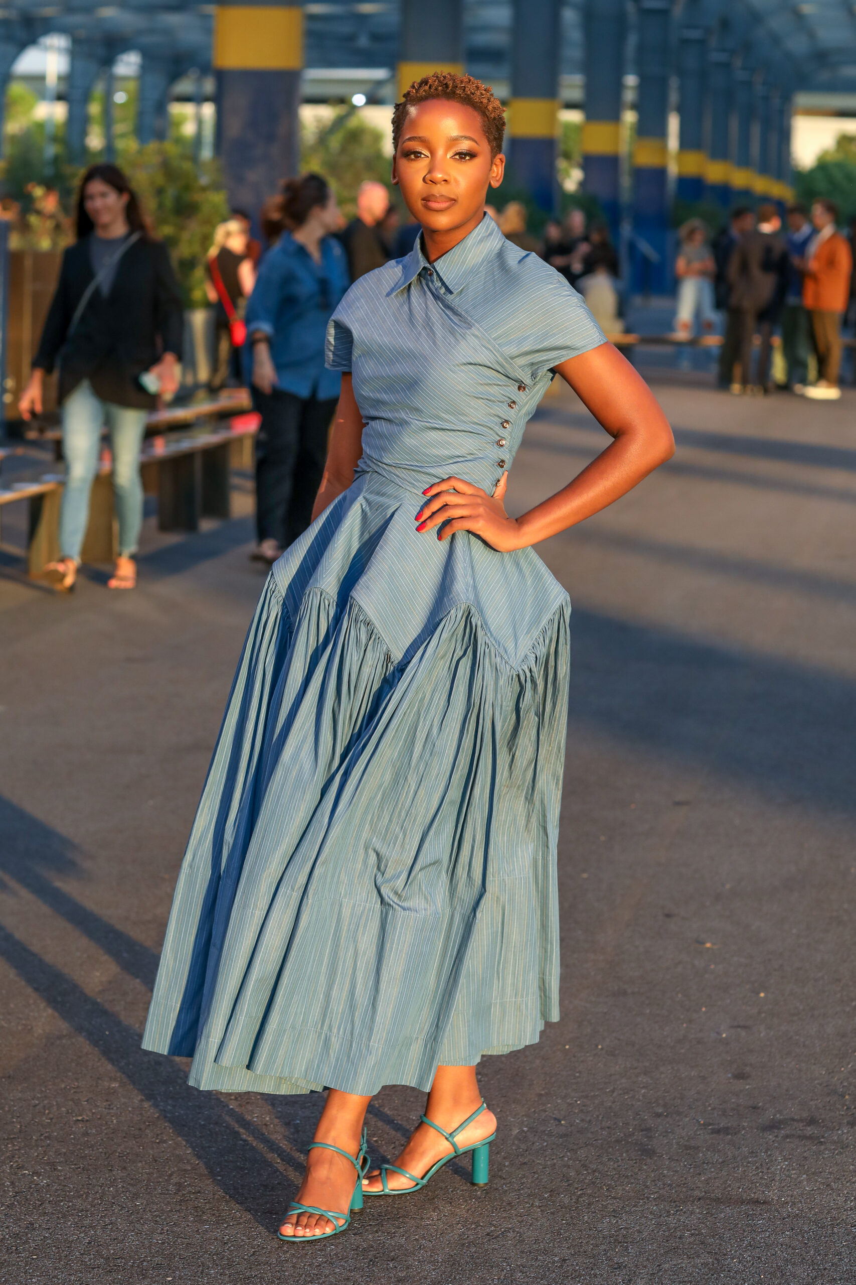 • Thuso Mbedu portant RE23 Look 19, la jupe rayée et le haut cache-cœur, la sandale à talon cylindrique et le mini sac à rabat en velours Kira.