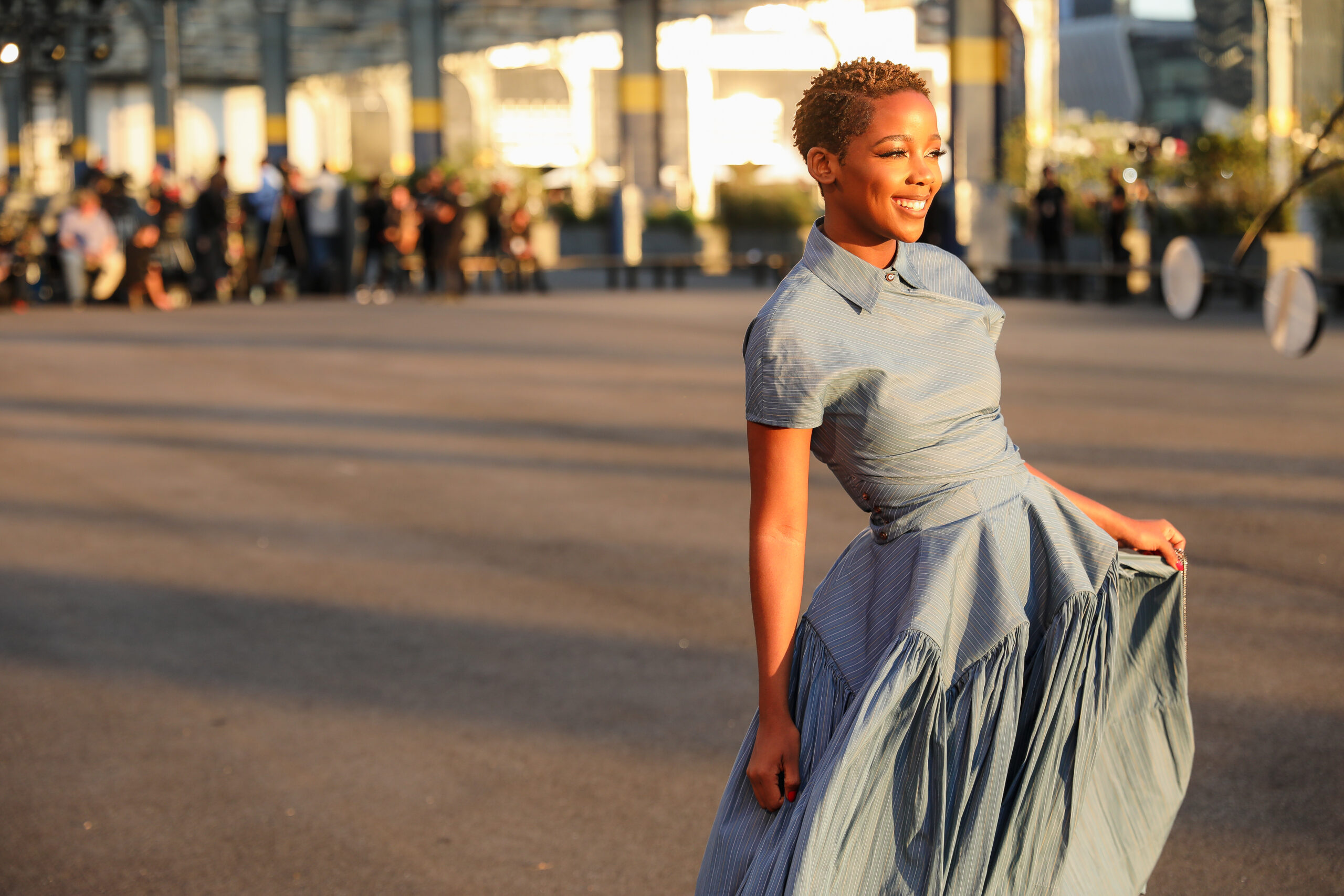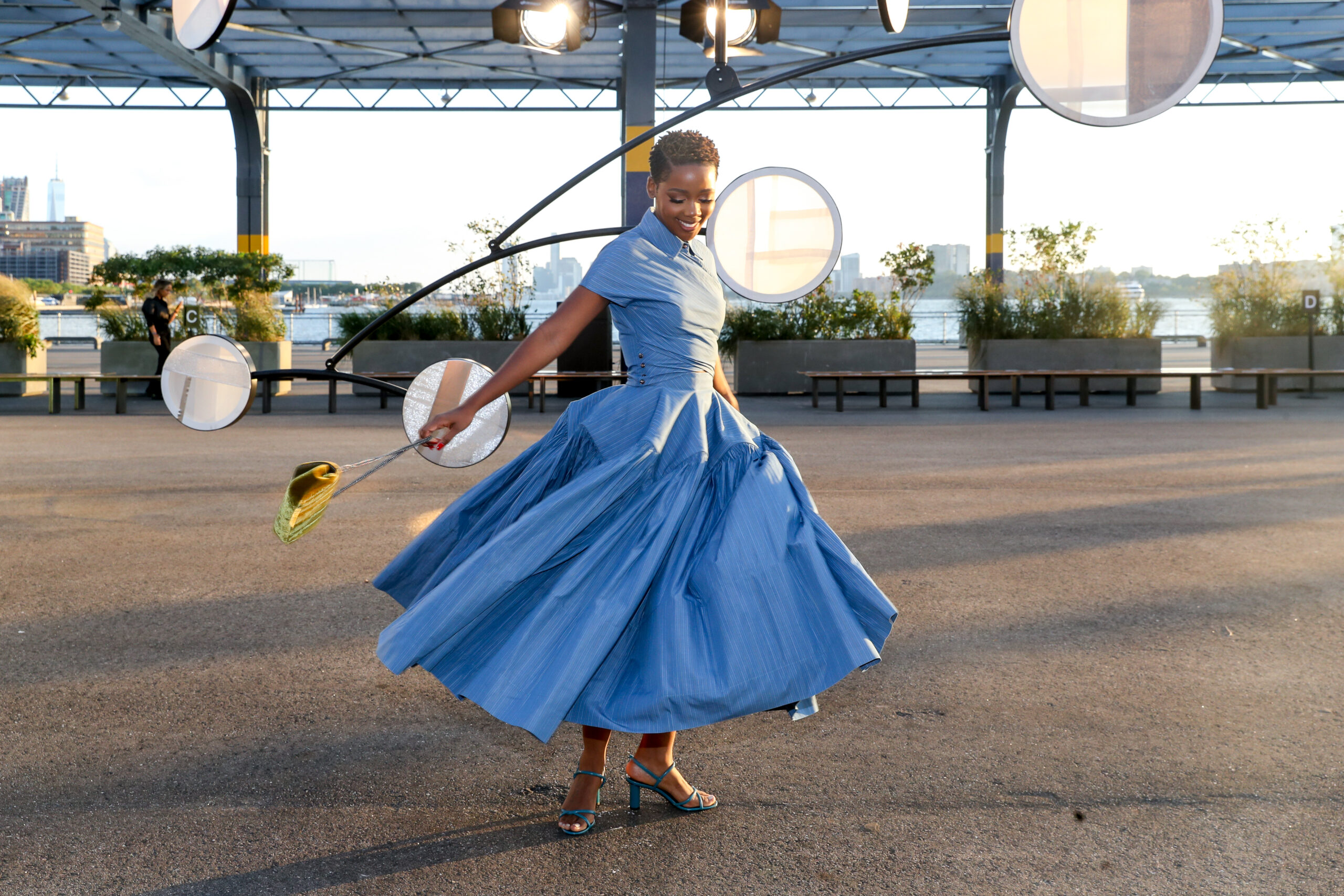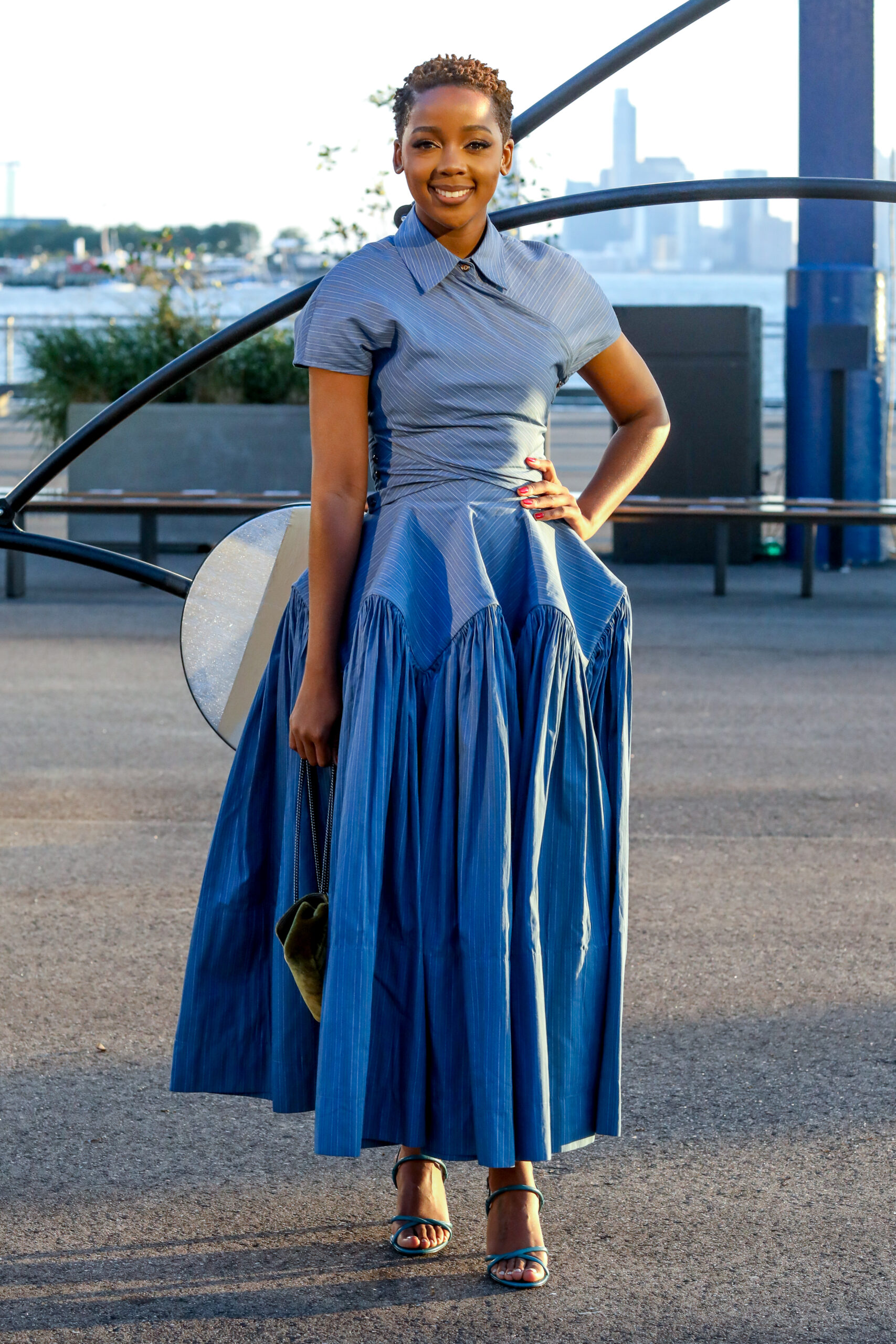 • Thuso Mbedu portant RE23 Look 19, la jupe rayée et le haut cache-cœur, la sandale à talon cylindrique et le mini sac à rabat en velours Kira.