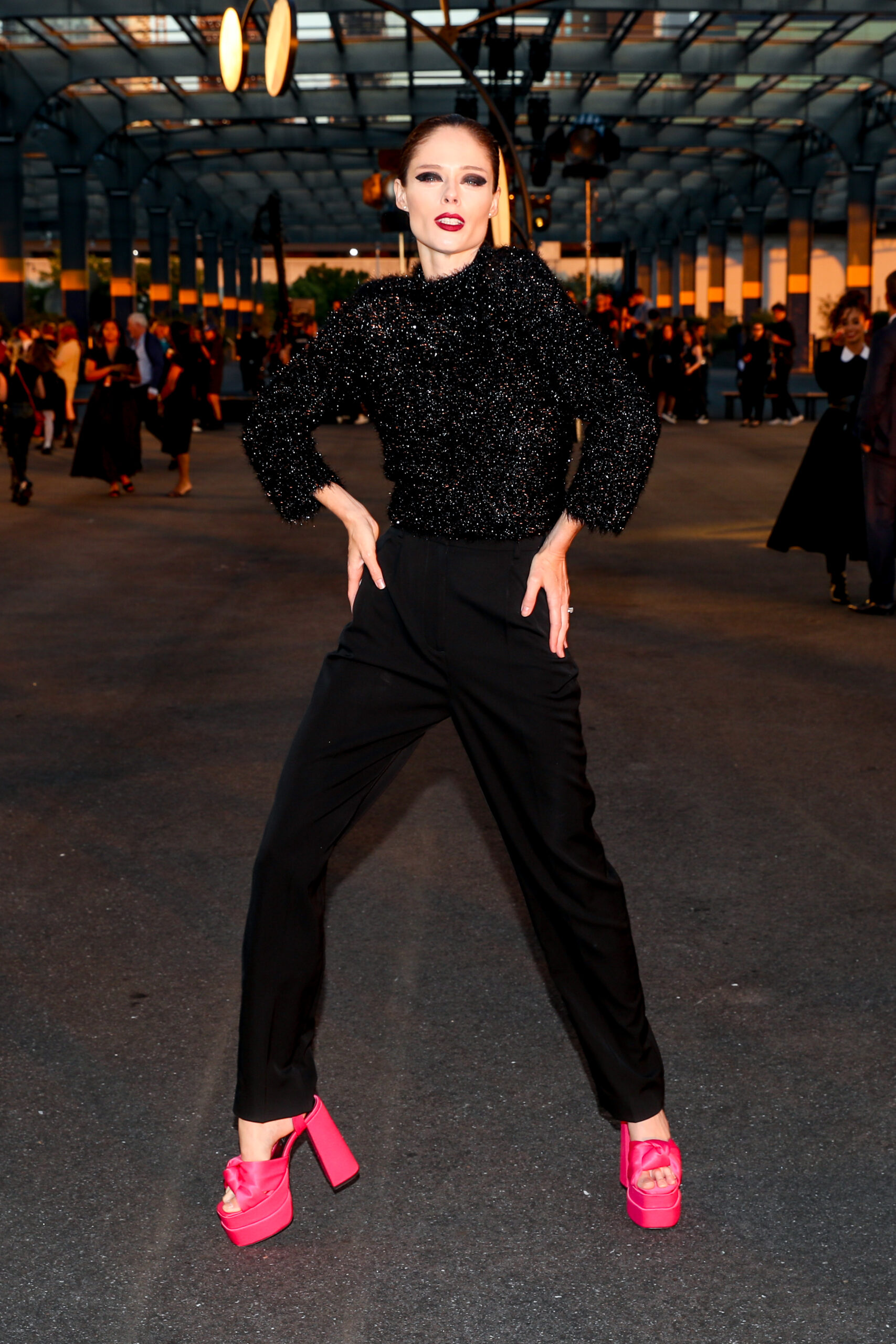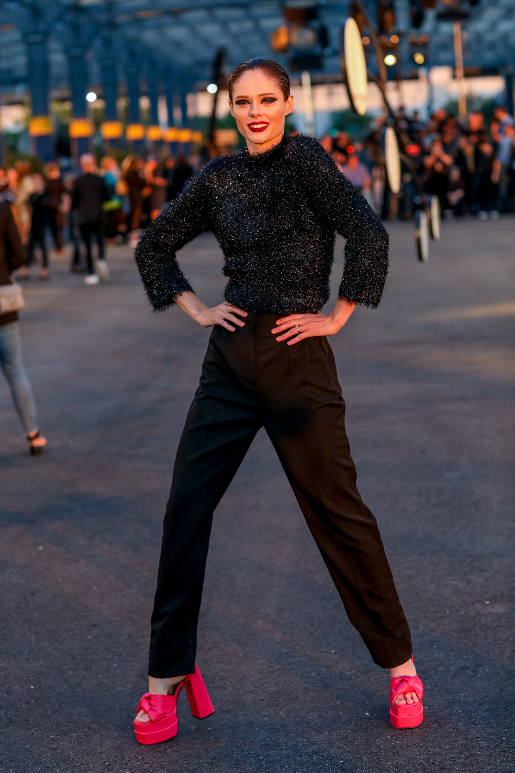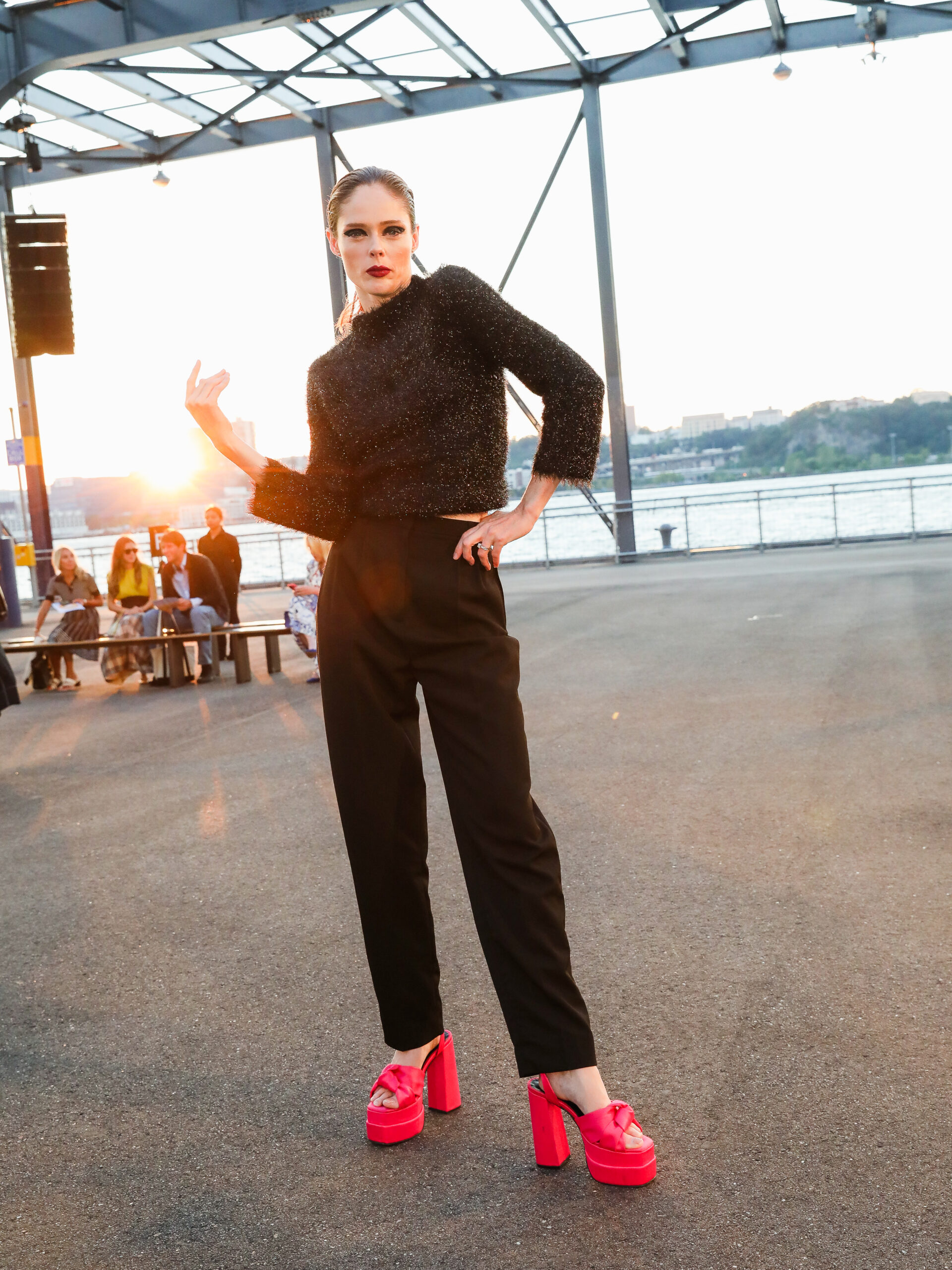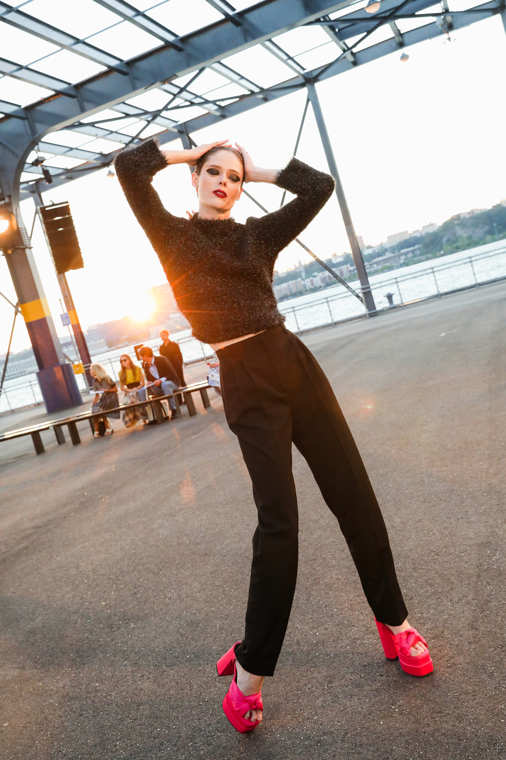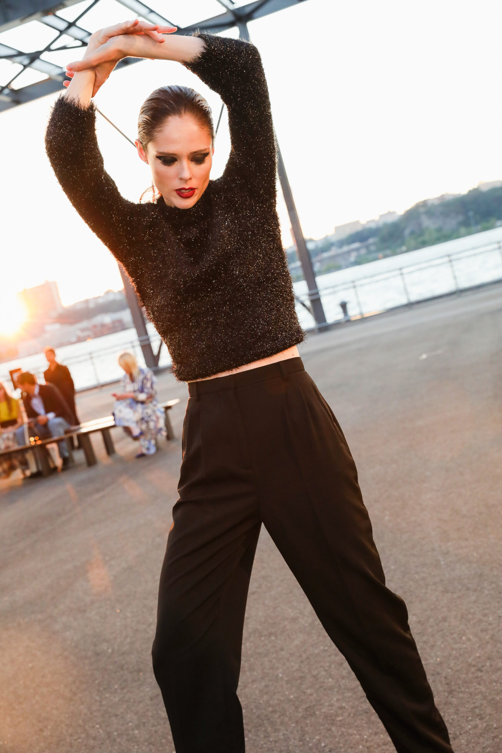 • Coco Rocha portant RE23 Look 6, le Tinsel Mockneck Sweater et le Wool Twill Pant.