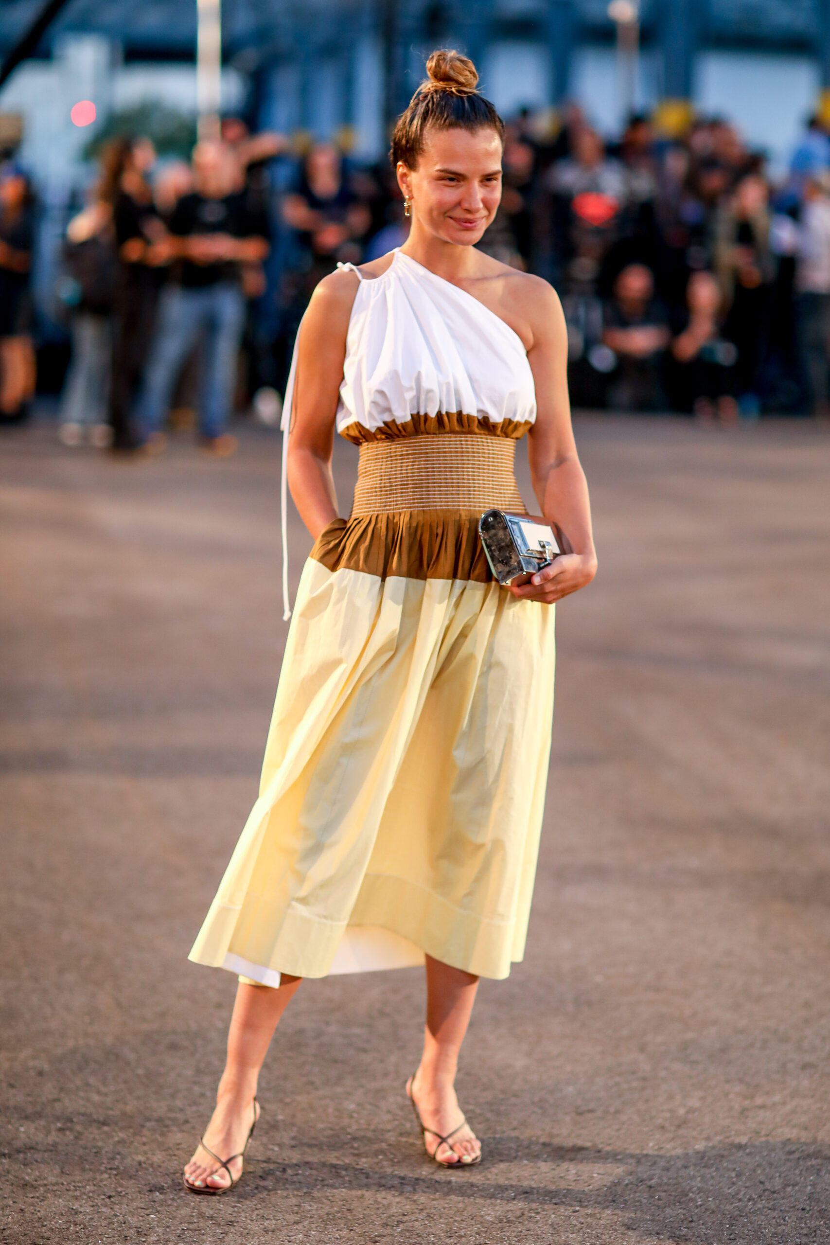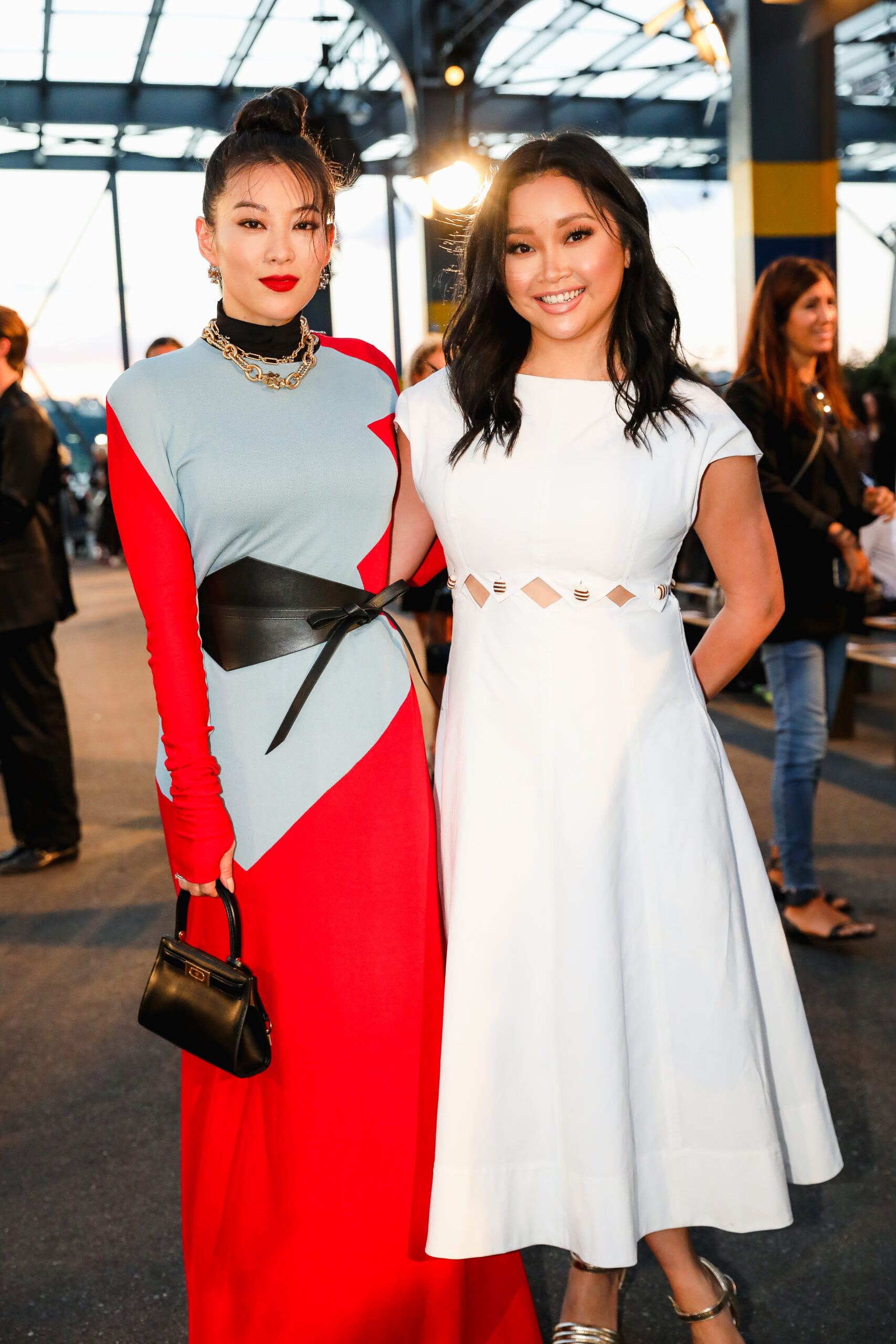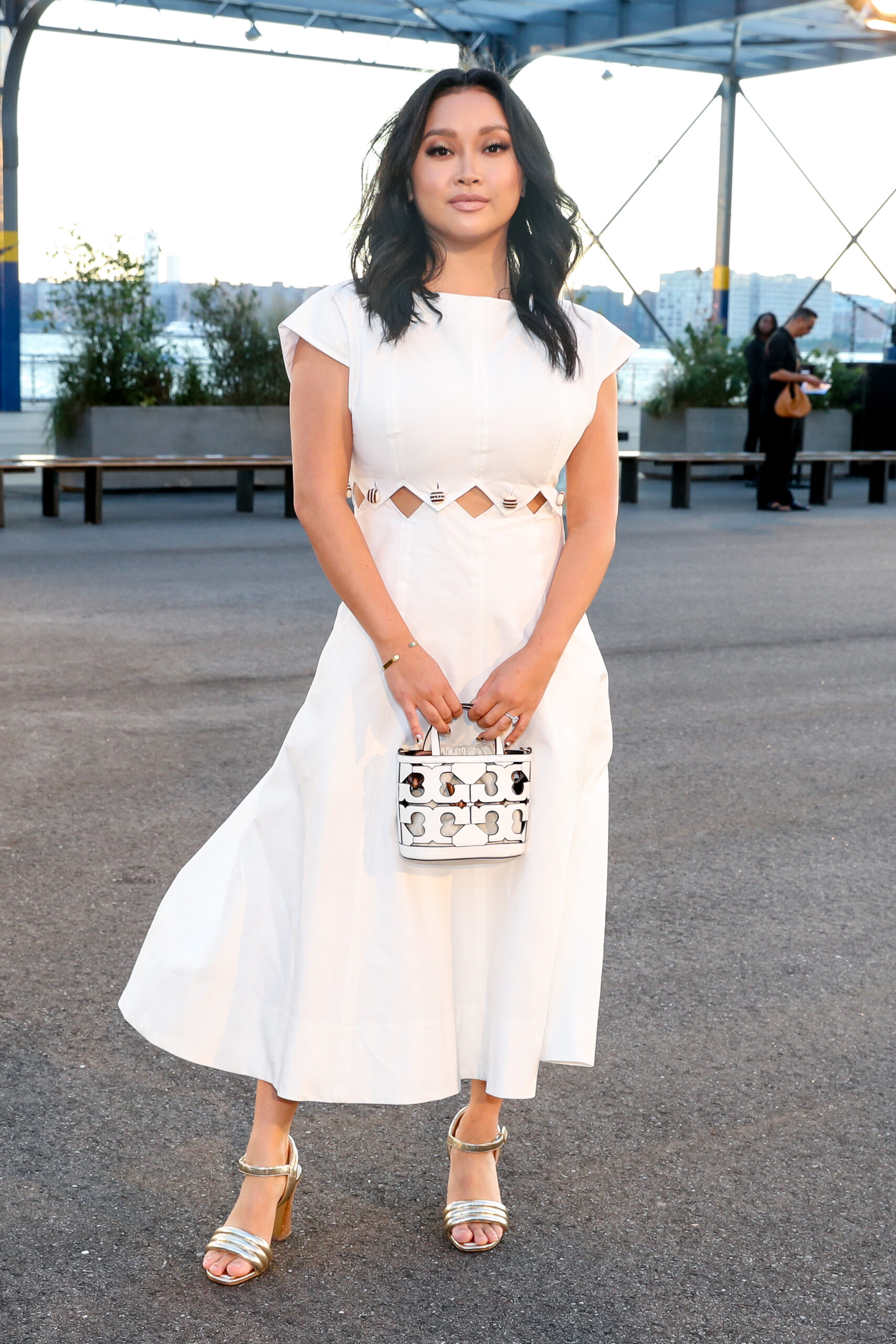 • Lana Condor portant la robe Diamond Cut-Out, la sandale bouffante et le mini fourre-tout à logo Cut-Out.