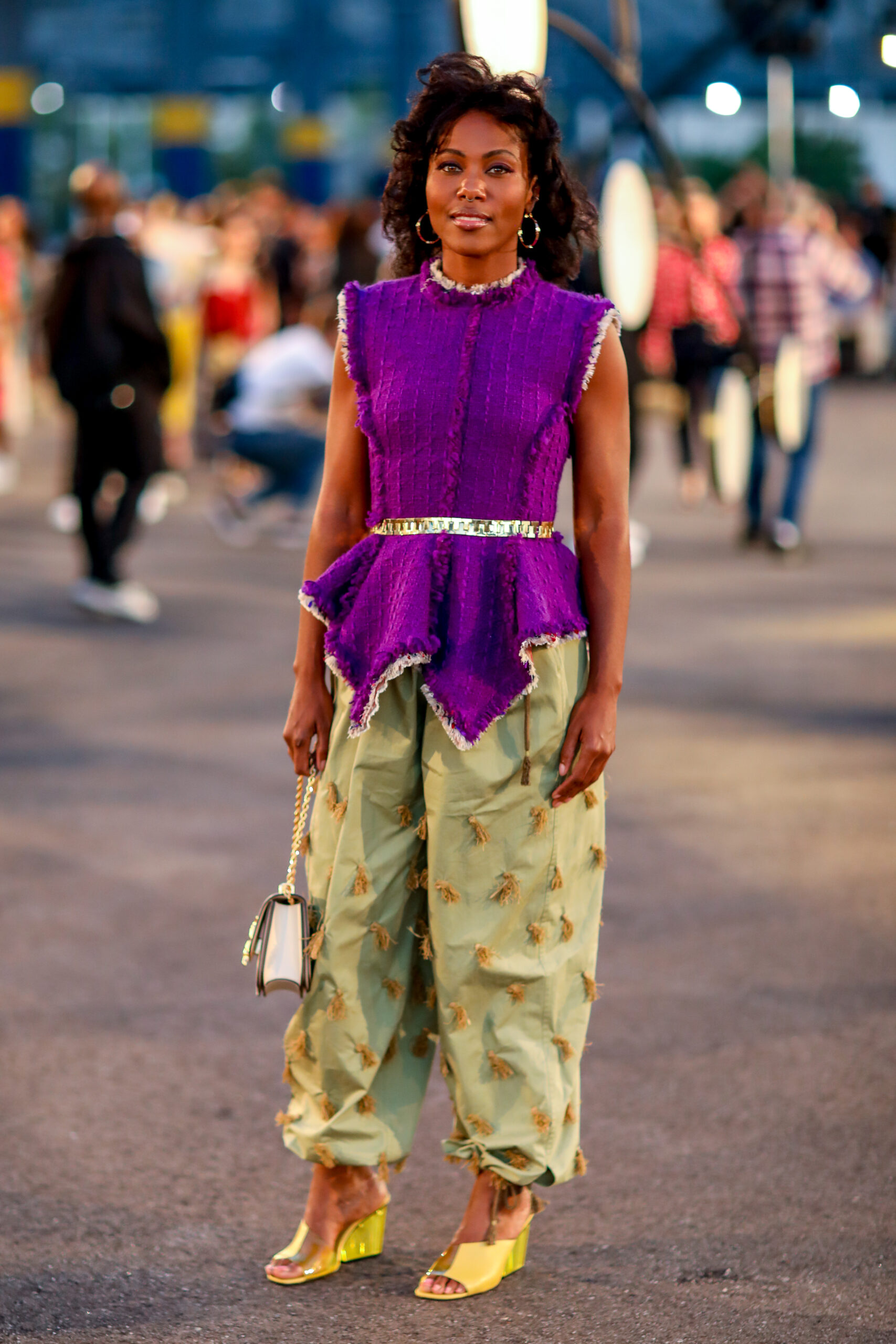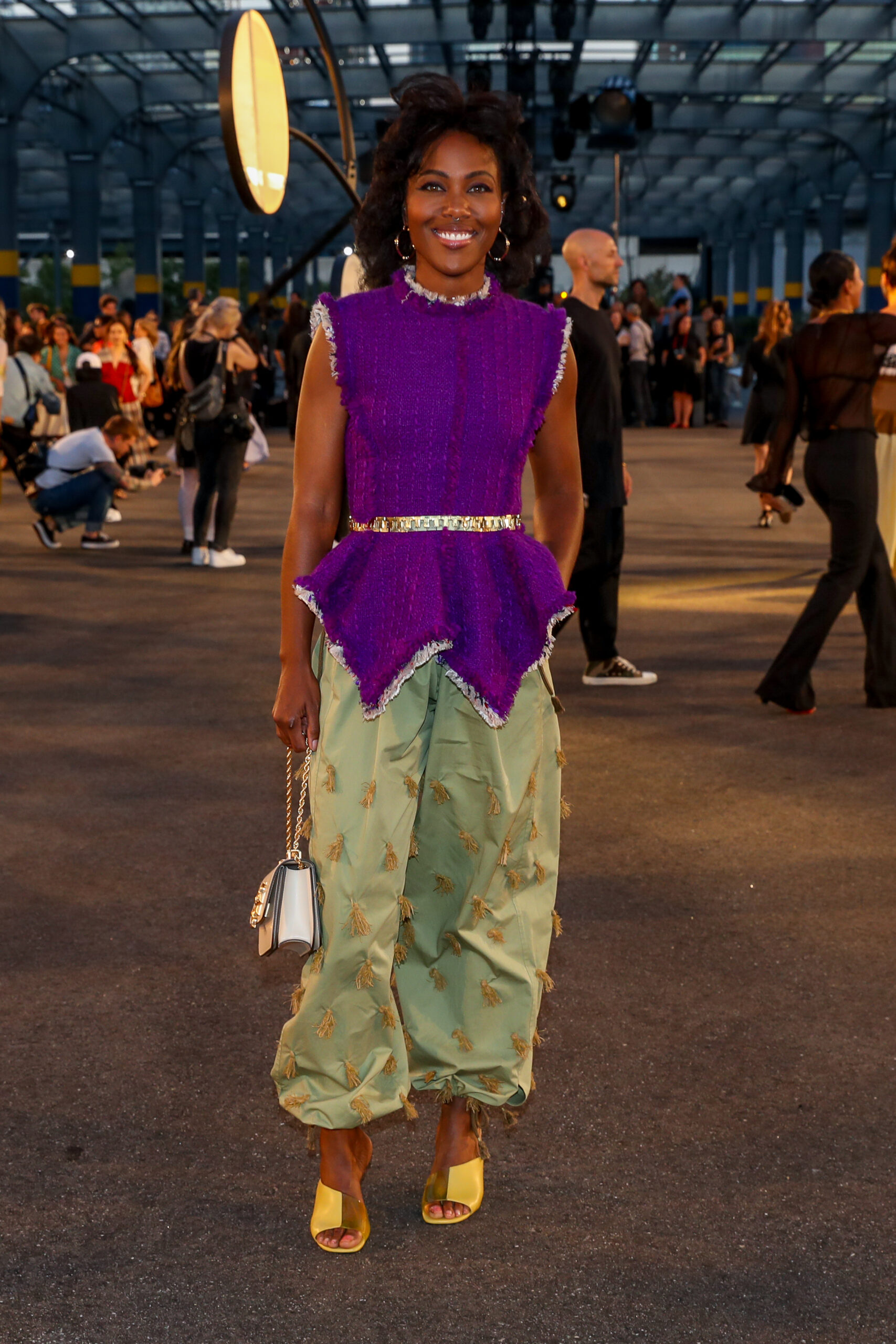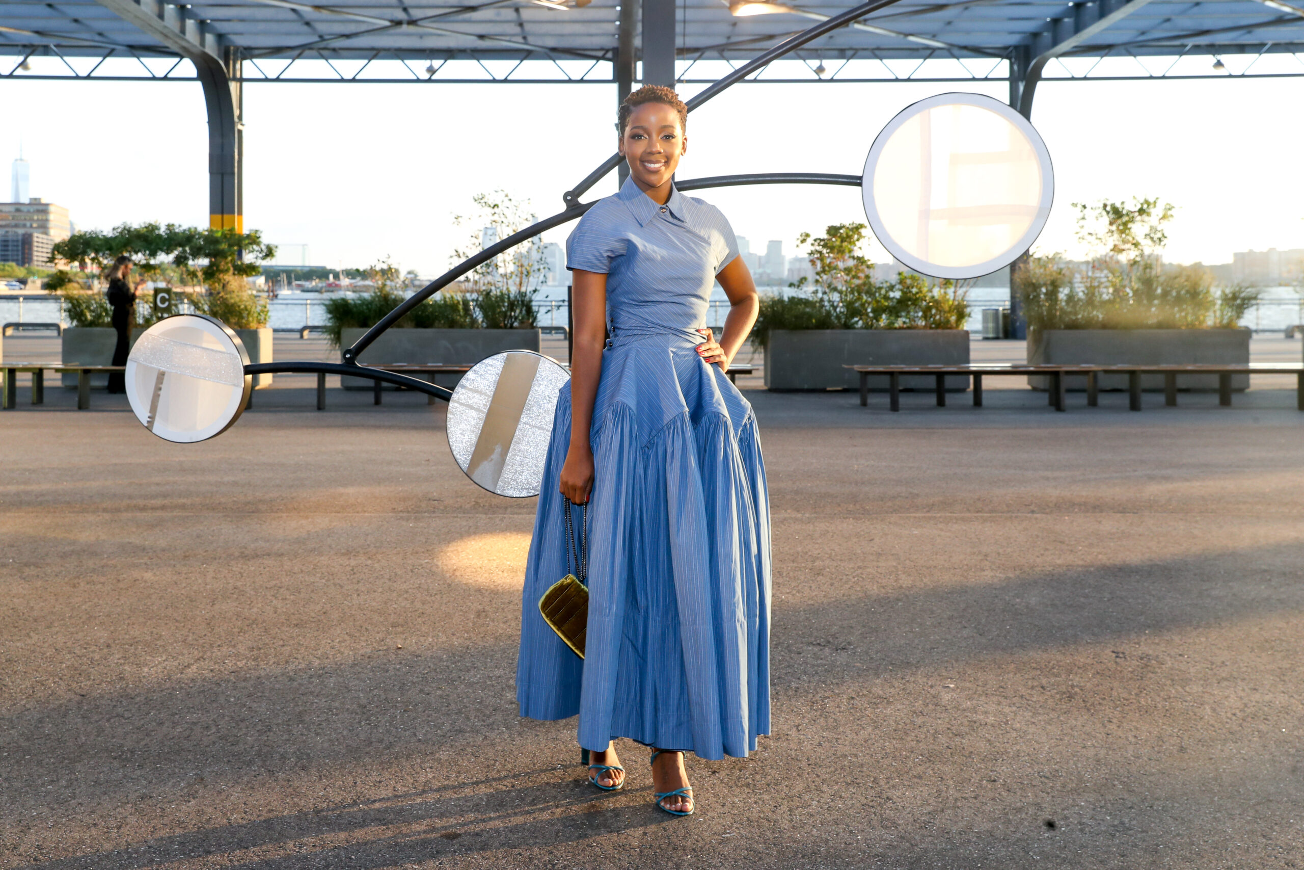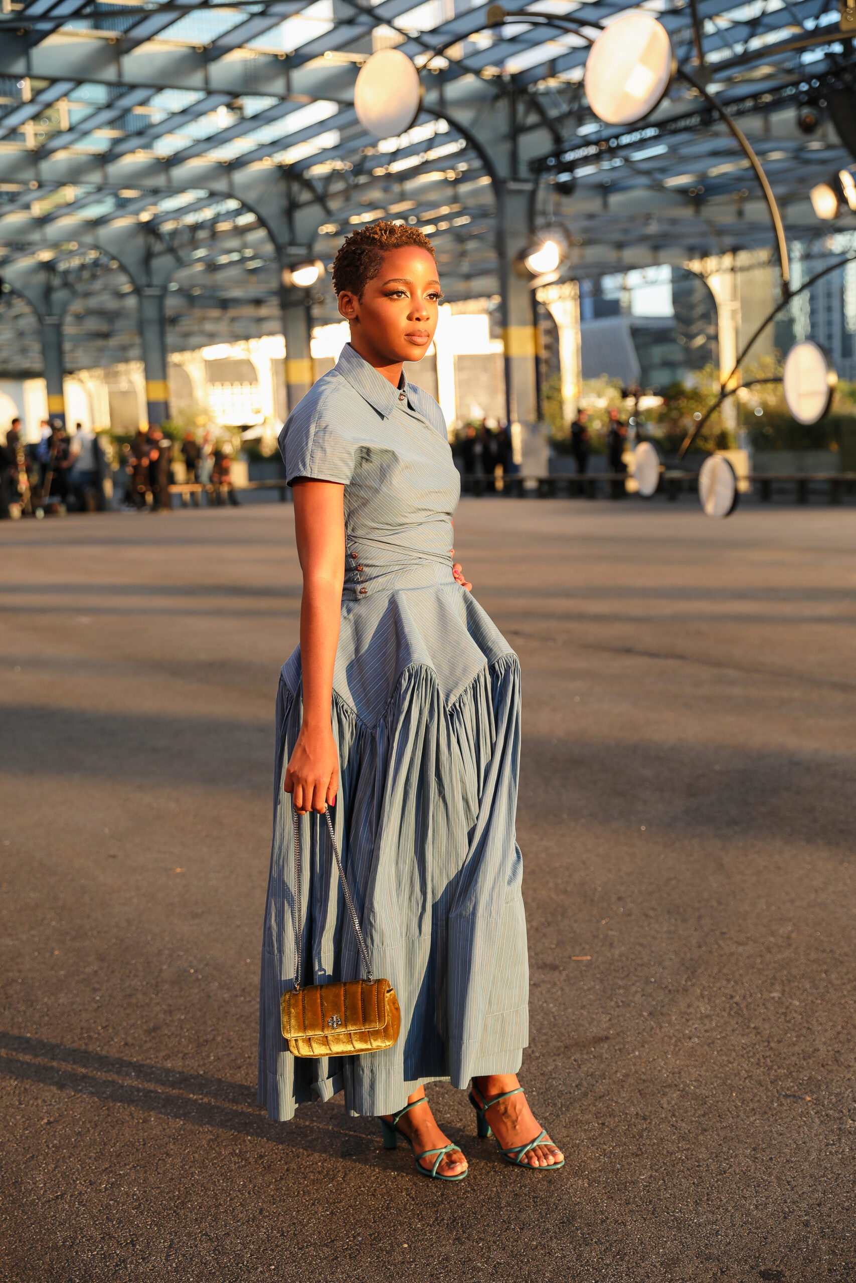 • DeWanda Wise portant le look RE23 14, le haut en tweed natté, le pantalon en popeline avec cordon de serrage, la ceinture en métal à maillons en T, la sandale mule à talon asymétrique et le petit sac Eleanor.
