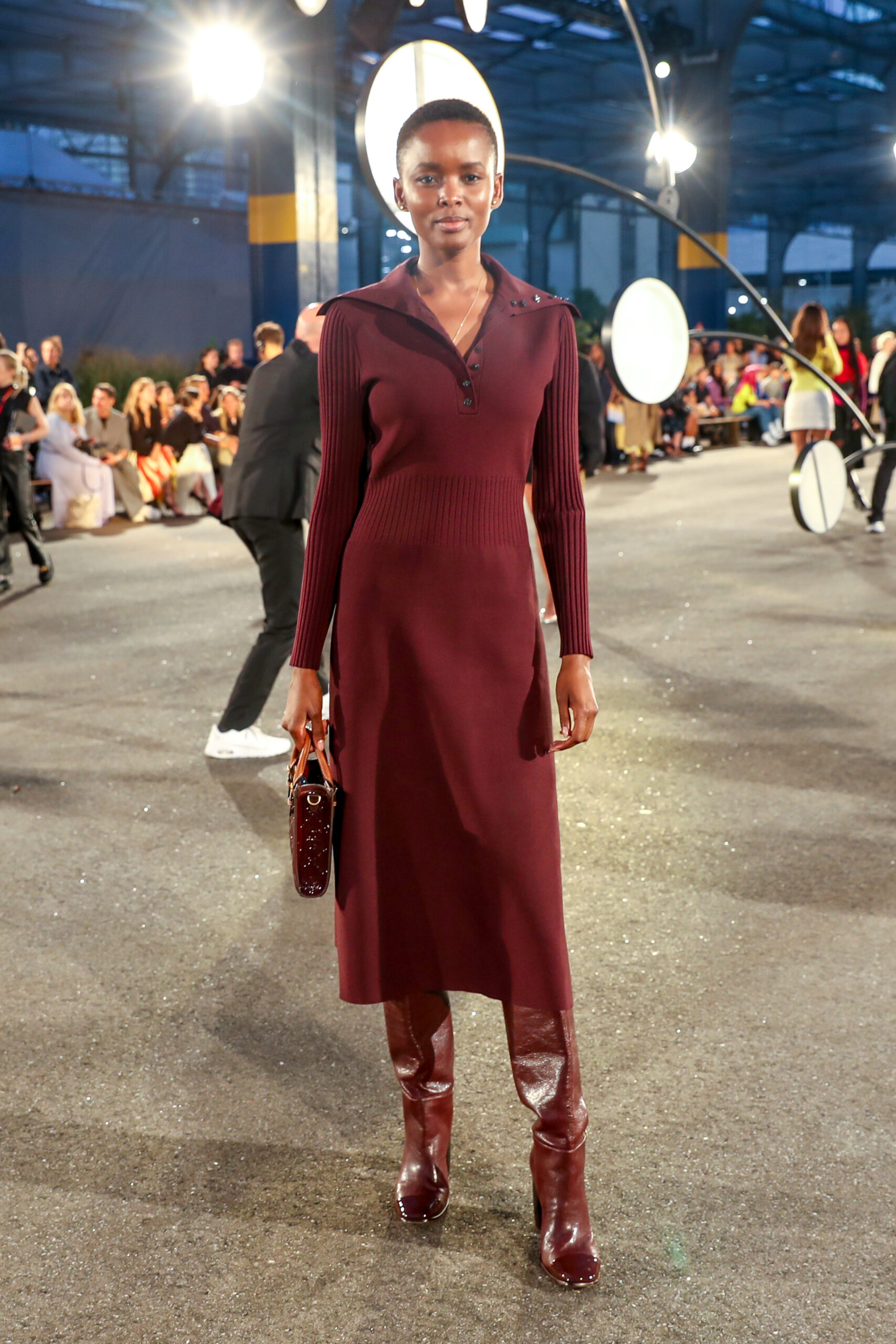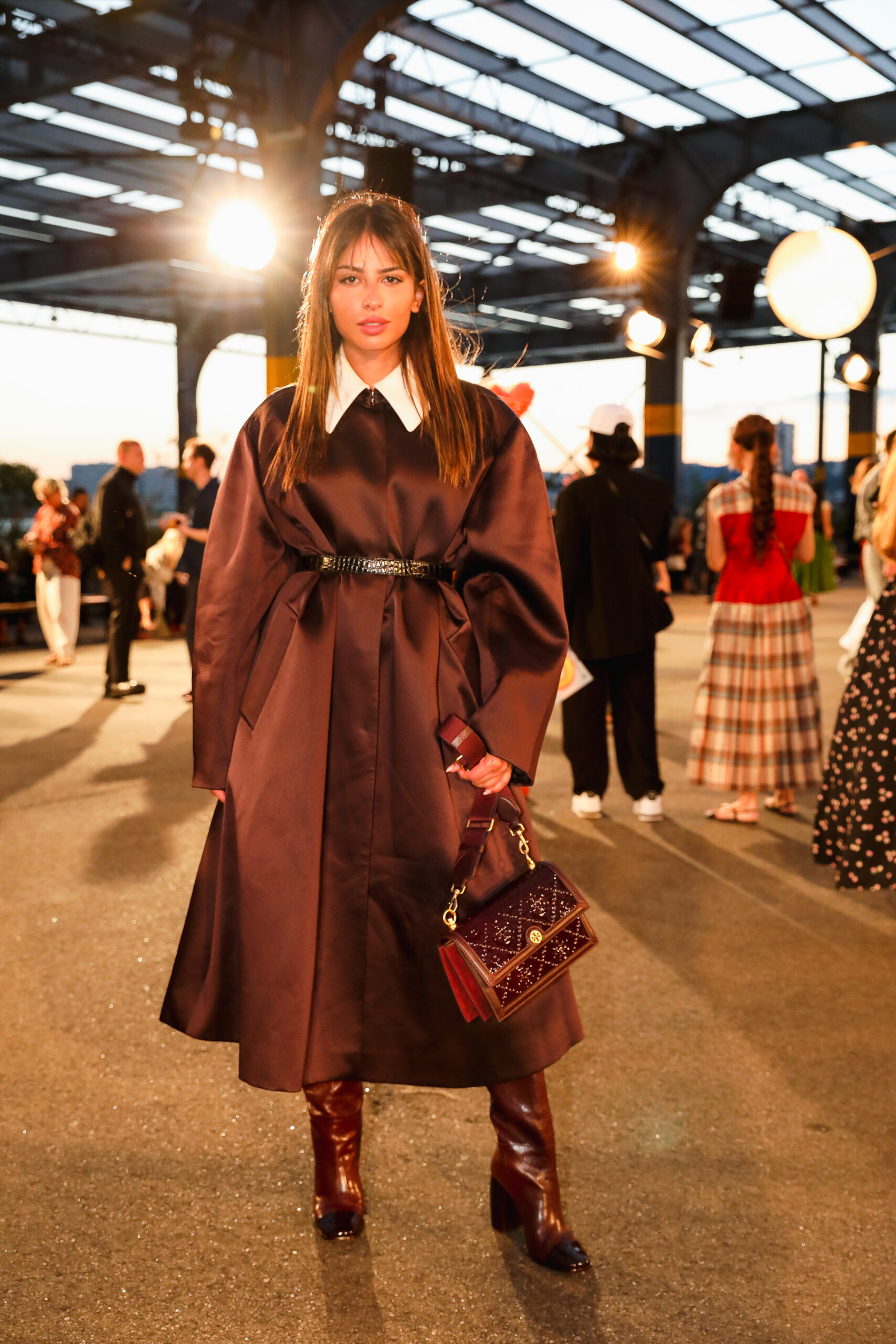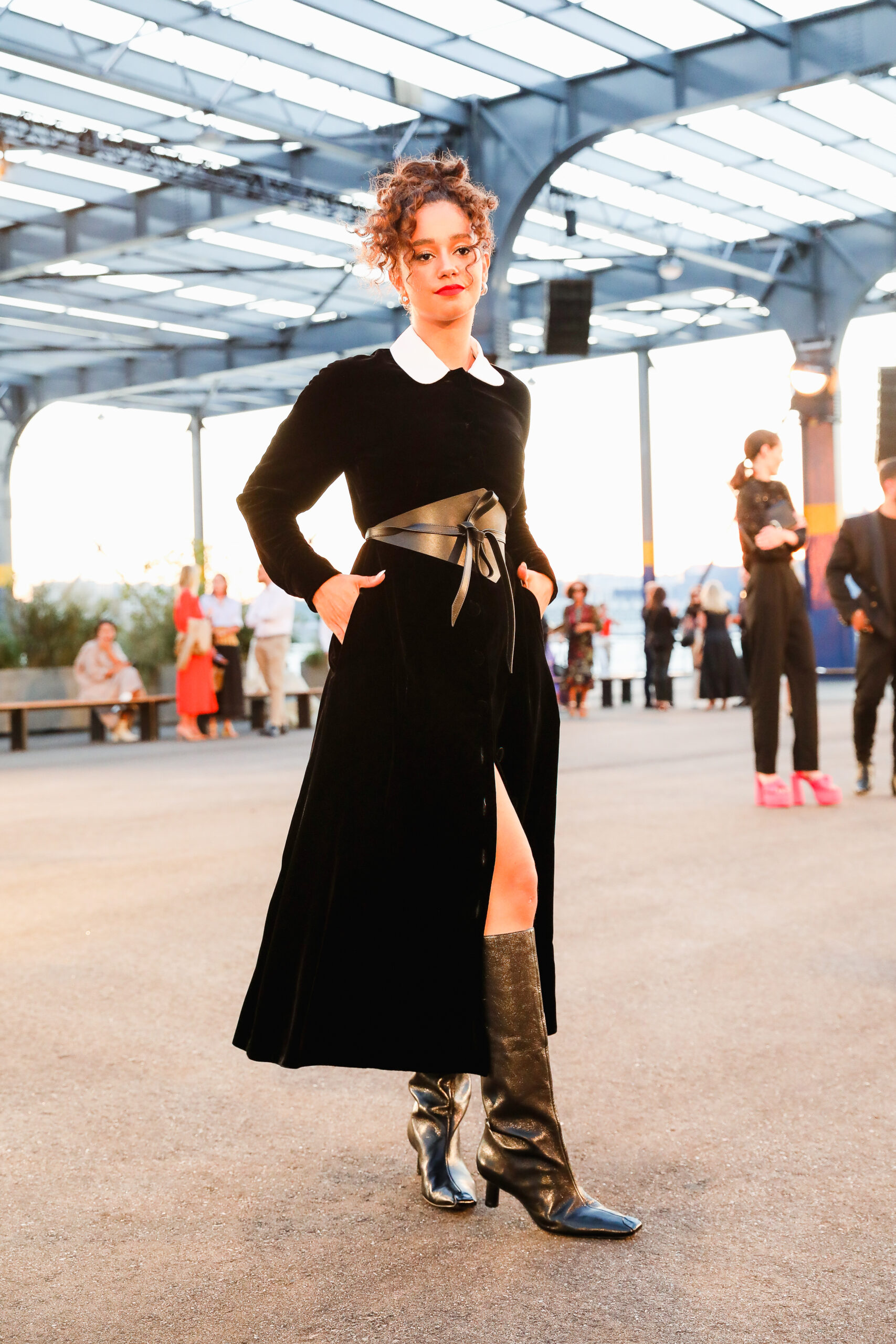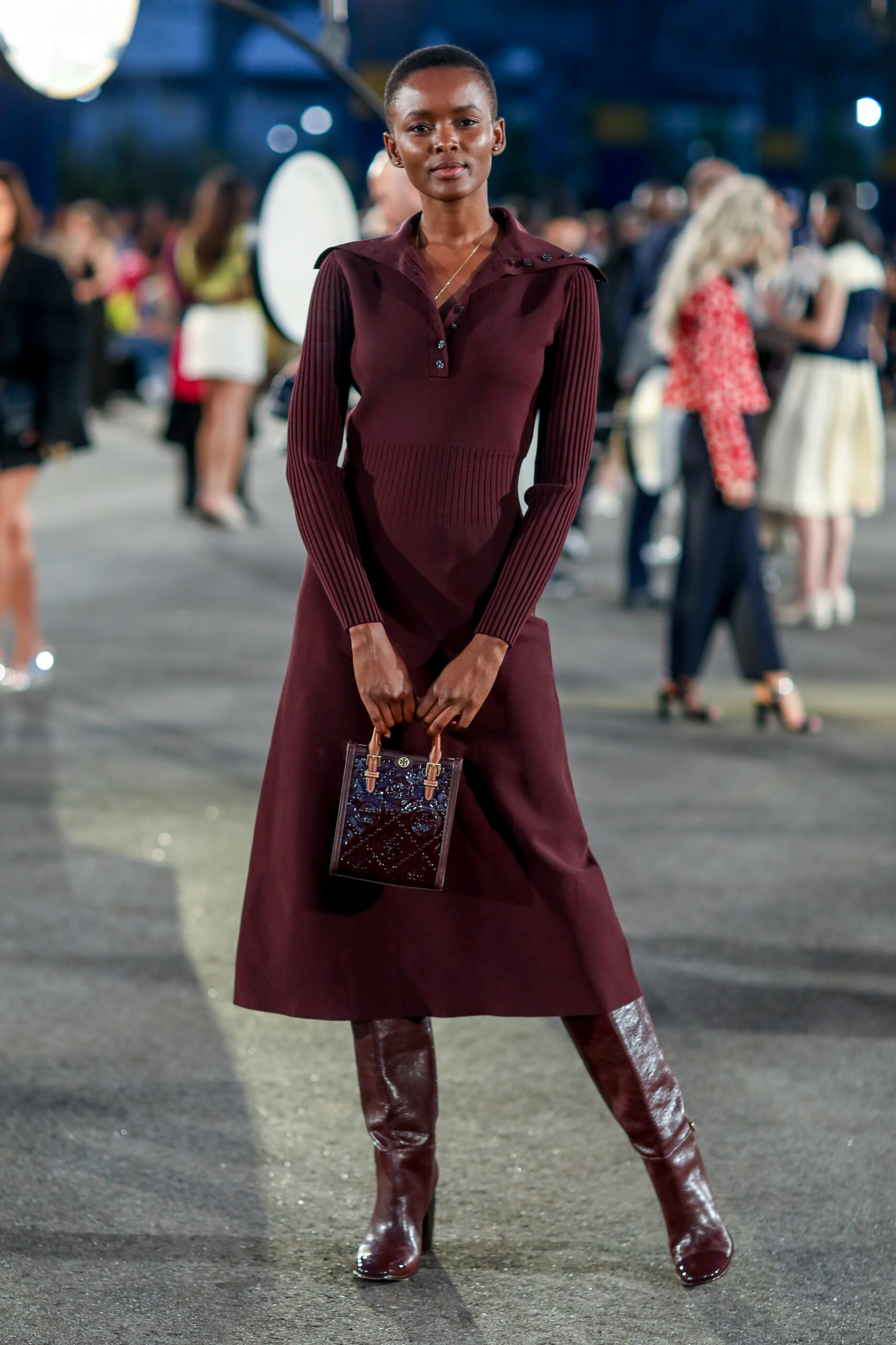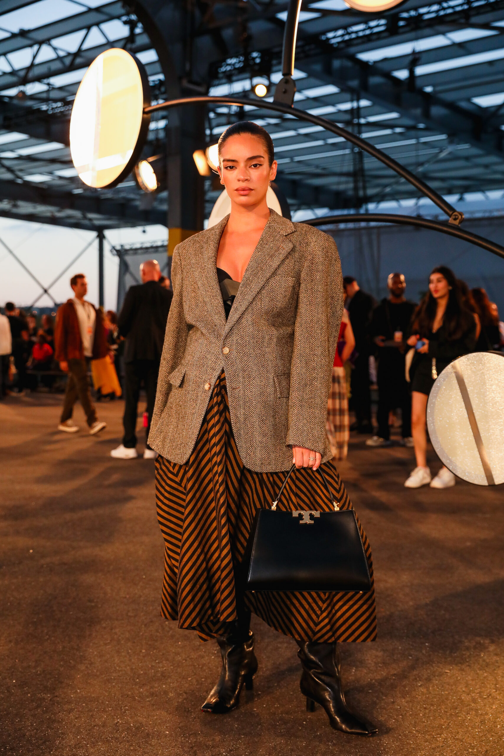 • Lena Mahfouf portant le look AH22 17, la robe-chemise en velours à col rond et la ceinture en diamant, les bottes au genou Tubo et le mini sac Crescent T Monogram Haircalf.
