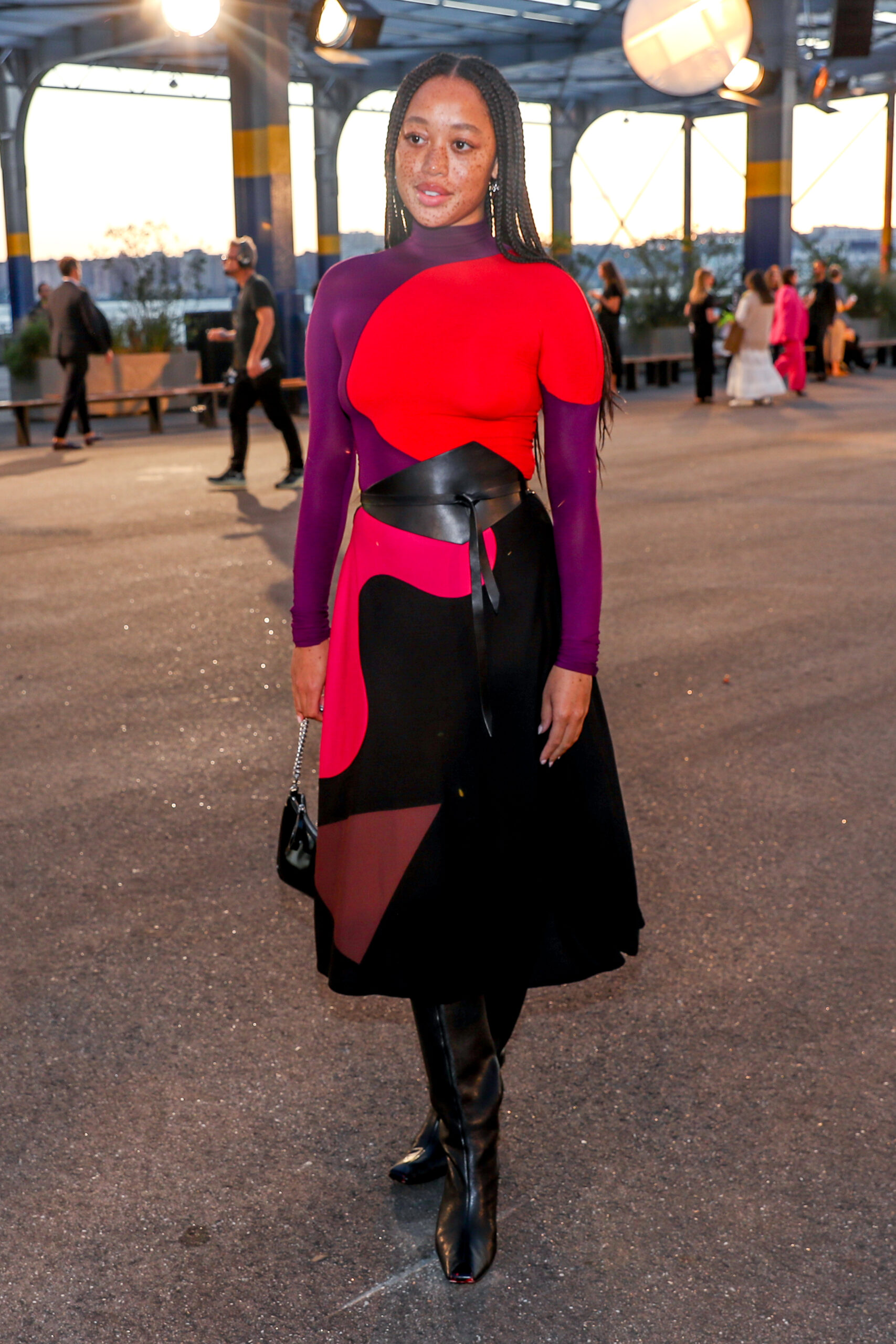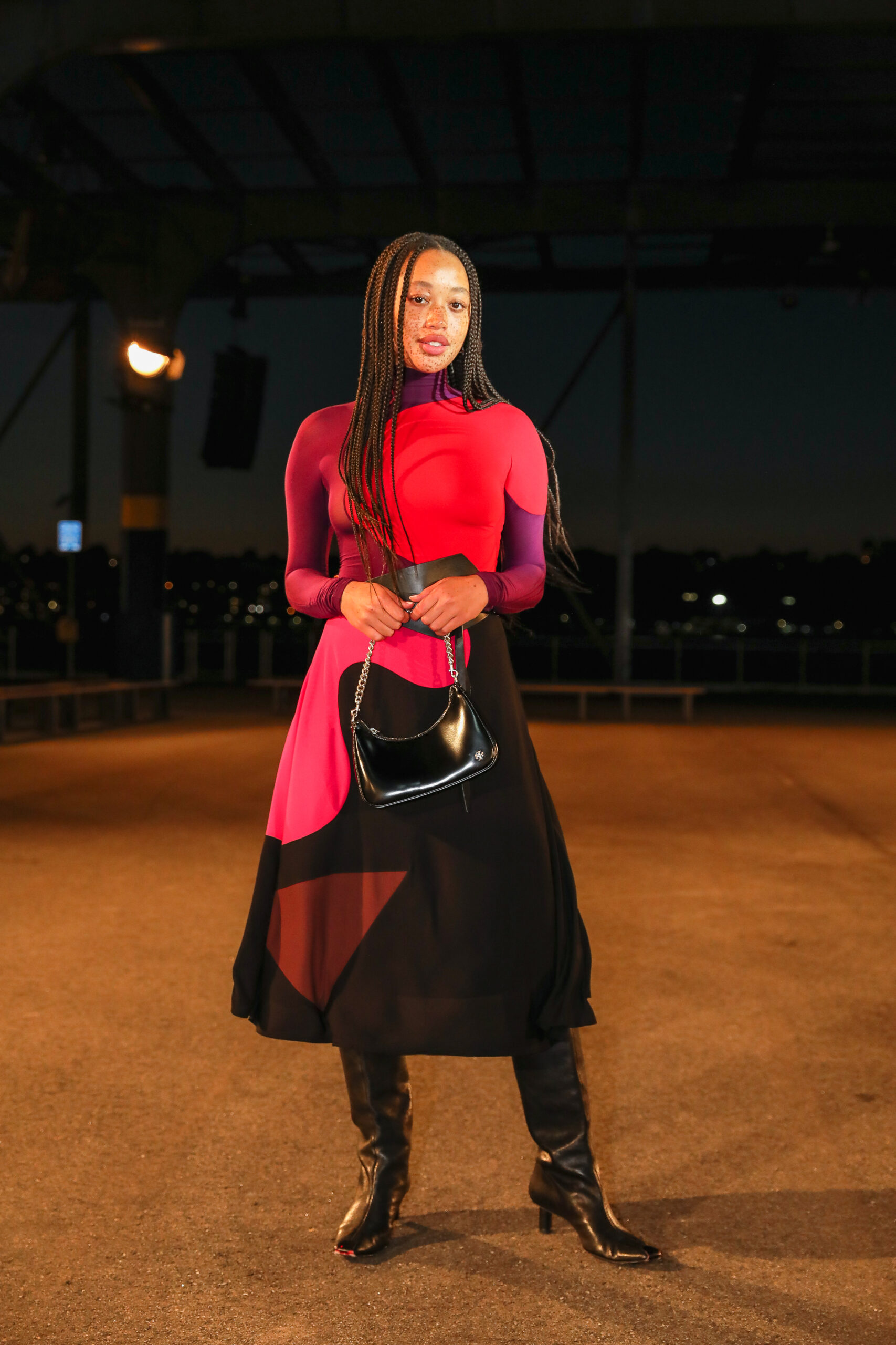 • Salem Mitchell portant le look AH22 29, le haut en jersey à manches longues colorblock, la jupe en tricot et la ceinture en diamant, les bottes au genou Tubo, le petit sac à bandoulière Mercer Spazzolato et la boucle d’oreille Eleanor Hoop.