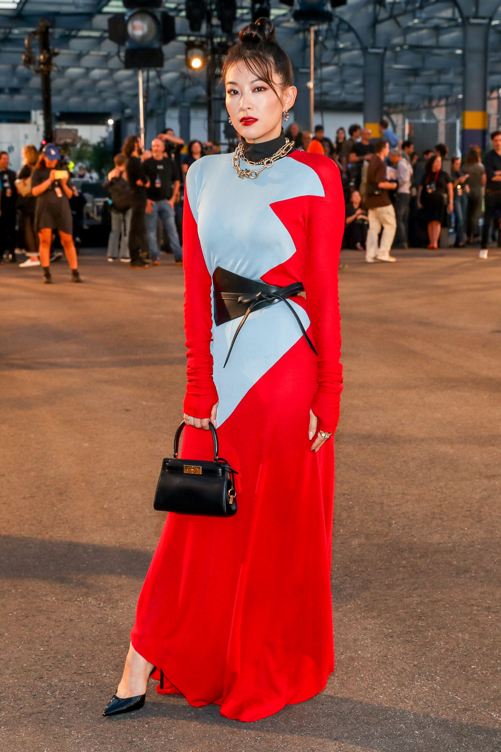 • Arden Cho portant le look AH22 31, la robe en jersey nid d’abeille colorblock, le haut en jersey à manches longues, la ceinture en diamant, le sac Petite Lee Radziwill, le collier Roxanne Chain Beaded Rope, la boucle d’oreille cachée Roxanne, la petite bague Roxanne et la bague Miller Stud.