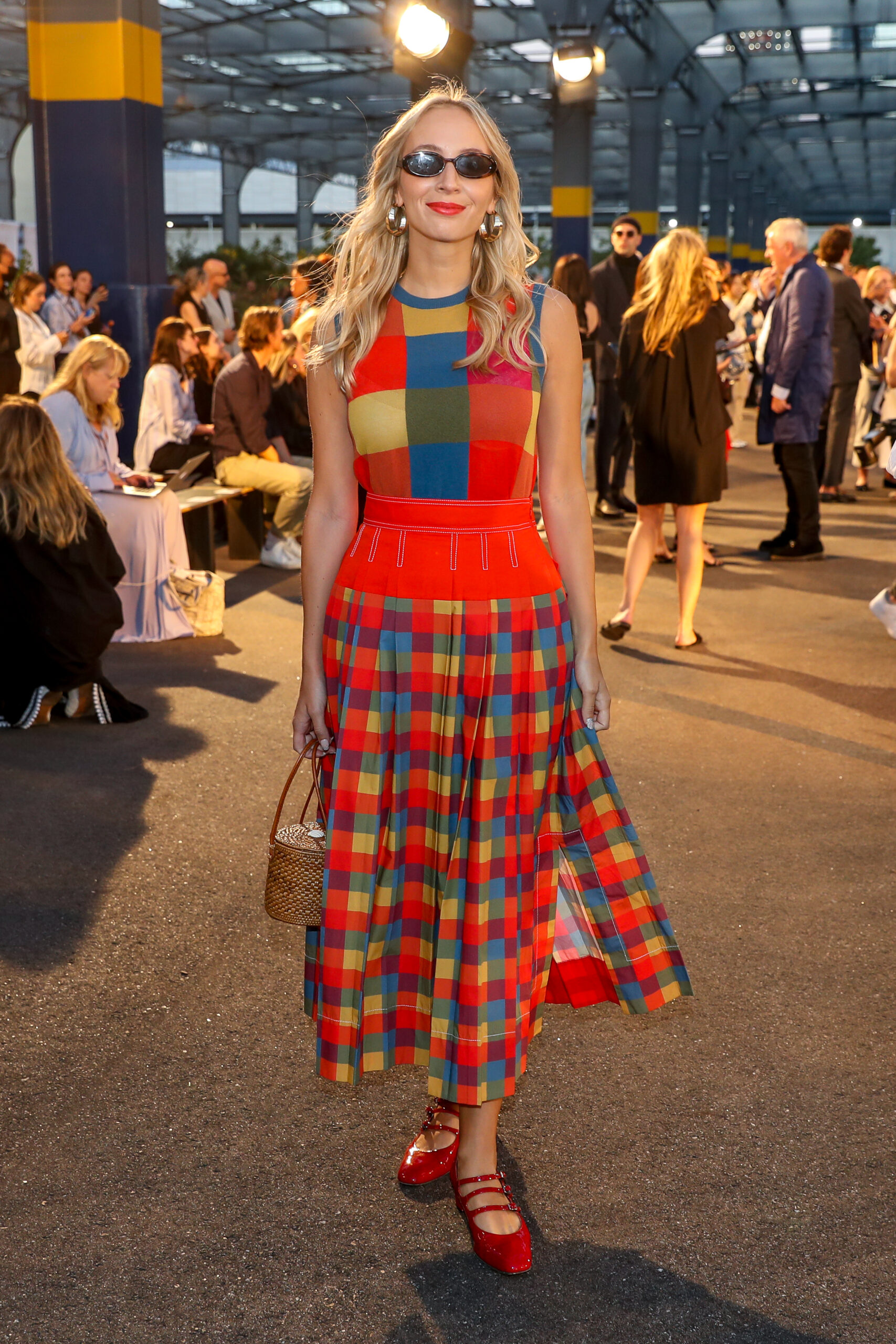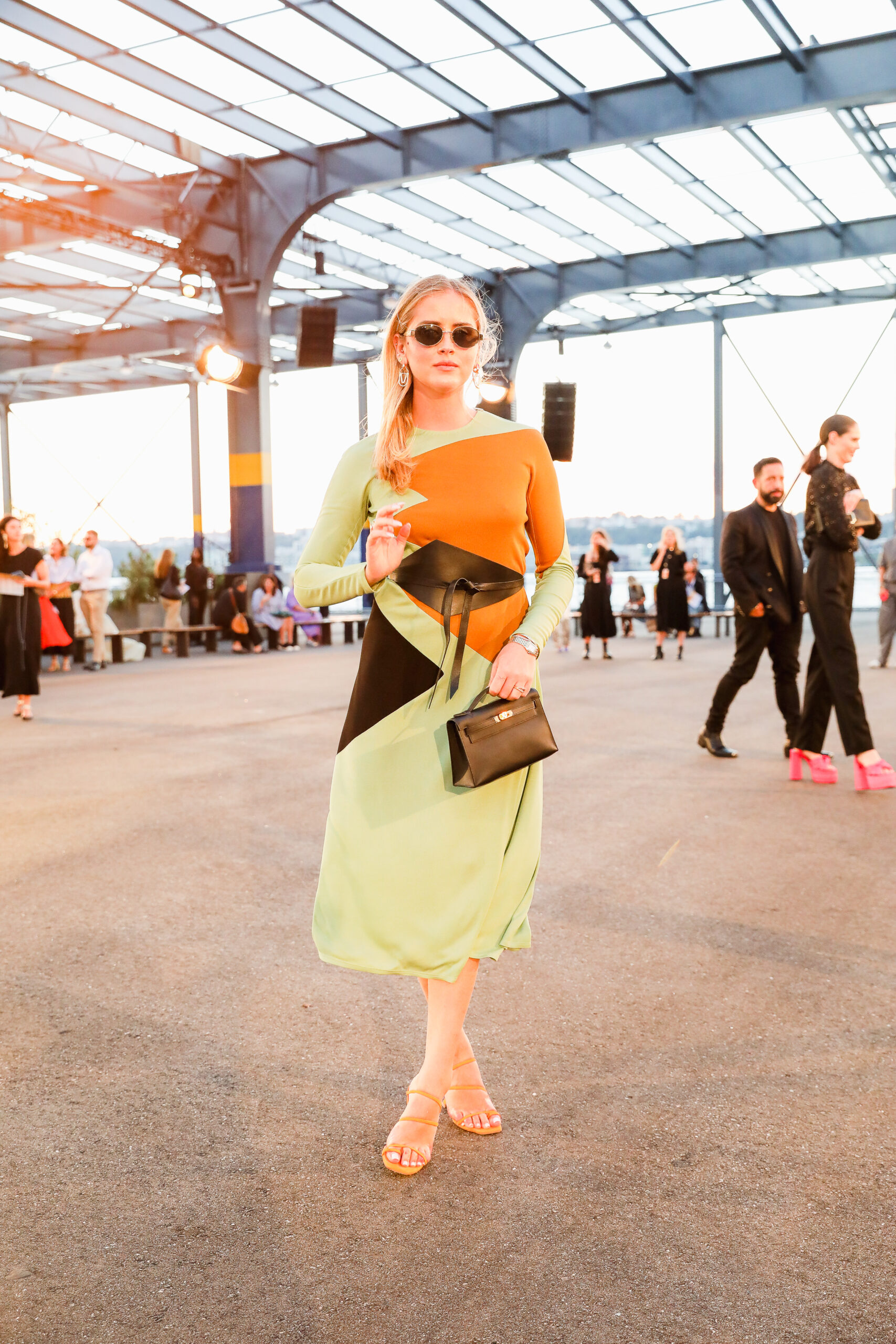 • Sydney Carlson portant le look FW22 33, la robe colorblock à paillettes, la chaussure Slingback et le petit sac à rabat Kira Ruched.