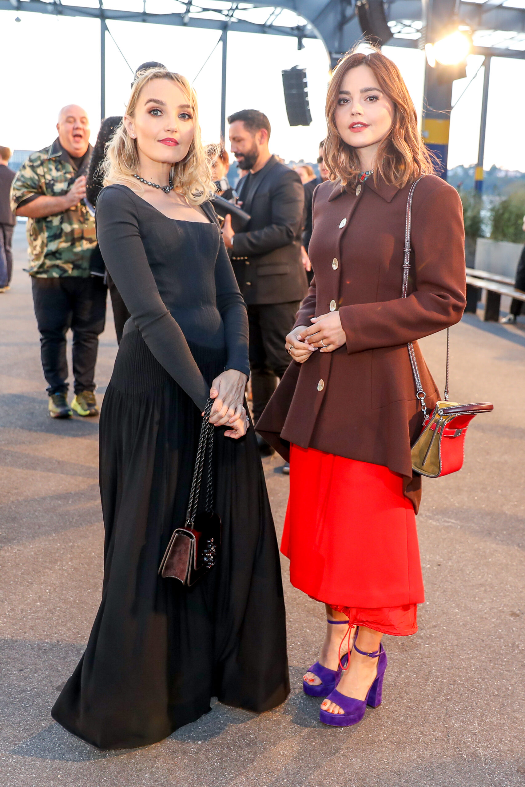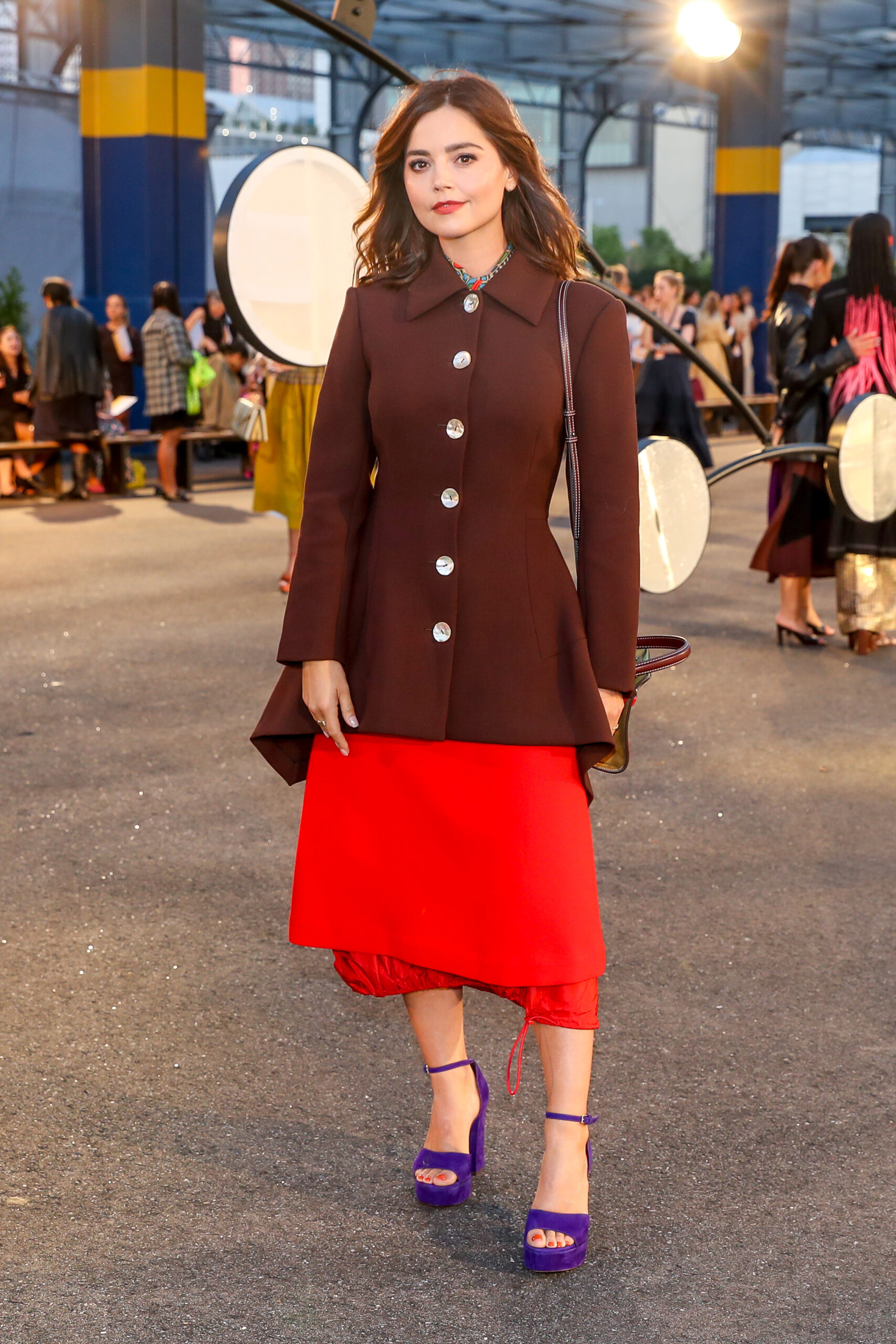 • Jenna Coleman portant RE23 Look 1, le manteau et la jupe en laine à double face, la sandale à plateforme et le sac double à galets Petite Lee Radziwill.