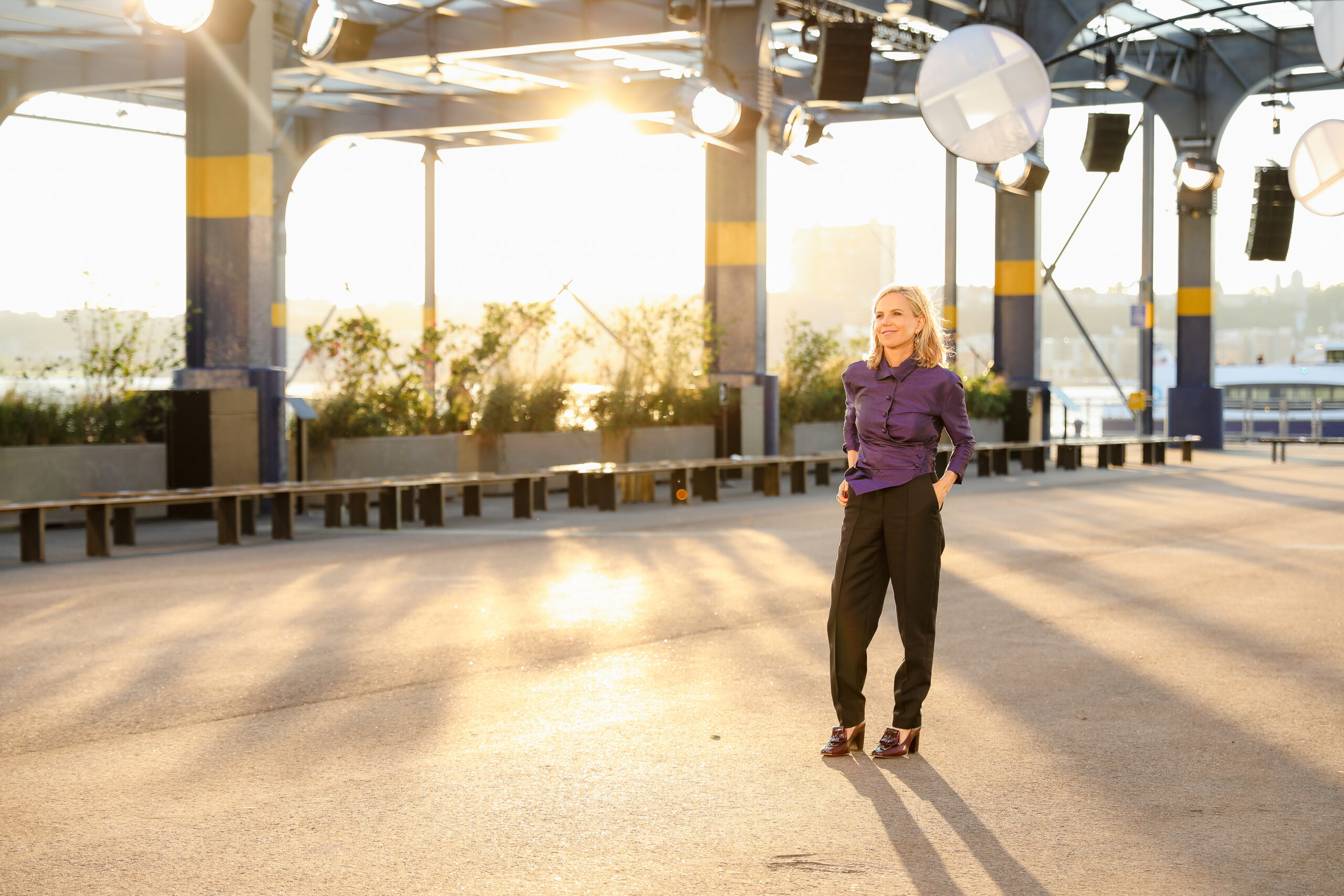• Madeleine Arthur portant la chemise en crêpe extensible et la minijupe matelassée Tory Sport, la mule Woven Double T, le sac compensé McGraw Spazzolato et la boucle d’oreille Miller Pave Hoop.