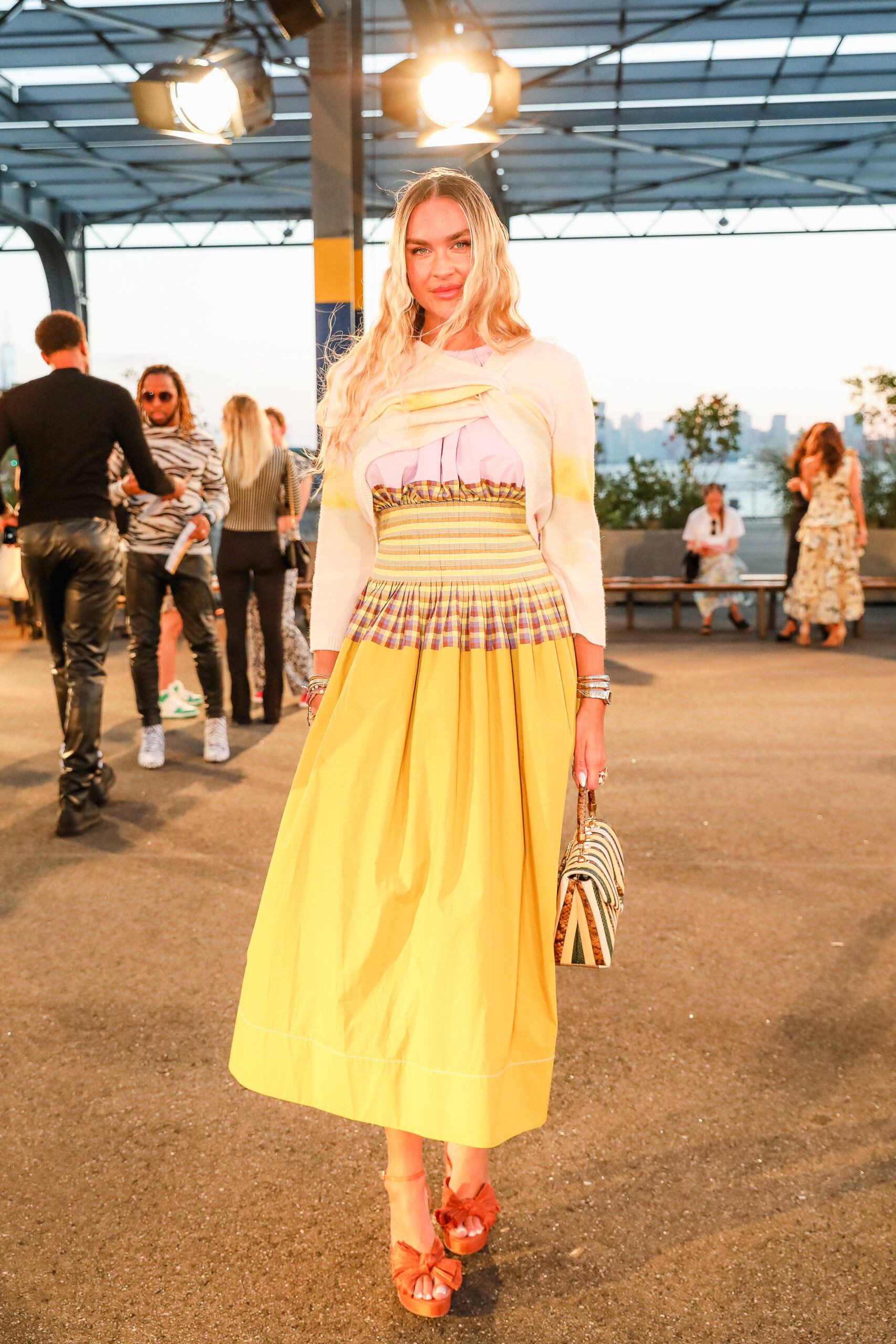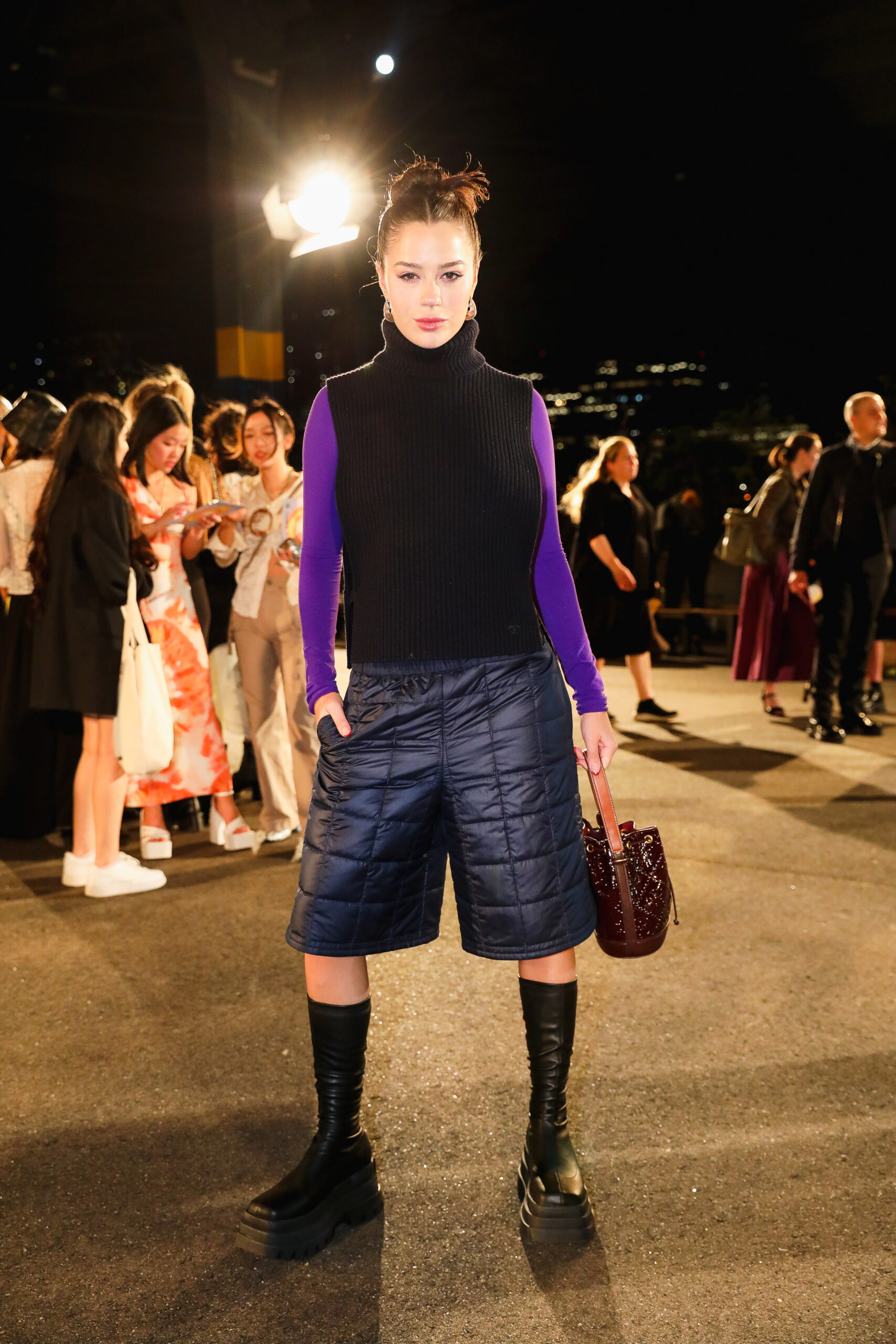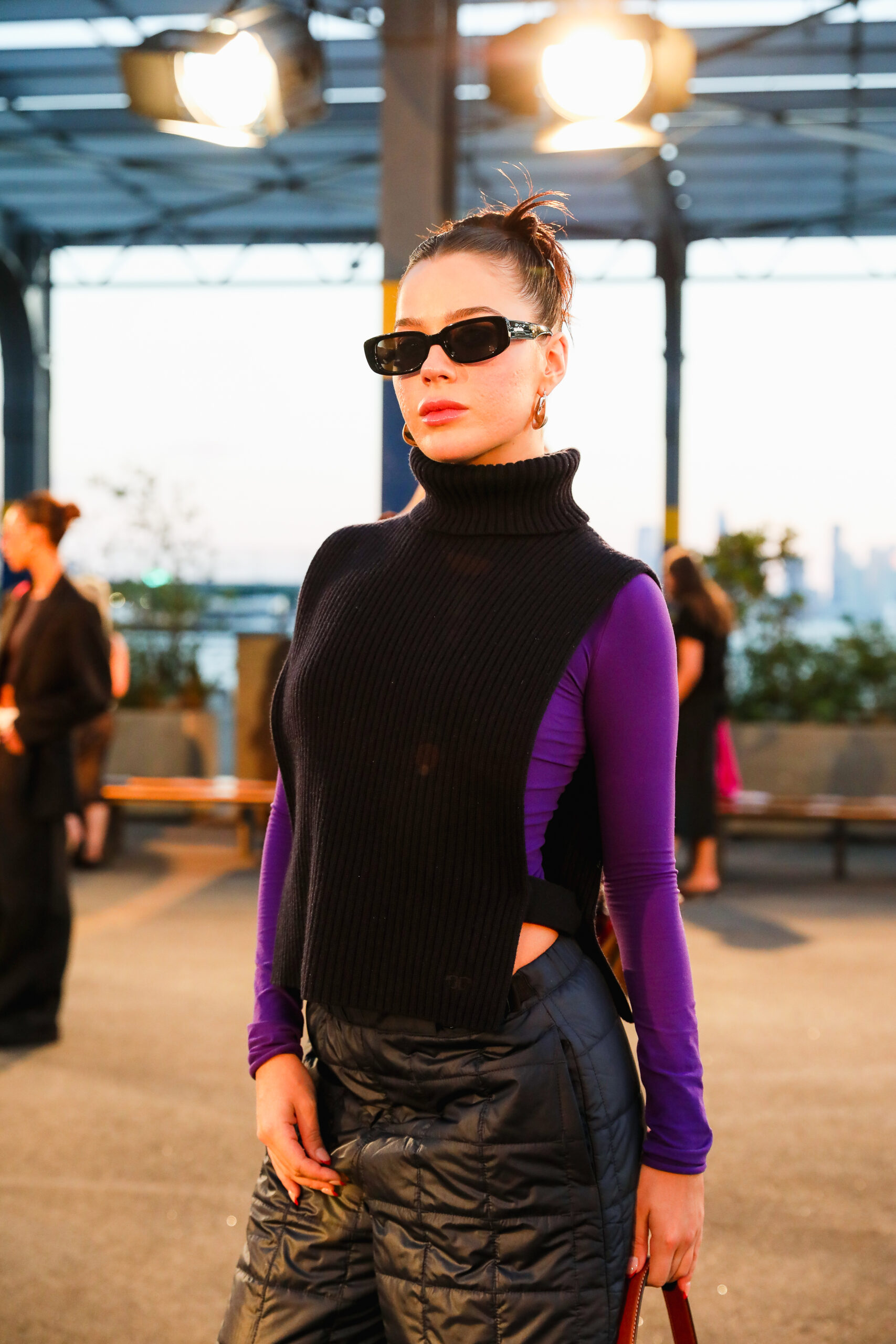 • Devon Lee Carlson portant le col roulé sans couture Tory Sport et la minijupe matelassée, la mule en peau de mouton Block T, le mini sac Crescent To Monogram Fil Coupe et la boucle d’oreille cachée Roxanne.