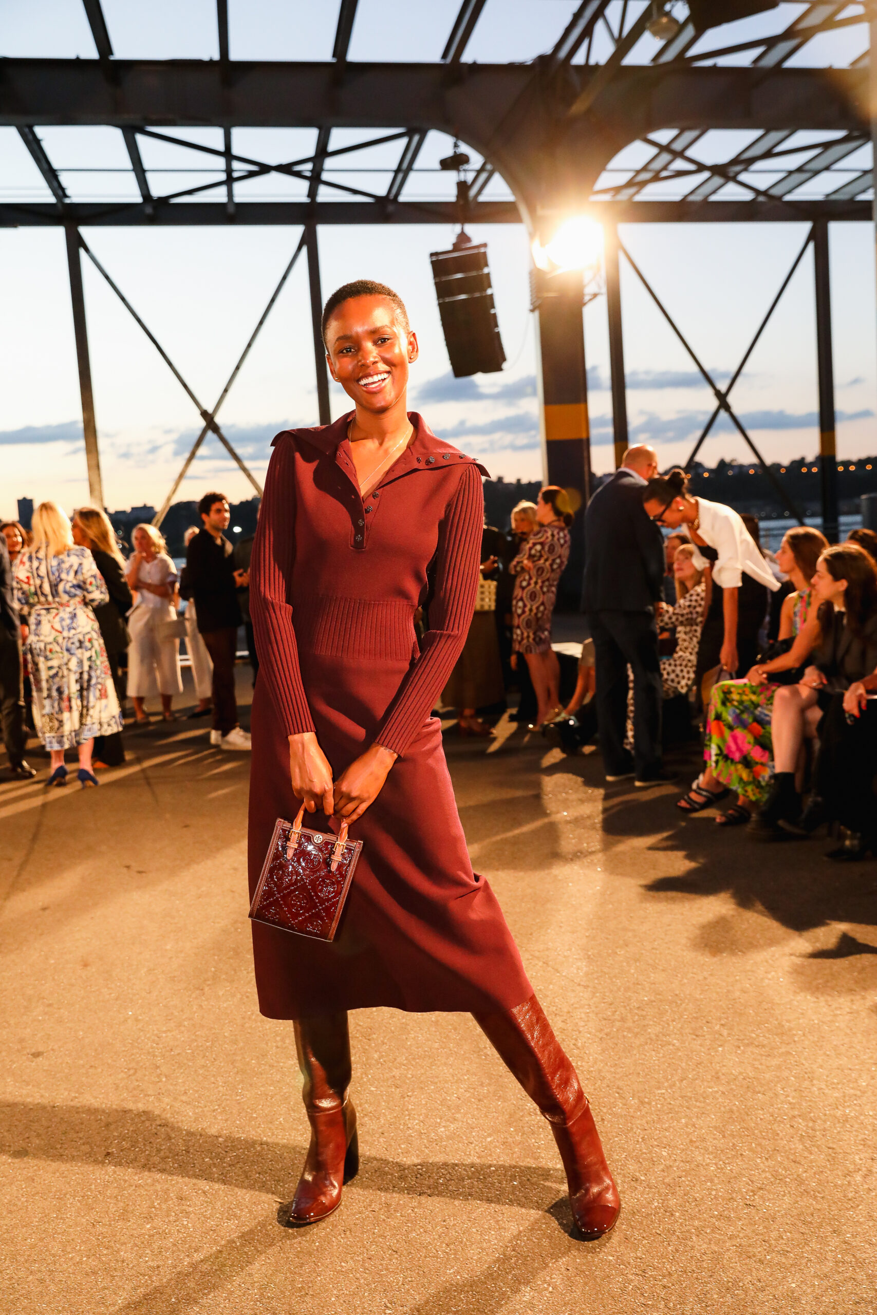 • Xenia Adonts porte le pull à épaules dénudées FW22, un pantalon en sergé de laine, une ceinture diamant, une botte au genou Tubo et un sac Double Lee Radziwill Pebbled.
