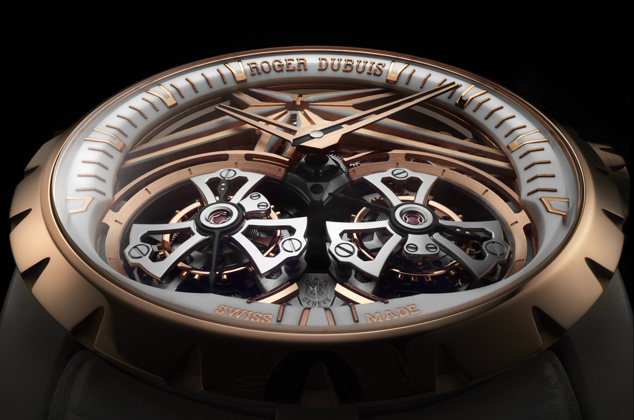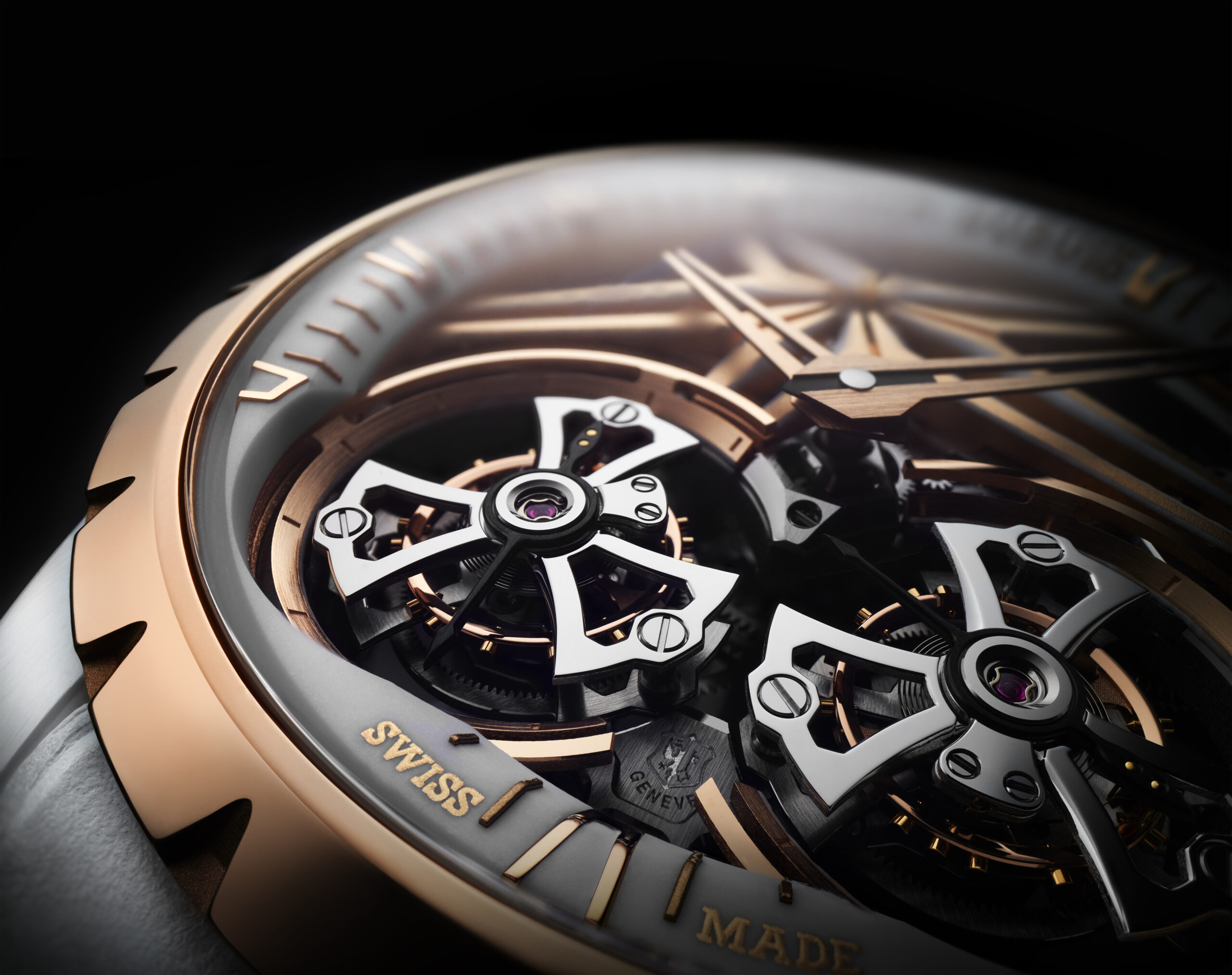 Retravaillé il y a peu avec un savoir-faire artisanal rare, le calibre RD108 est un chef-d’œuvre de technicité et d’élégance contemporaine. Entièrement fabriqué dans la Manufacture de Roger Dubuis, ce mouvement iconique est composé de deux tourbillons reliés par un différentiel qui augmente la précision tout en optimisant la transmission de l’énergie. Avec sa cage inférieure de tourbillon en titane – matière deux fois plus légère que l’acier inoxydable –, le poids de la montre est réduit à un niveau optimal. Chaque détail est considéré avec la plus grande attention comme en témoigne la matière antimagnétique utilisée au cœur du tourbillon, pour un service et une expérience toujours plus haut de gamme. Ces choix techniques ont permis une augmentation radicale de la réserve de marche qui atteint désormais 72 heures, et offre à son possesseur la liberté de ne pas porter sa montre le week-end sans avoir à se soucier de la régler le lundi matin.