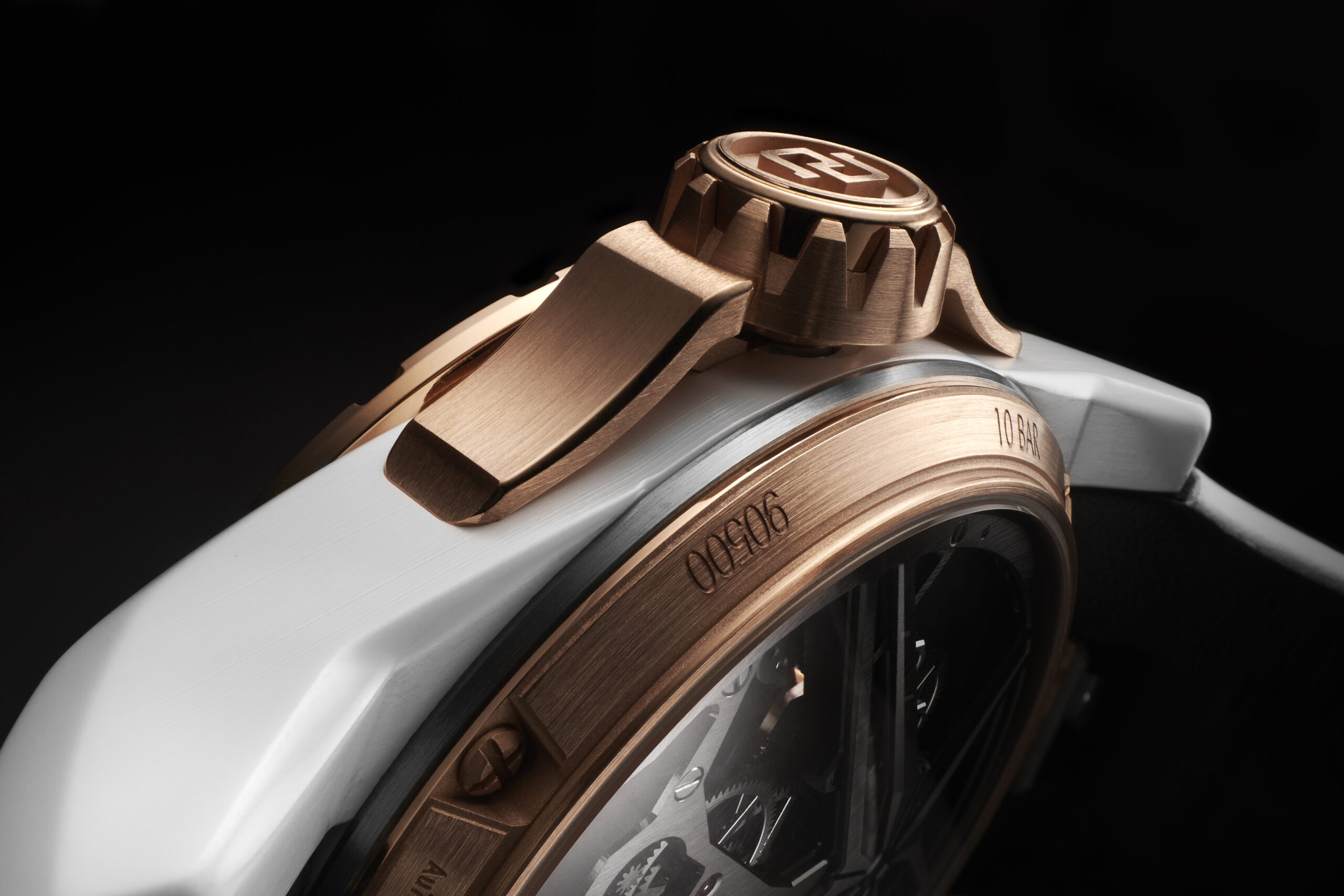 Les lignes modernes et expressives de l’iconique Excalibur Double Tourbillon sont exaltées par différents partis pris esthétiques. Dans l’optique de créer un garde-temps résolument unique et sophistiqué, la céramique blanche lumineuse de la boîte est associée au précieux EON GOLD TM qui orne la lunette, la couronne et le fond de boîte. L’étoile signature est rehaussée d’un placage or rose, tout comme les index horaires directement appliqués sur le rehaut en fibre de minéral composite (MCF) blanche. La boîte blanche raffinée a, quant à elle, trouvé son accord parfait : un bracelet en cuir de veau embossé blanc, doté du système d’attache rapide – QRS breveté, pour une personnalisation absolue.
