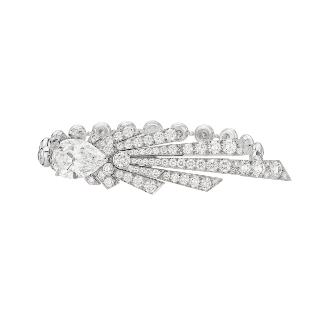 Parmi les diamants ronds, un saphir ovale au bleu profond et puissant d’un poids exceptionnel de 55,55 carats et un diamant poire D FL de 8,05 carats Type IIa rayonnent d’un éclat extraordinaire. Une pièce transformable dont les halos se détachent pour devenir des broches, tout comme la ligne centrale de diamants qui devient bracelet, transformant alors le collier en une version courte.