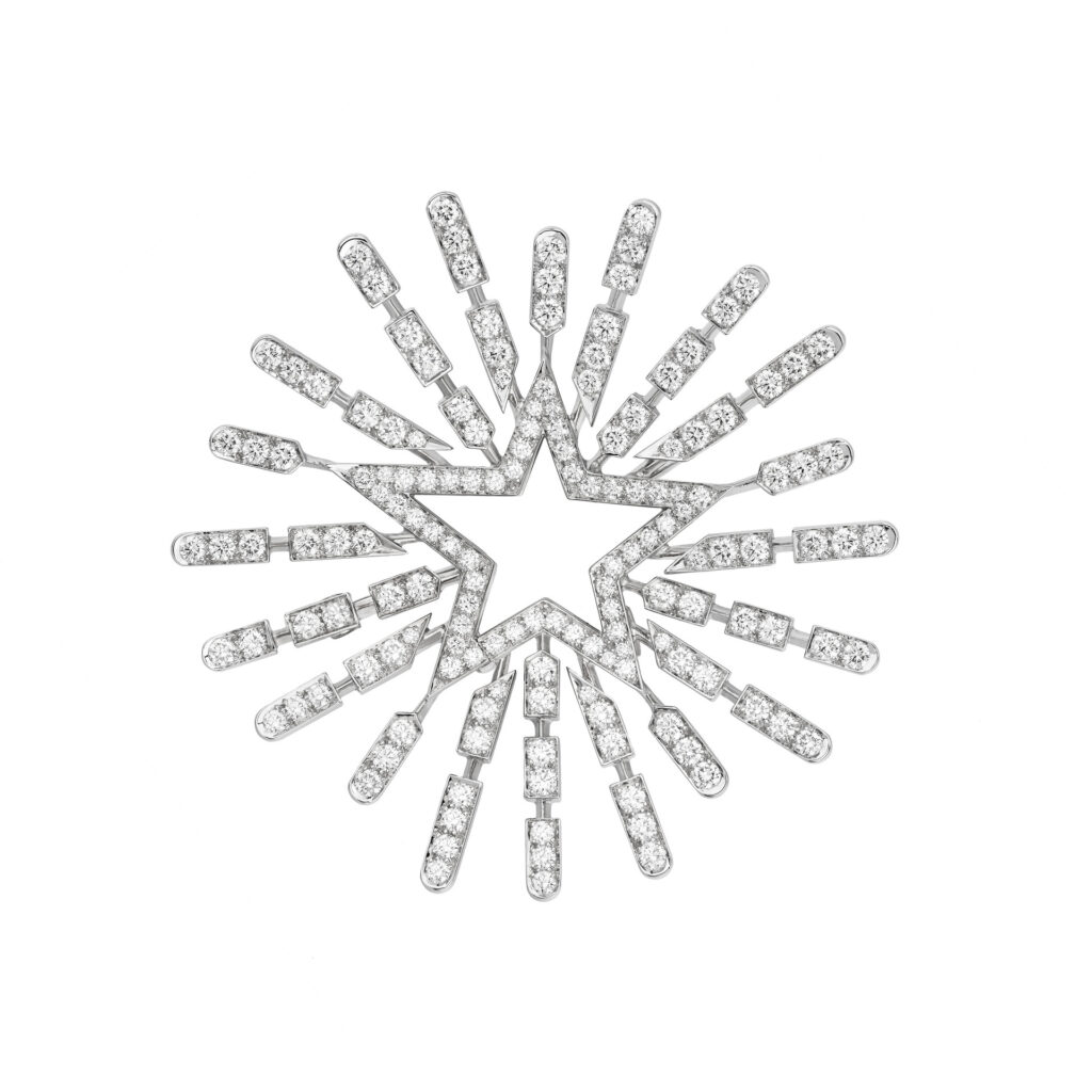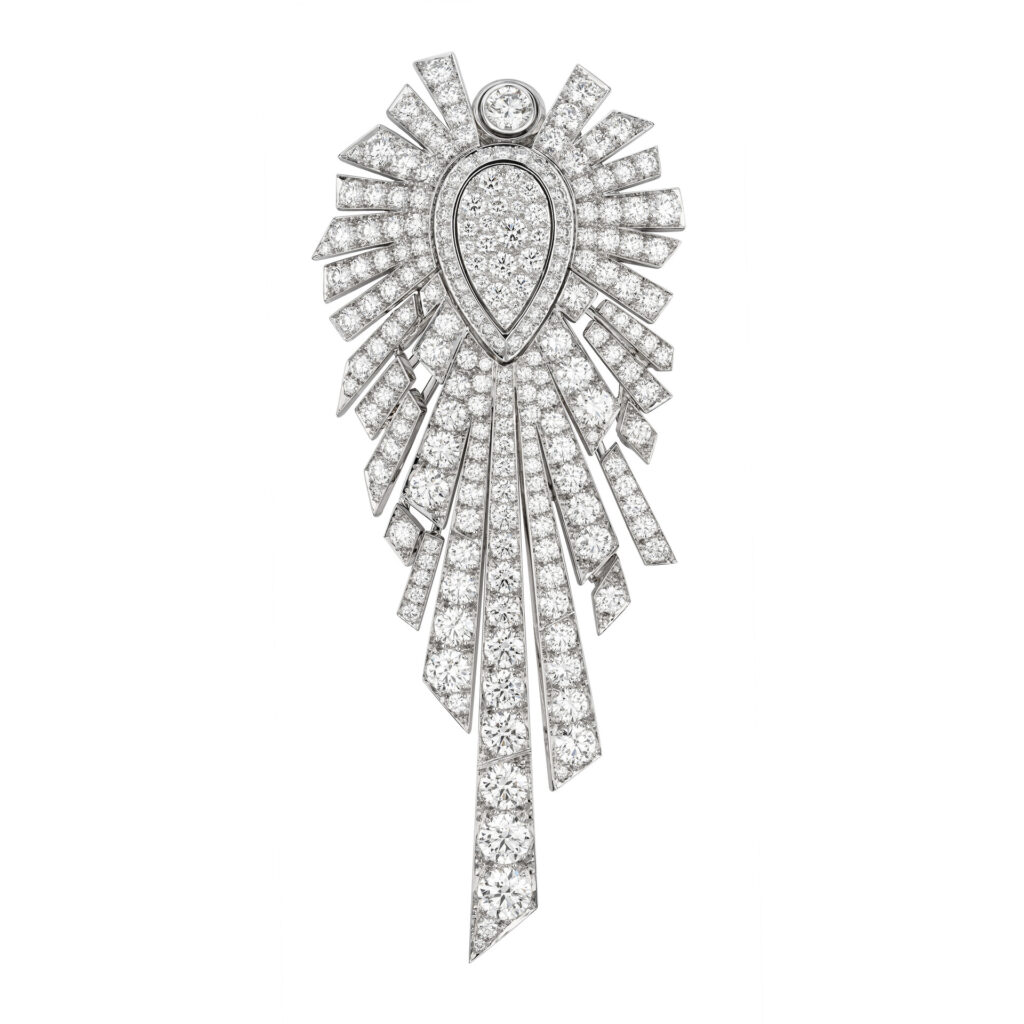 Avec un diamant rond en son cœur, la comète de la broche colossale se détache de son météore serti d’un diamant poire, qui devient alors un bracelet.