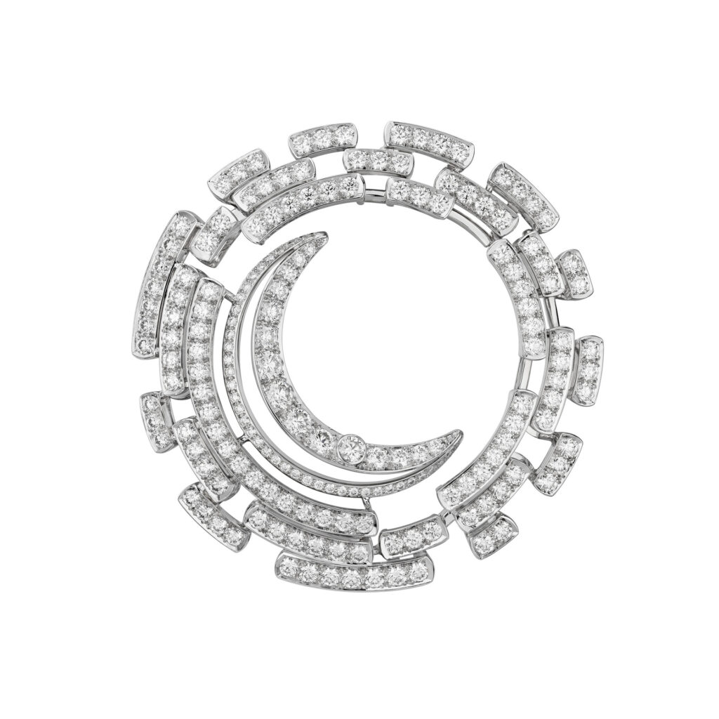 Ou cette broche, fusion du jour et de la nuit, où le soleil embrase une lune et son diamant marquise D FL Type Ila de 6.18 carats. Les pièces de la parure « Lune Étincelante » célèbrent la lumière unique de l’astre.