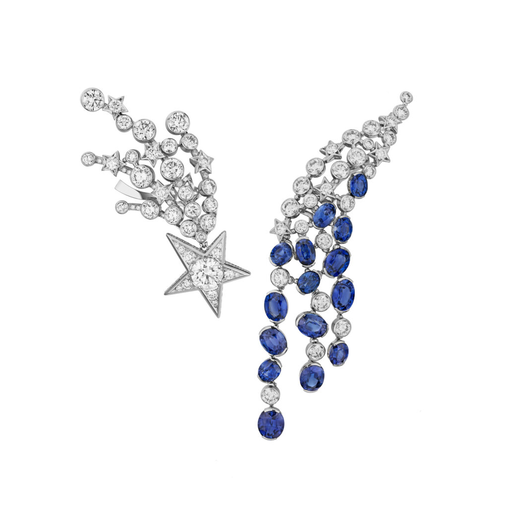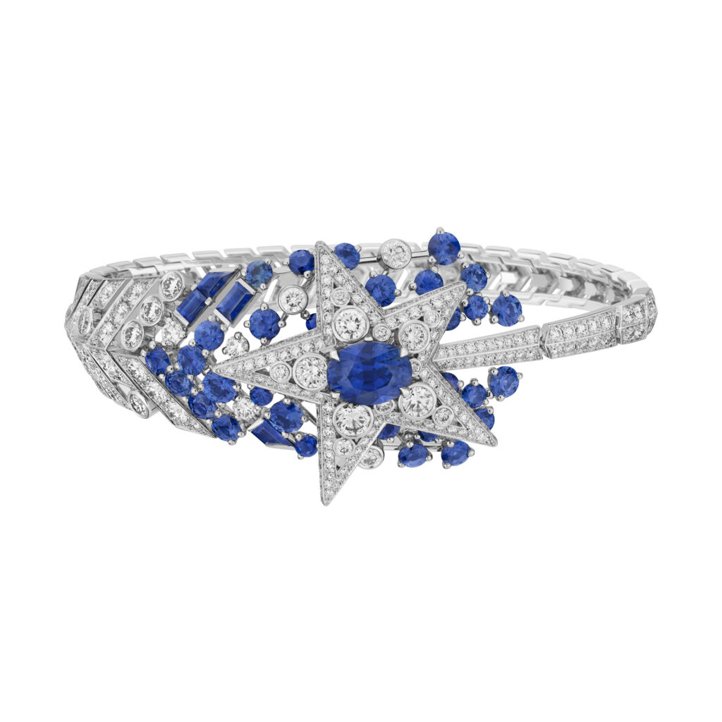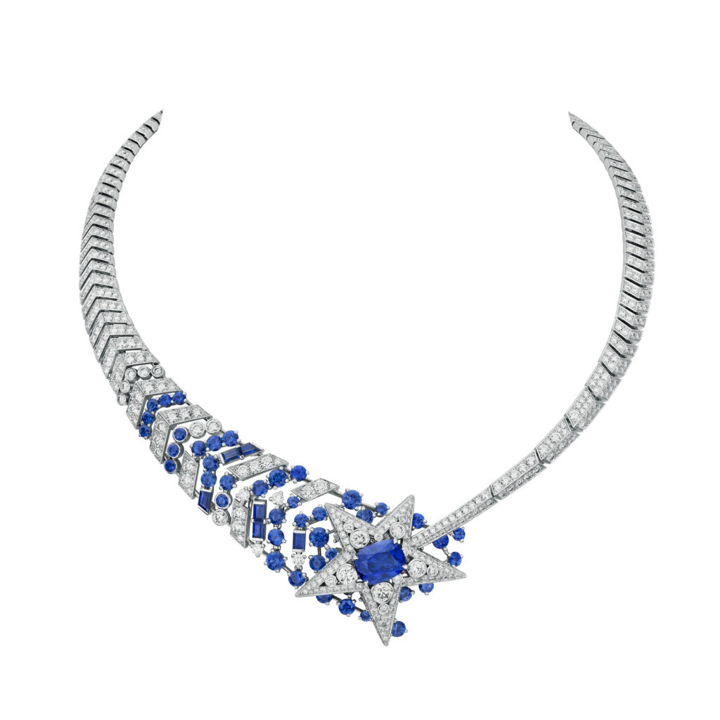 Le collier, le bracelet, les deux paires de boucles d’oreilles et la bague « Comète Saphir » donnent à la peau l’éclat de la voie lactée dans une pluie de diamants ronds, de chevrons et de saphirs à l’extrême pureté.