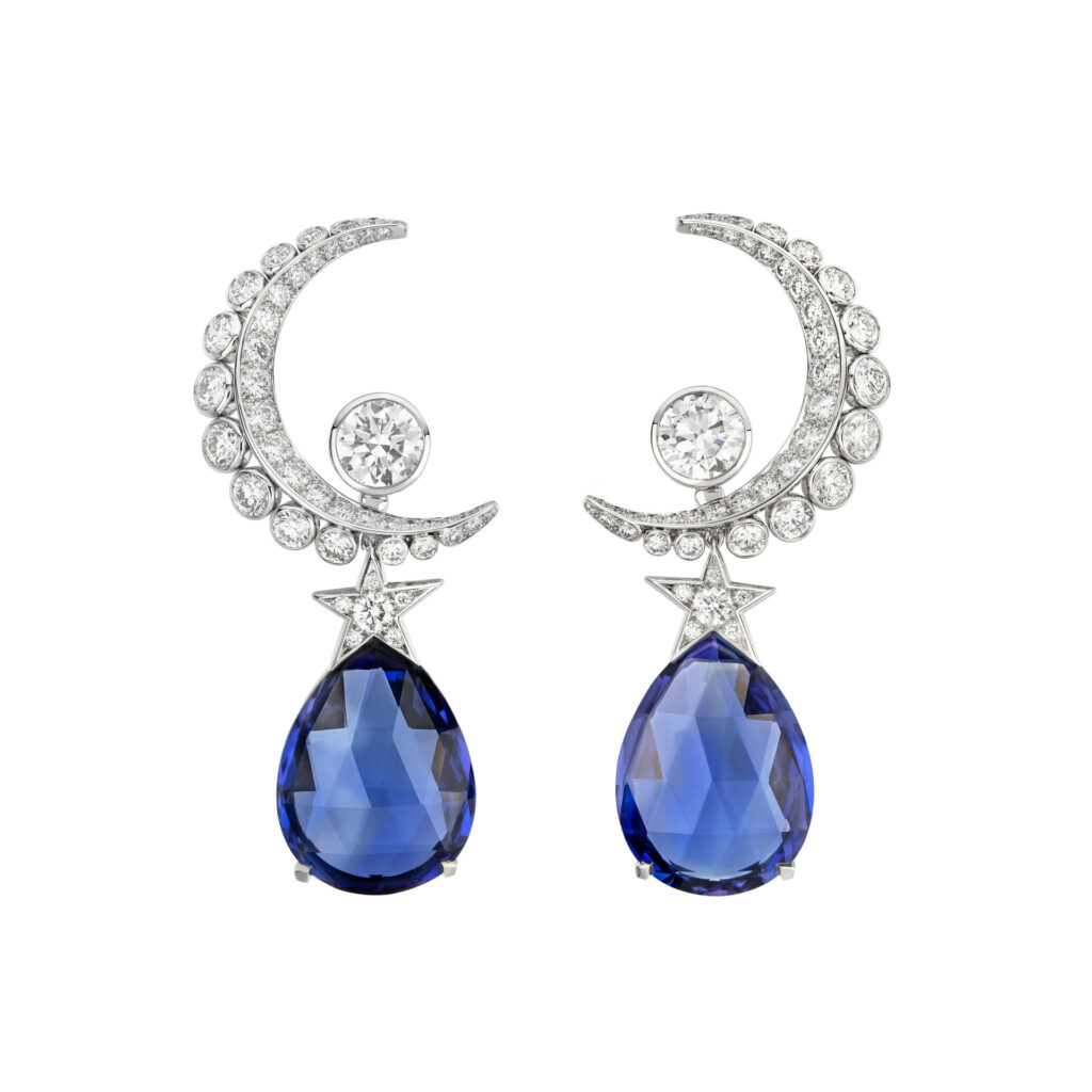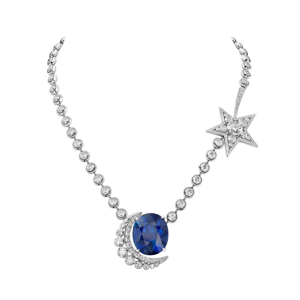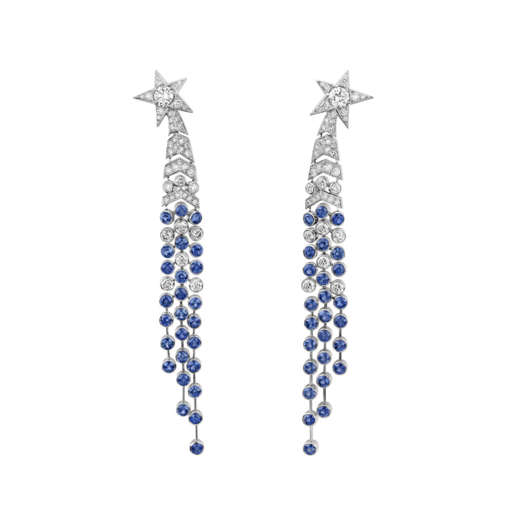 Le collier, le bracelet, les deux paires de boucles d’oreilles et la bague « Comète Saphir » donnent à la peau l’éclat de la voie lactée dans une pluie de diamants ronds, de chevrons et de saphirs à l’extrême pureté.